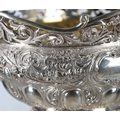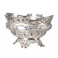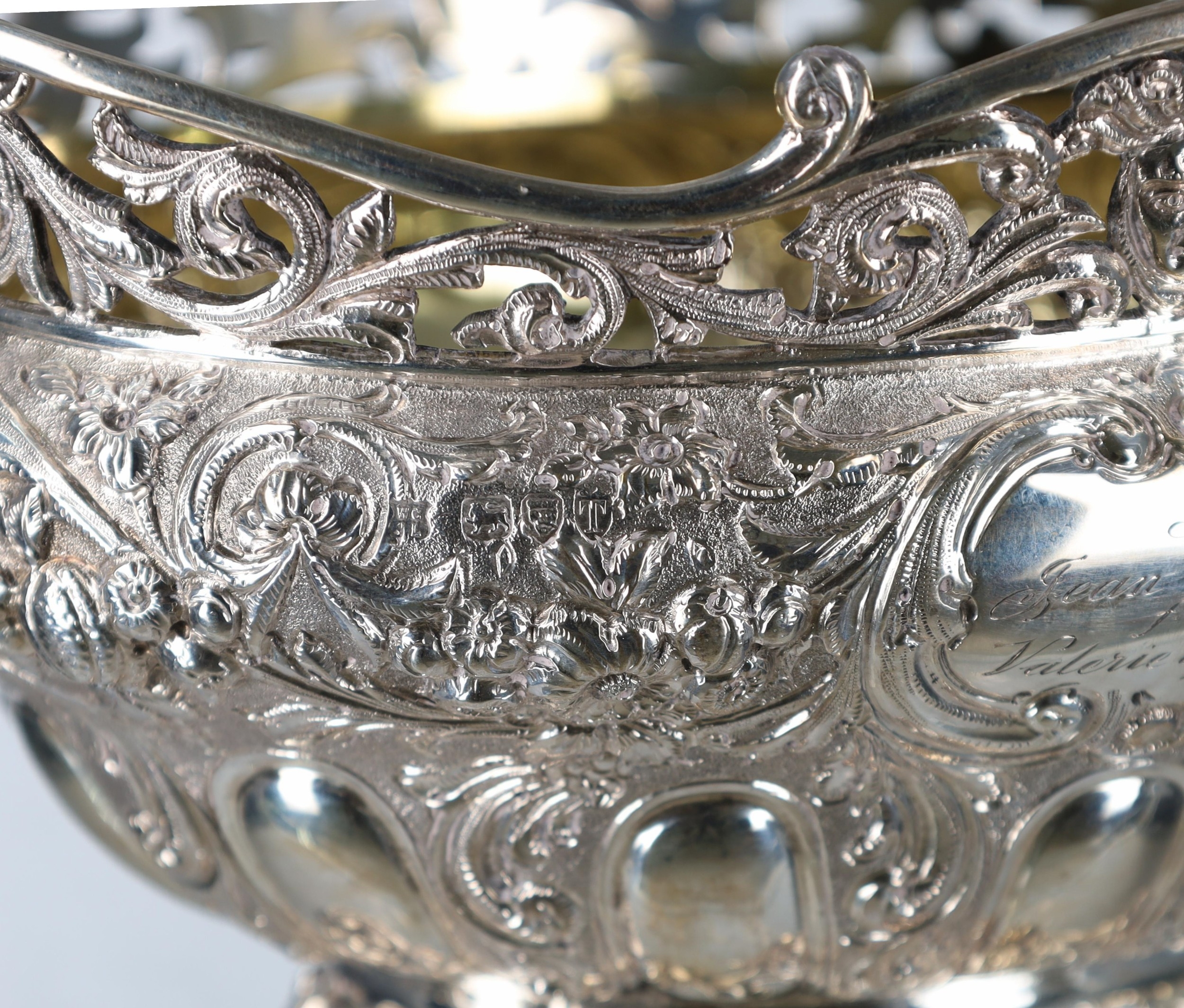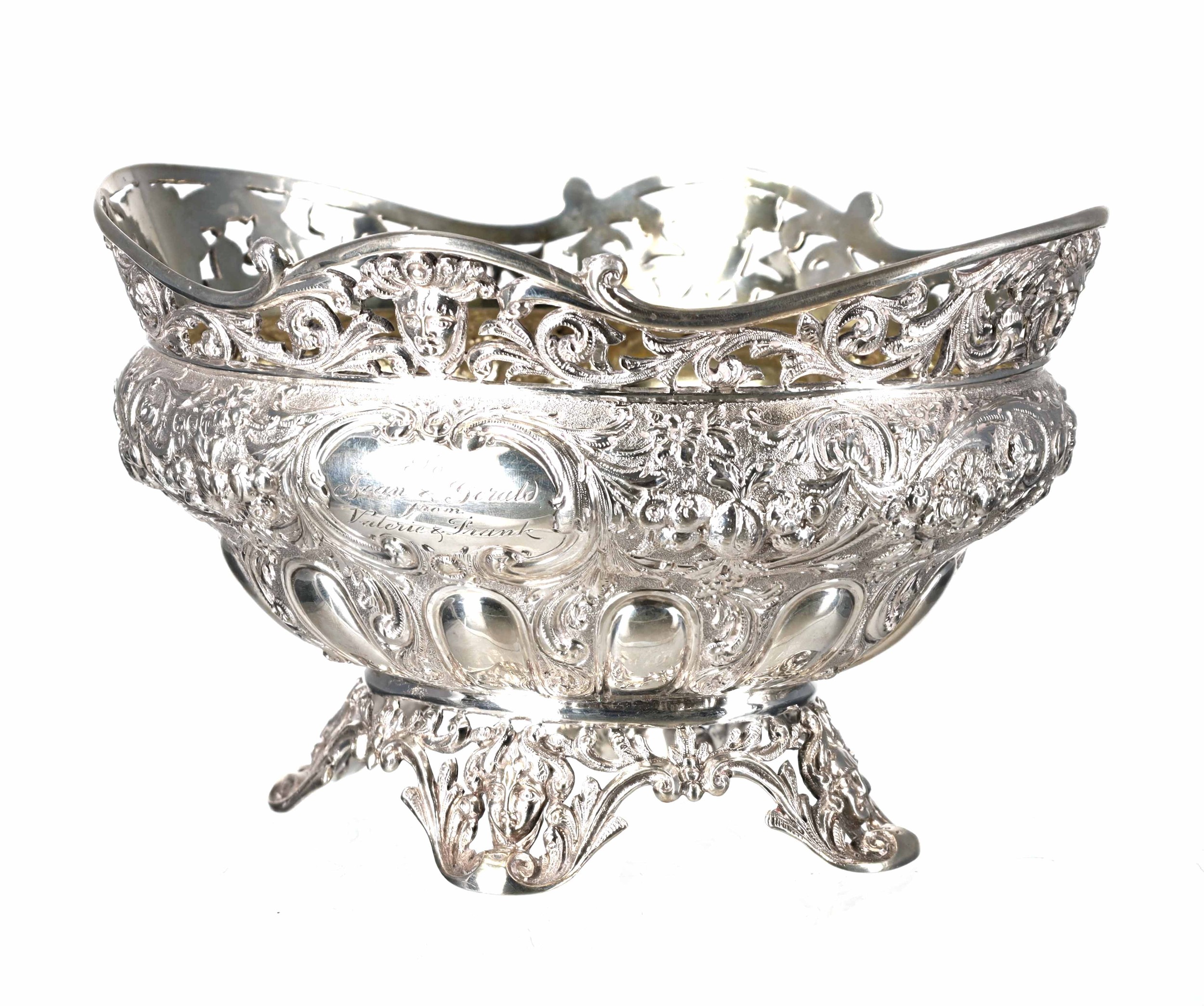 Fine decorative Victorian silver basket, having a pierced raised rim with foliate scroll and mask decoration, the interior gilt, the bowl exterior with cast fruiting swag and floral decoration on a matte ground, raised on pierced folate scroll feet, maker Goldsmiths & Silversmiths Co, London 1894, 9" wide, 6" high, 31.2oz t