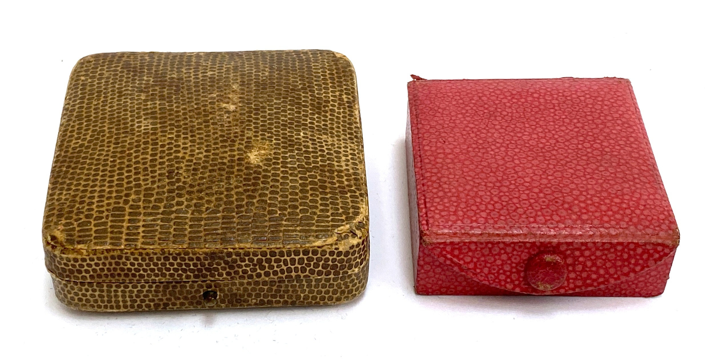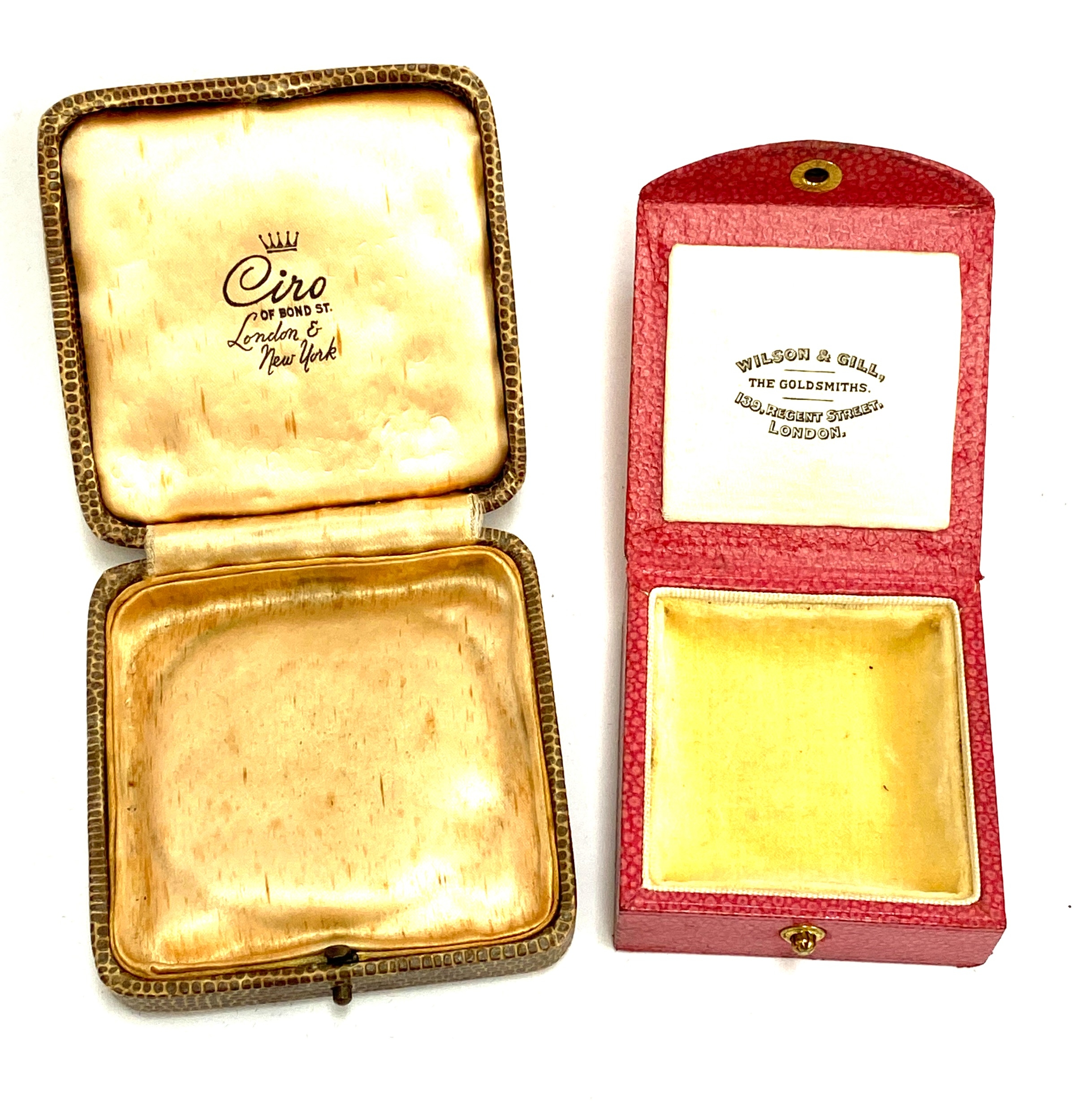 Two antique jewellery boxes: one pink leather style box for Wilson & Gill Goldsmiths, 139 Regent Street, London, 6.3cmW, the other Ciro, 8cmW (2)