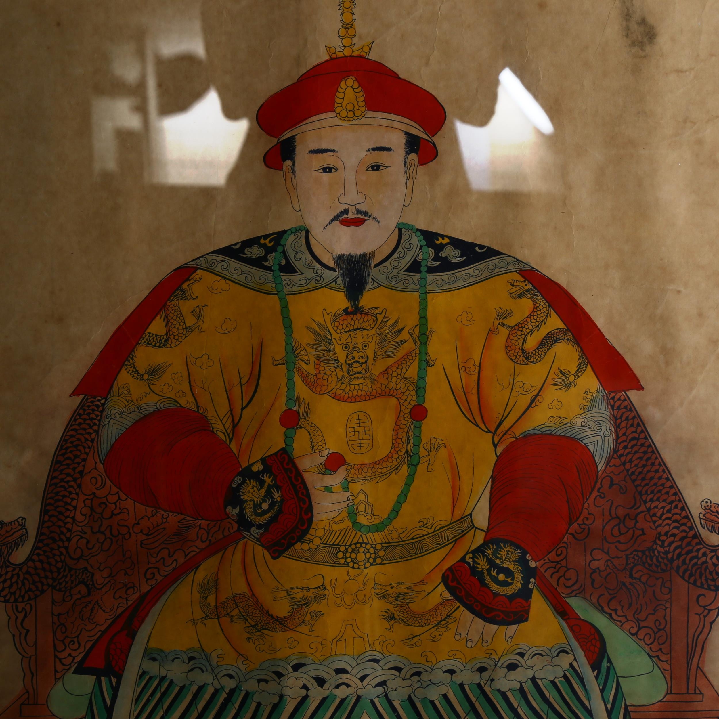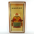 A large Chinese scroll, watercolour over a printed base, ancestral portrait with text inscription, framed, overall frame dimensions 170cm x 87cm