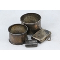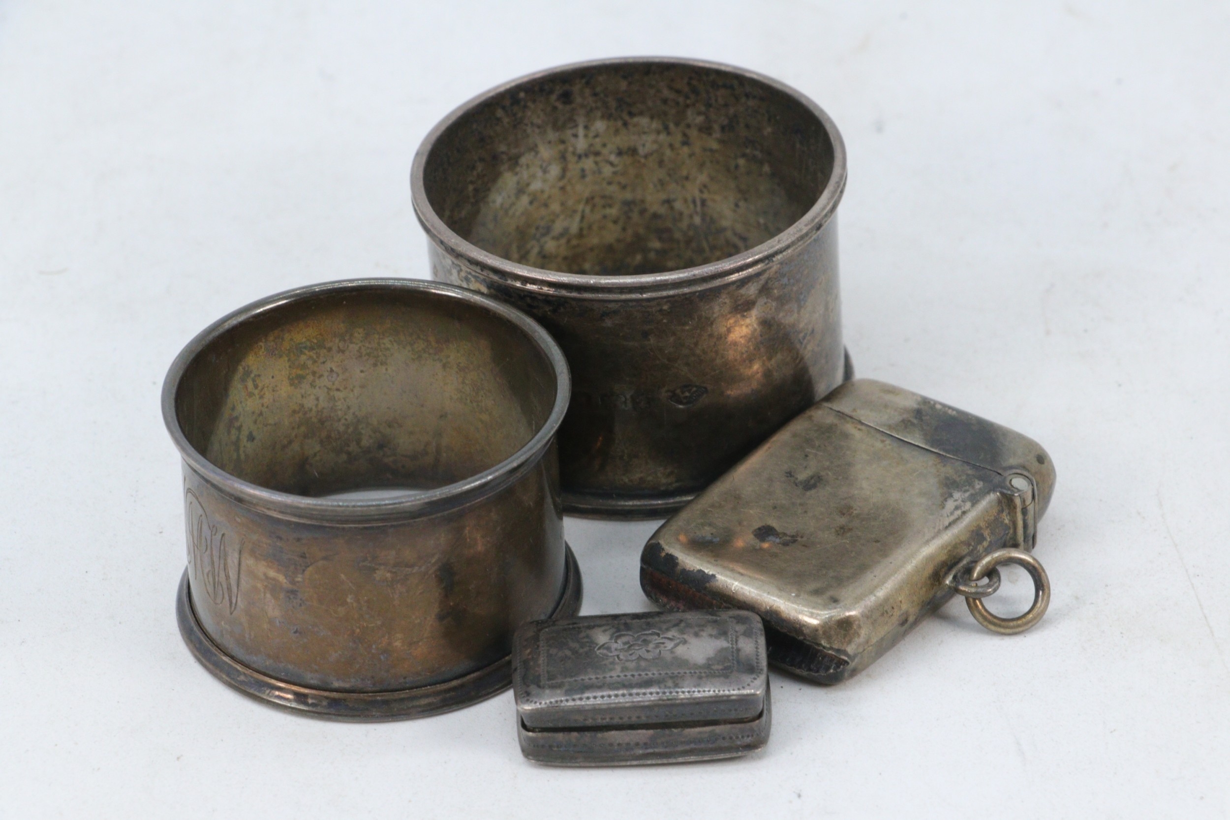 Two silver napkin rings, part of a silver vignette (missing grill) and a silver vesta case (approx. weight 60g)