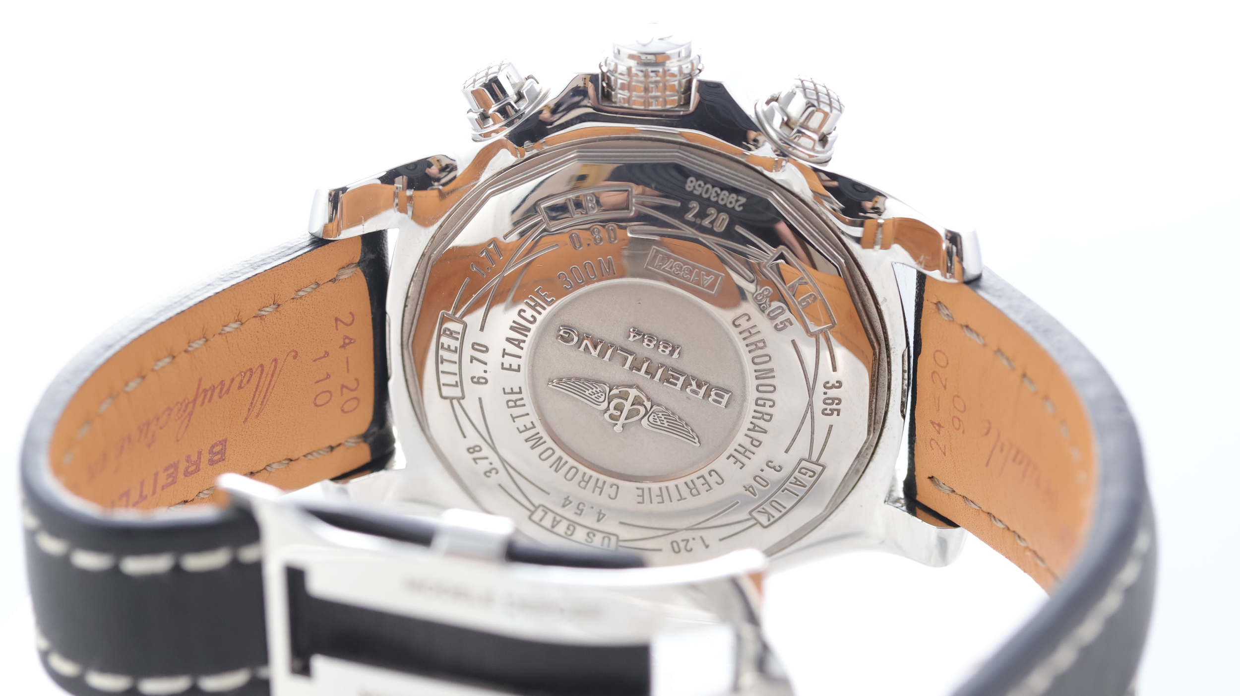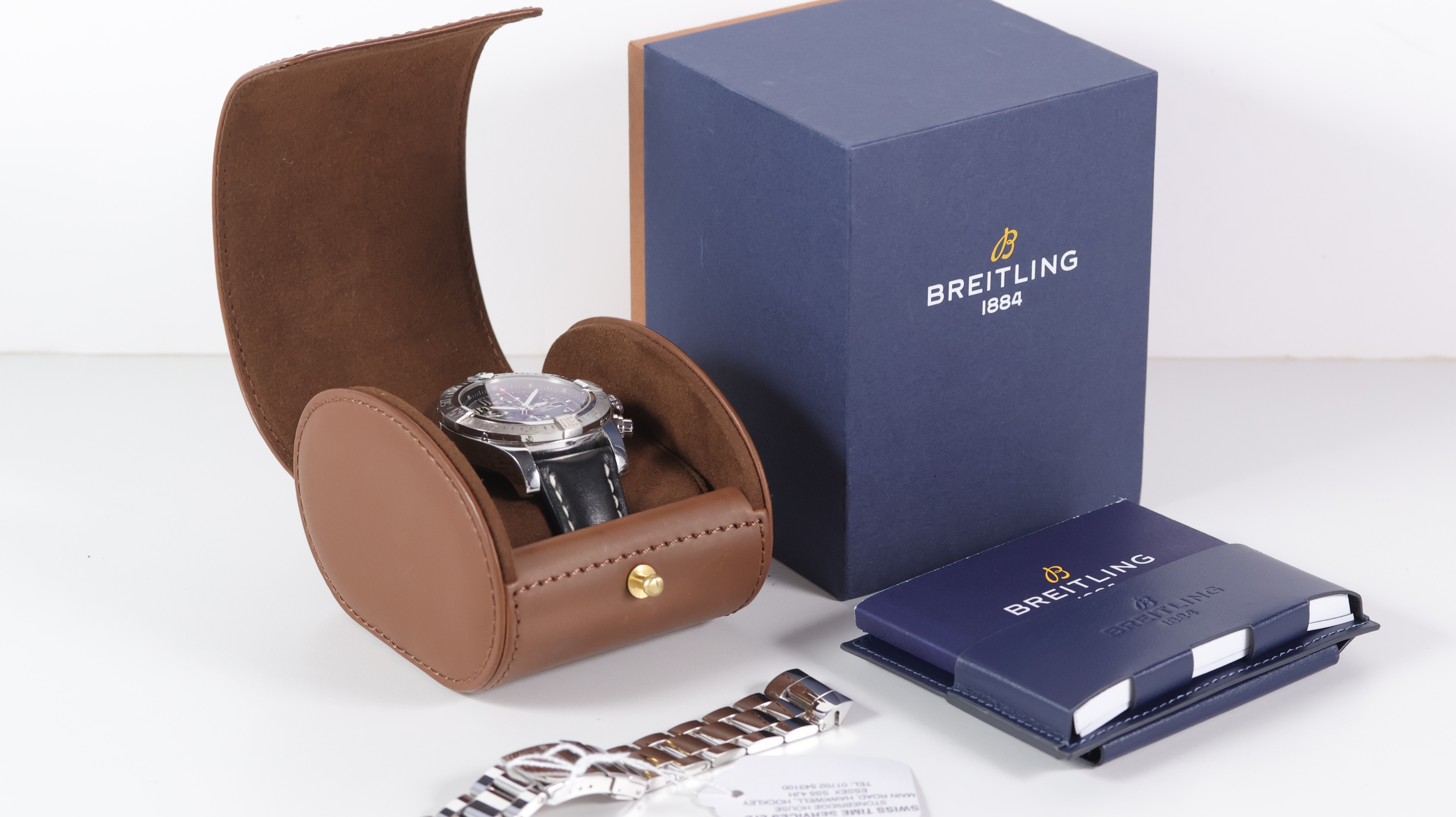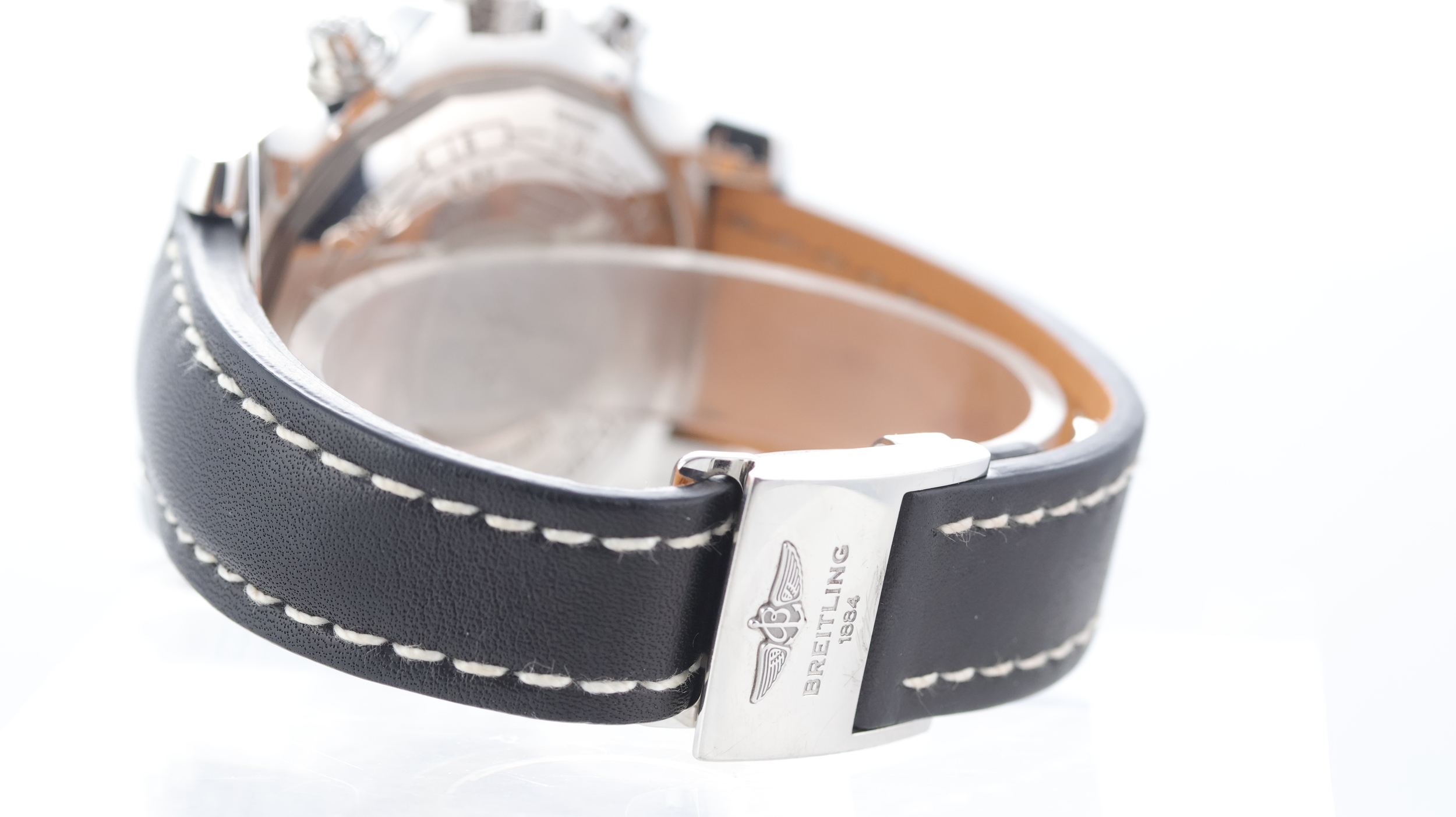 Strap features: Breitling leather strap with a stainless steel clasp.