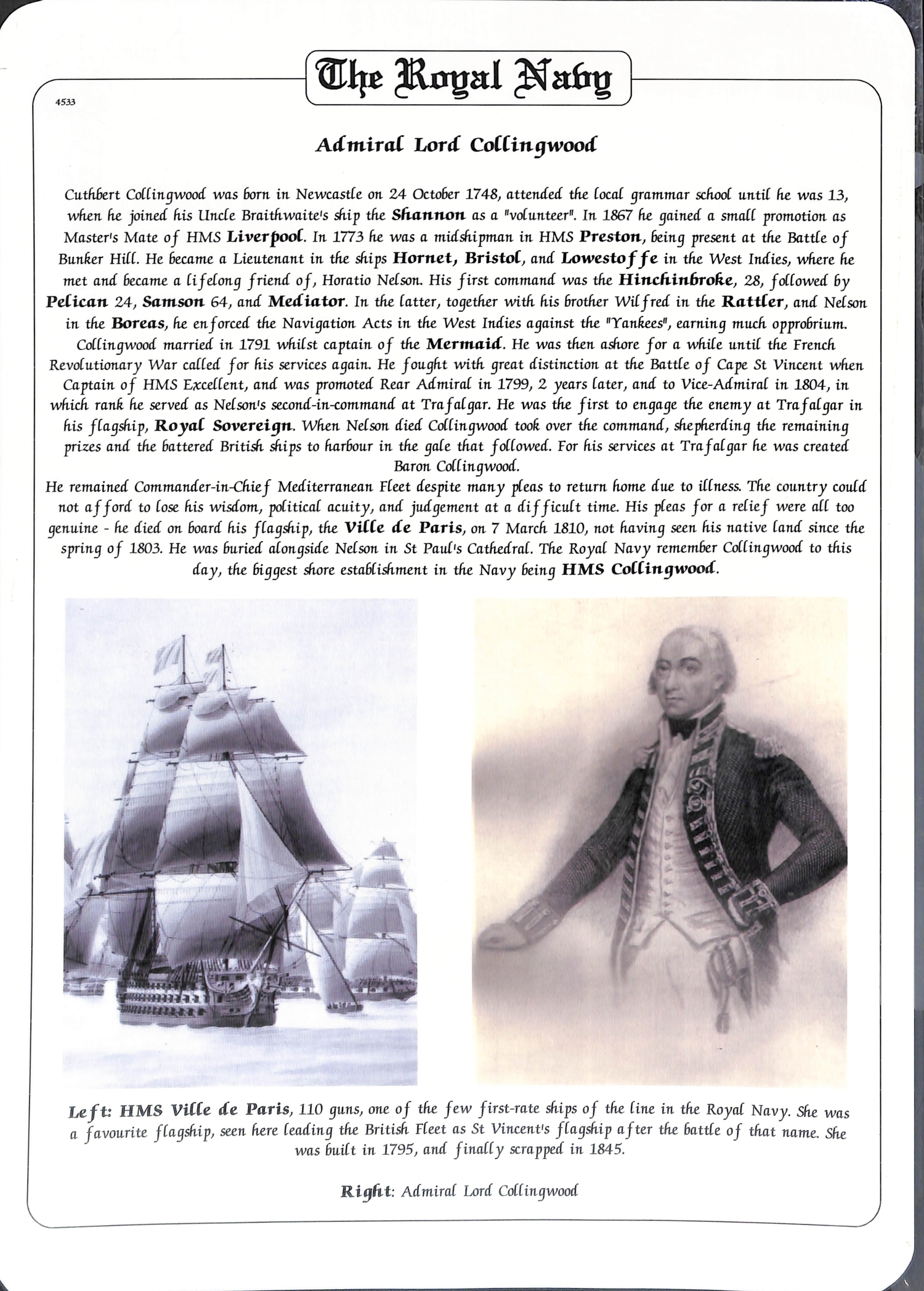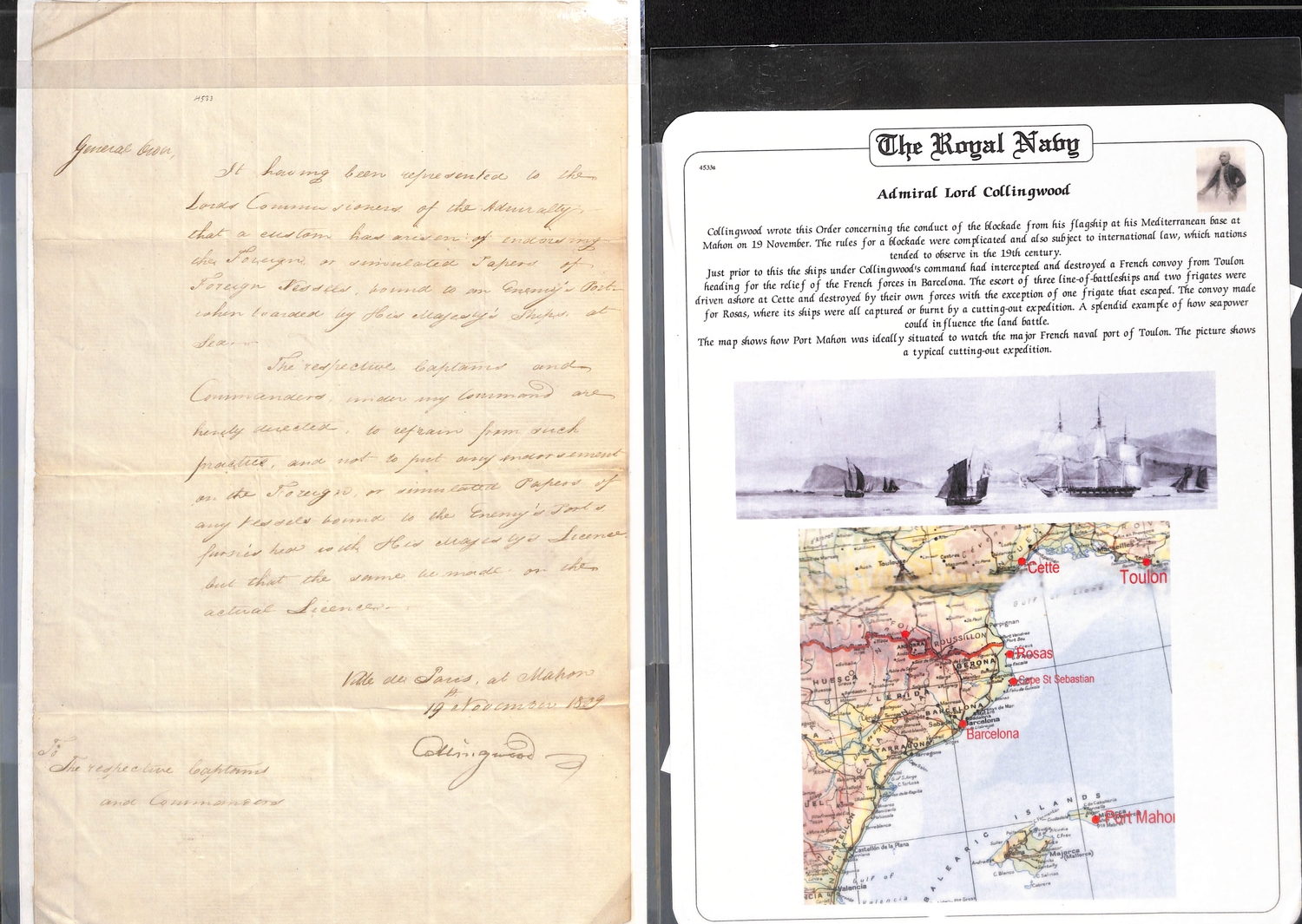 Admiral Lord Collingwood. 1809 (Nov 19) Order signed by Collingwood from the "Ville de Paris at Mahon" sent to the respective Captains and Commissioners, regarding the rules of blockade and endorsing of papers of foreign vessels bound for enemy ports when boarded by H.M Ships at sea. Collingwood was second in command at Trafalgar taking command after Nelson s death; he became Commander-in-Chief in the Mediterranean, dying on the "Ville de Paris" whilst off Port Mahon in March 1810.