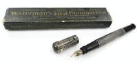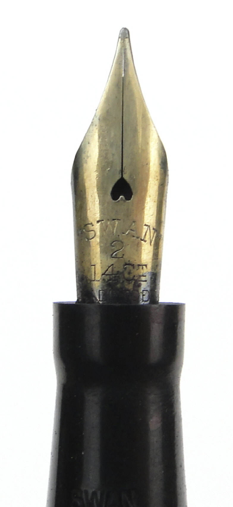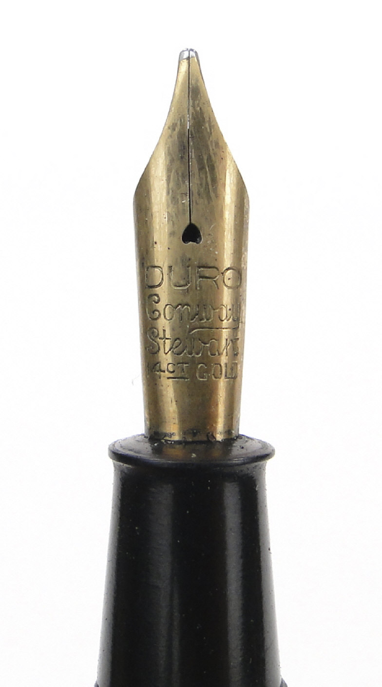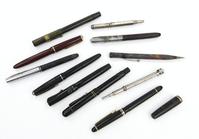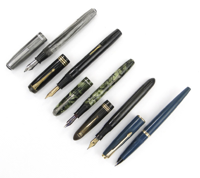 Five fountain pens comprising green marbleised Conway Stewart 75, Esterbrook grey marbleised pen, black Conway Stewart No. 55, black Swan and a turquoise Parker