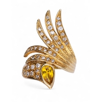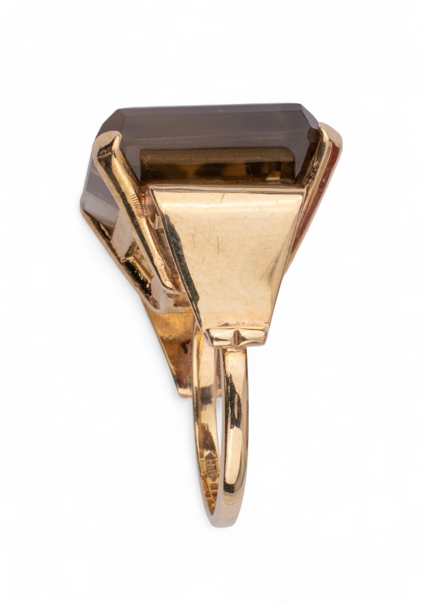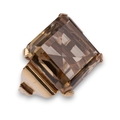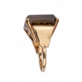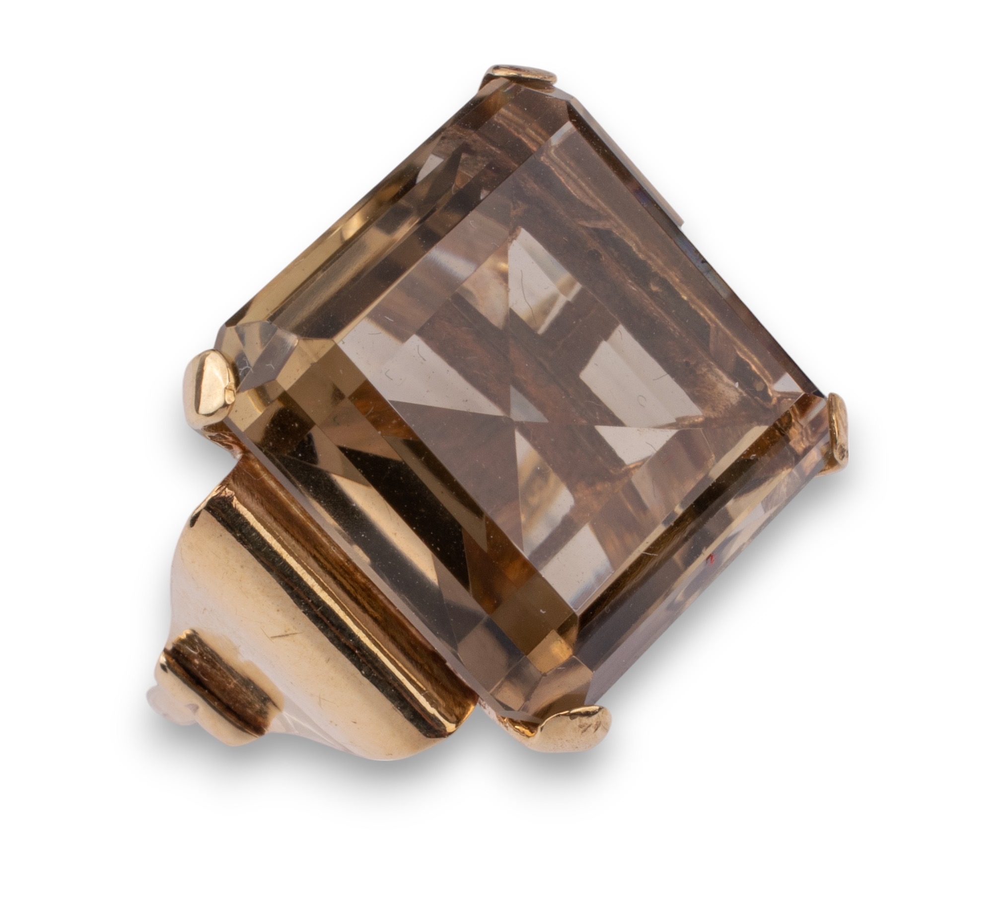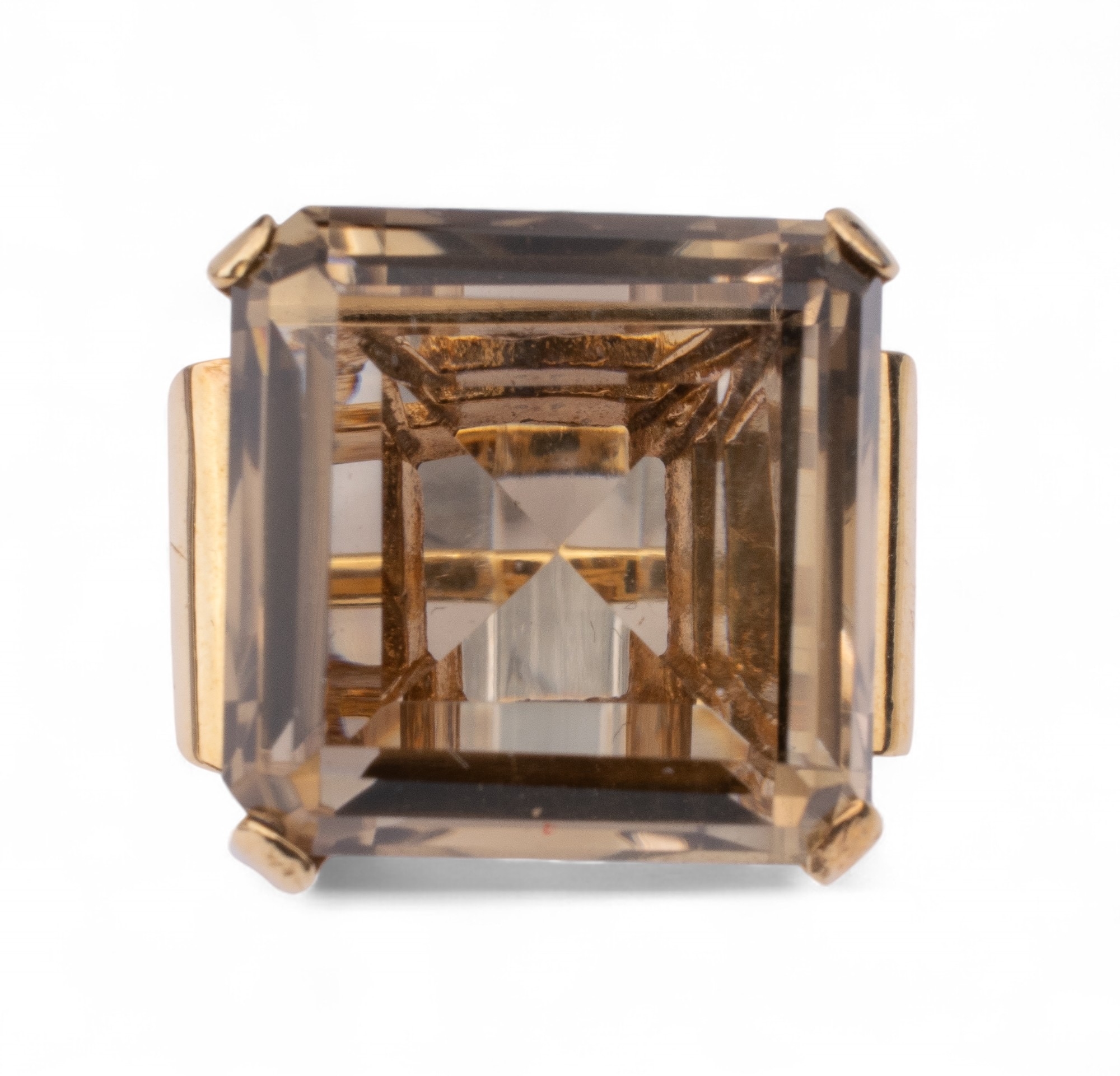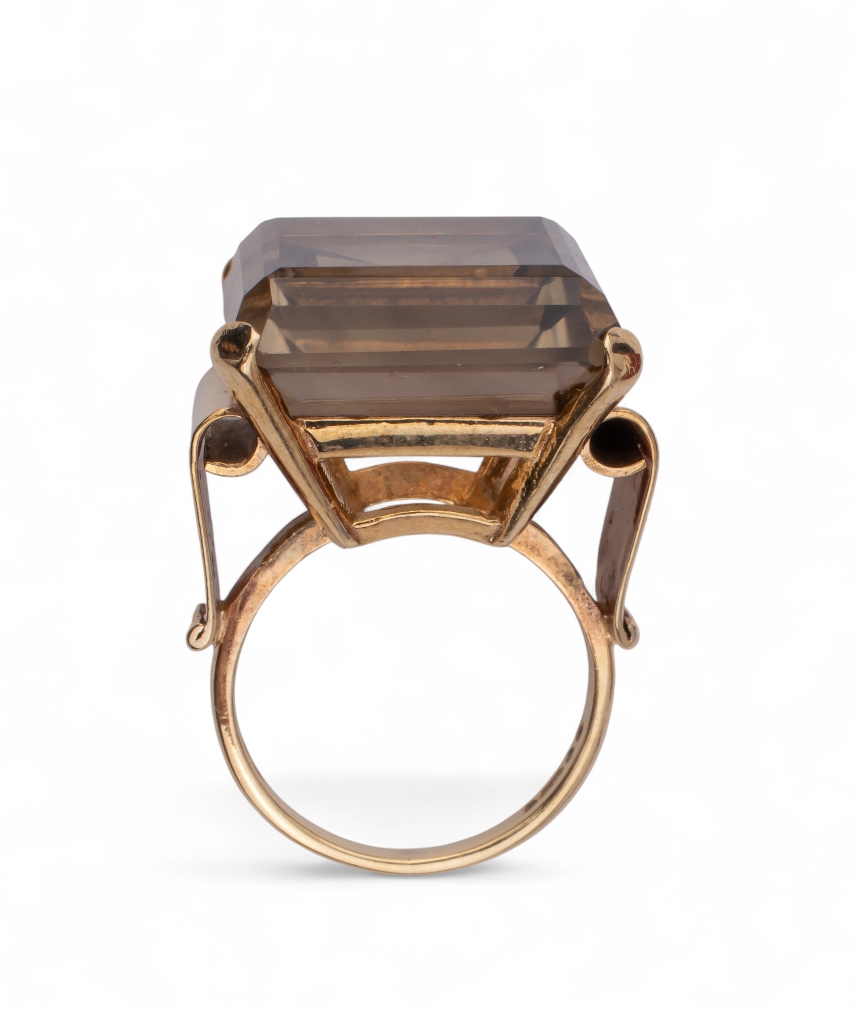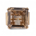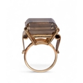 A smoky quartz and pink gold dress ring. The large square-shaped mixed-cut smoky quartz with stylised scroll shoulders and mount.