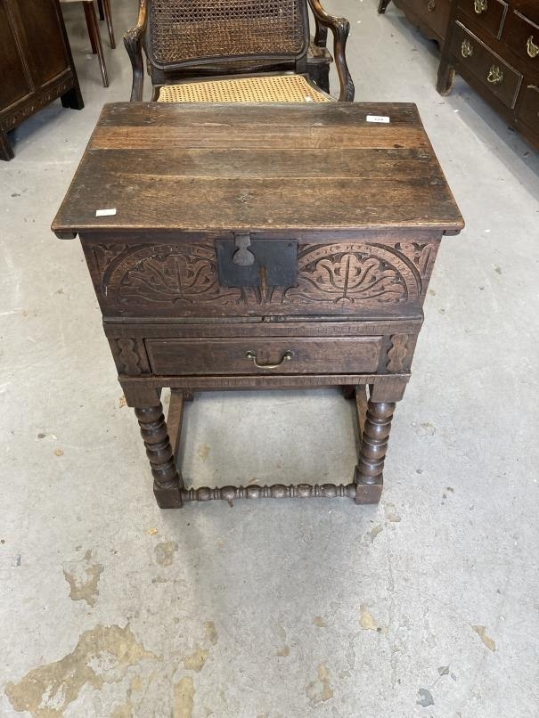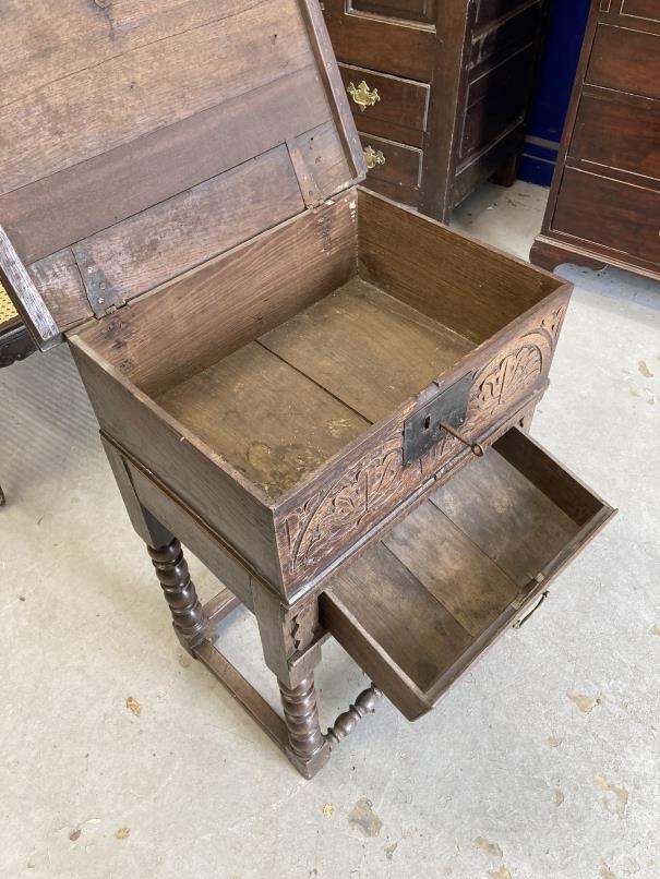 18th cent. Oak bible box on bobbin turned peg jointed stand. 21½ins. x 30ins. x 15ins.