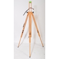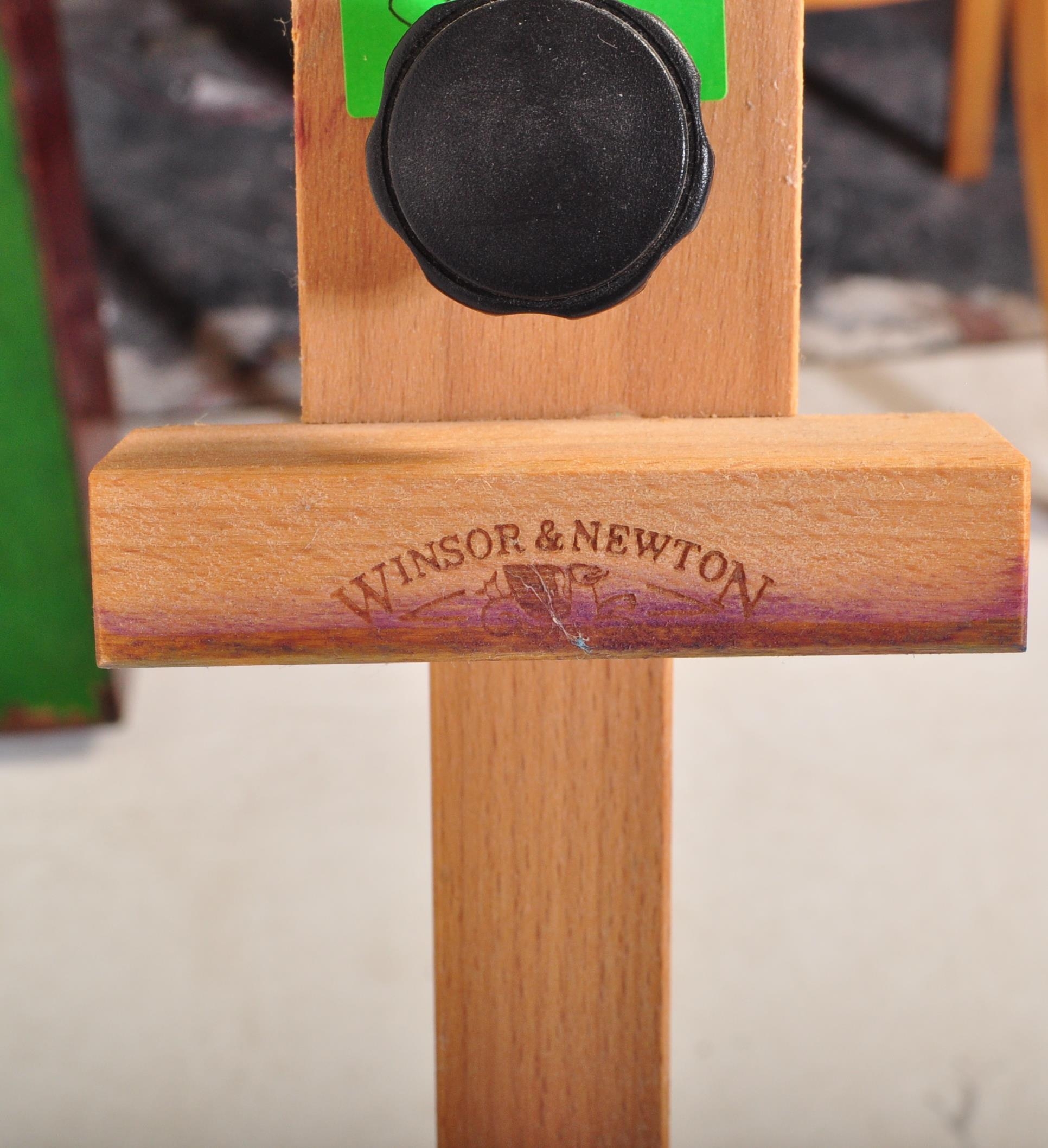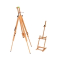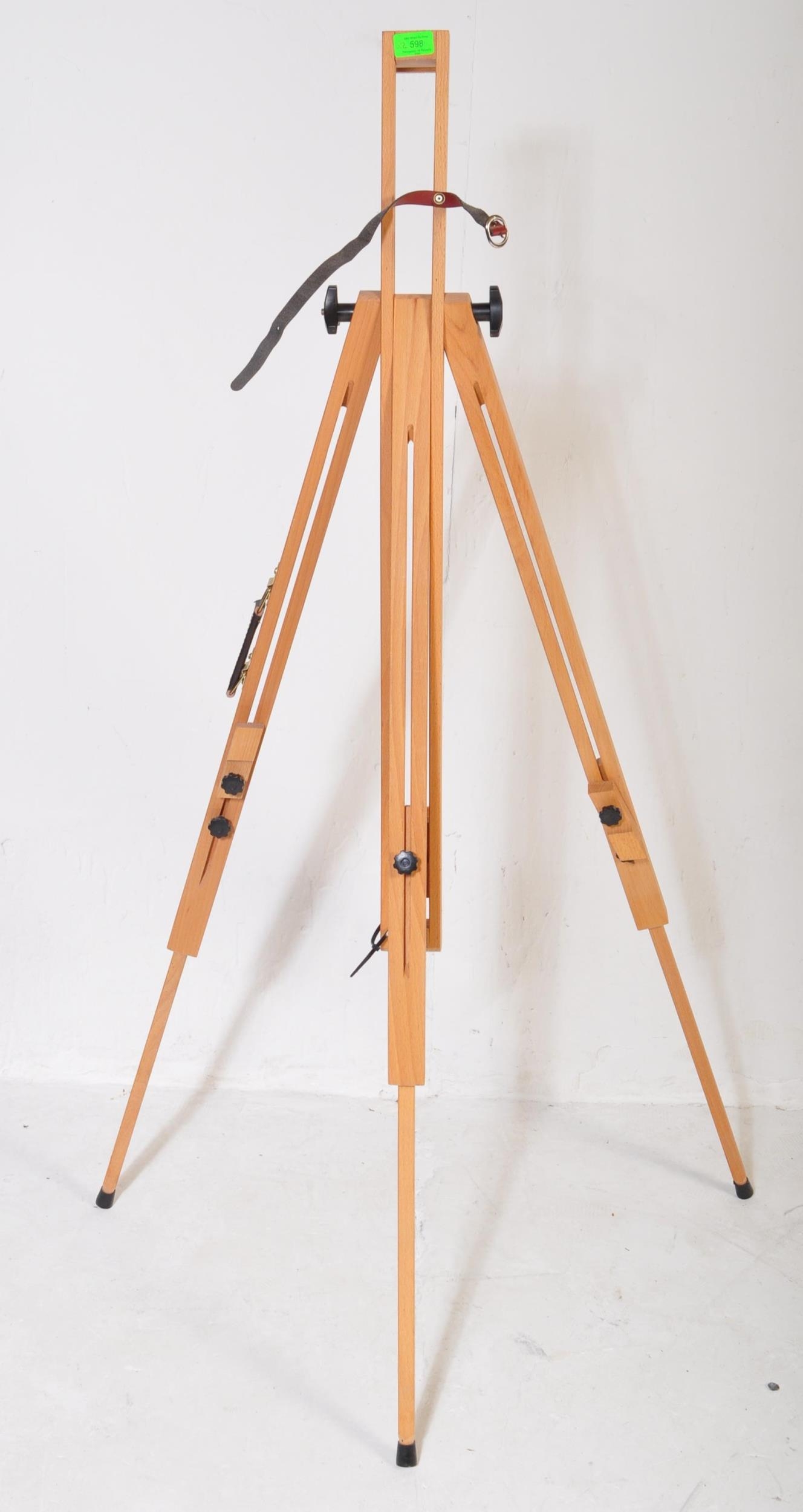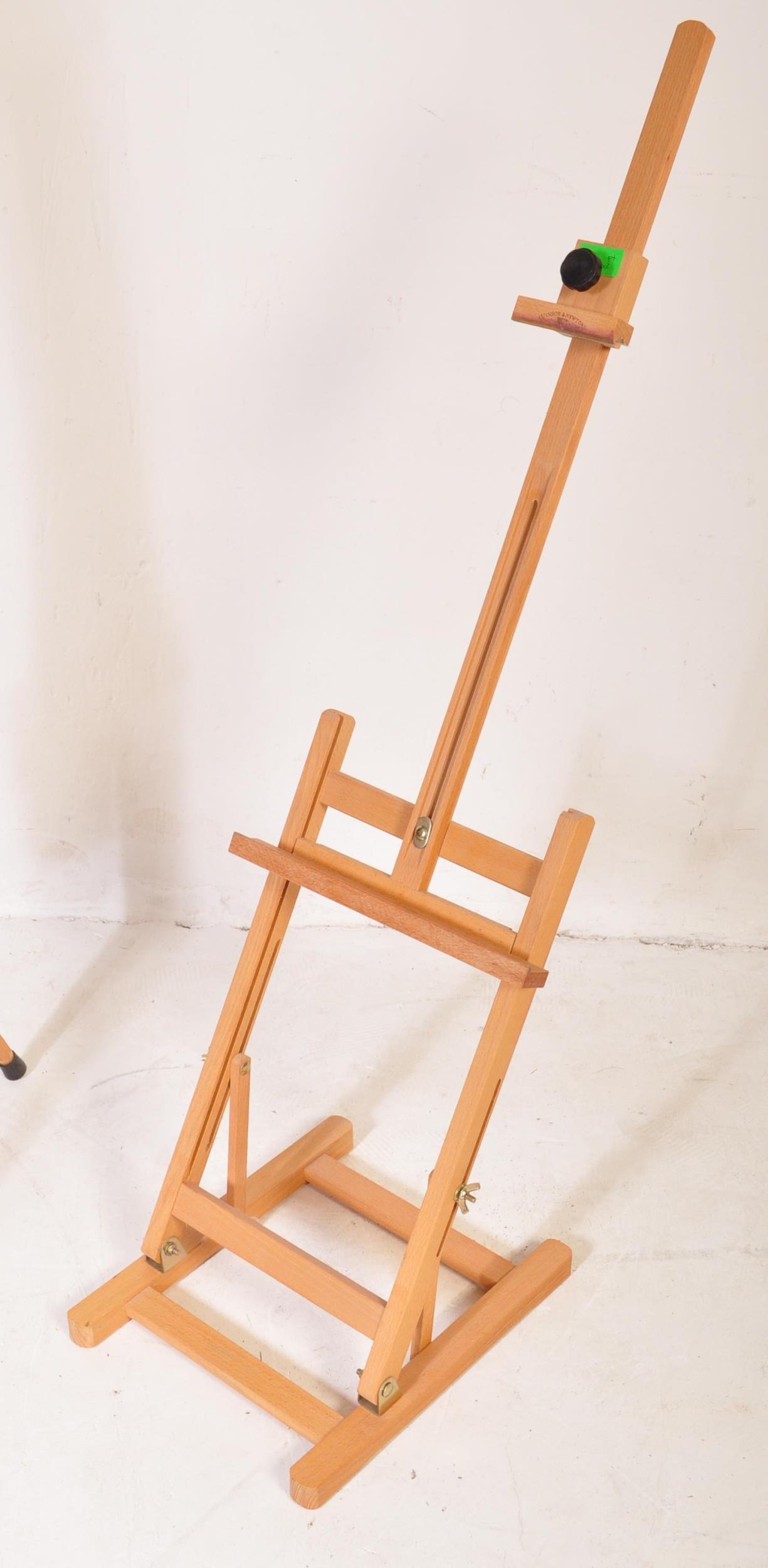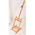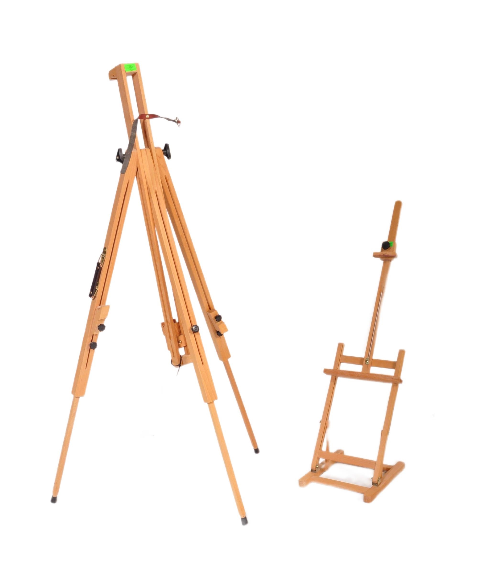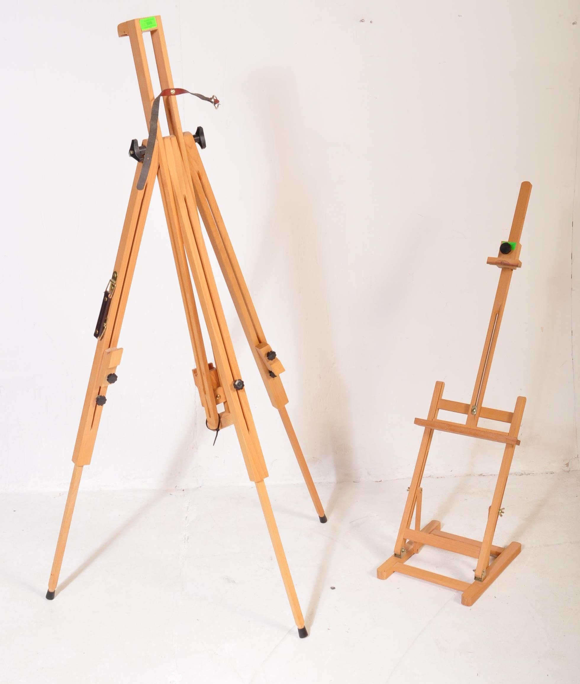 A contemporary modern artists beech wood adjustable easel stand raised on tripod supports. Together with another table top artists easel stand. Measures approx; 140cm tallest.