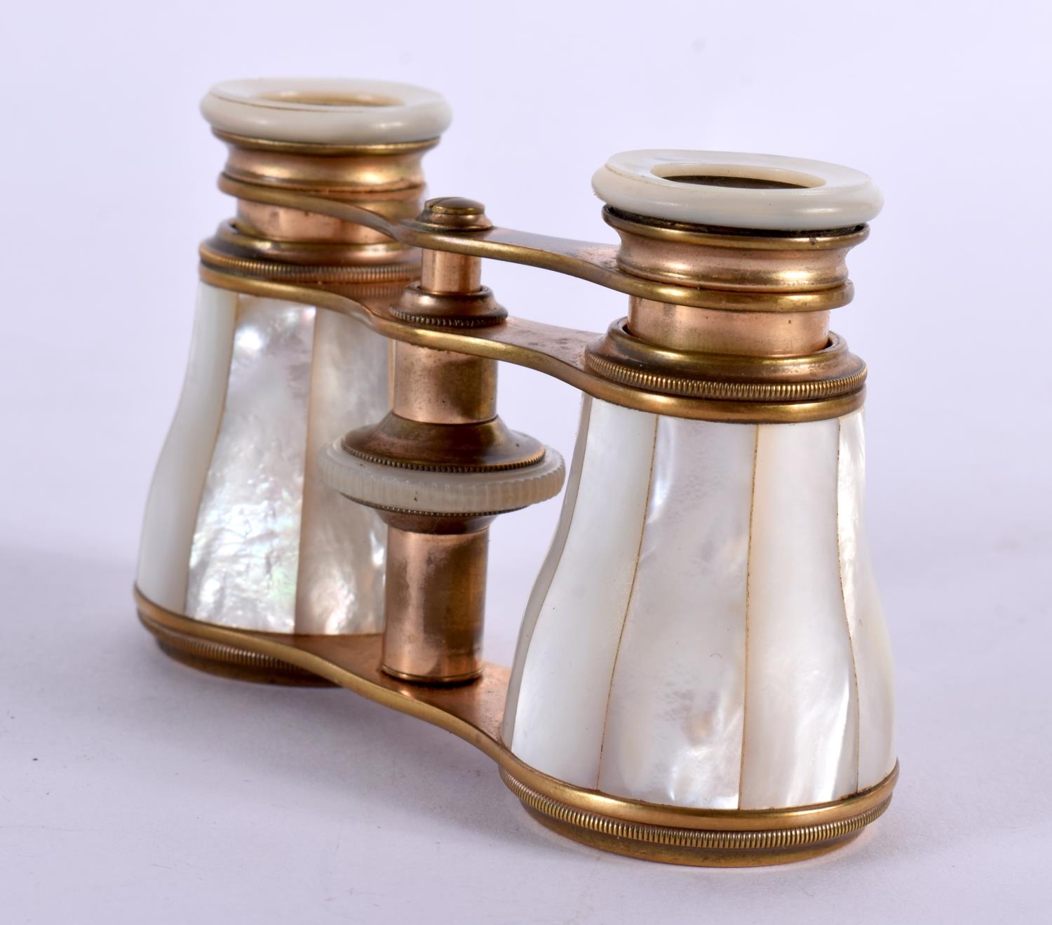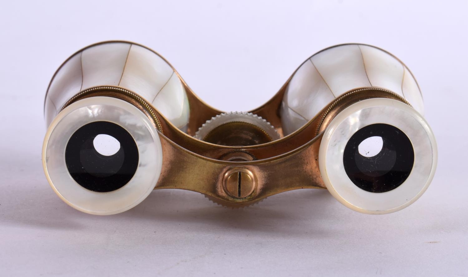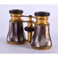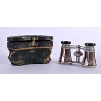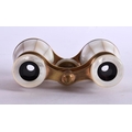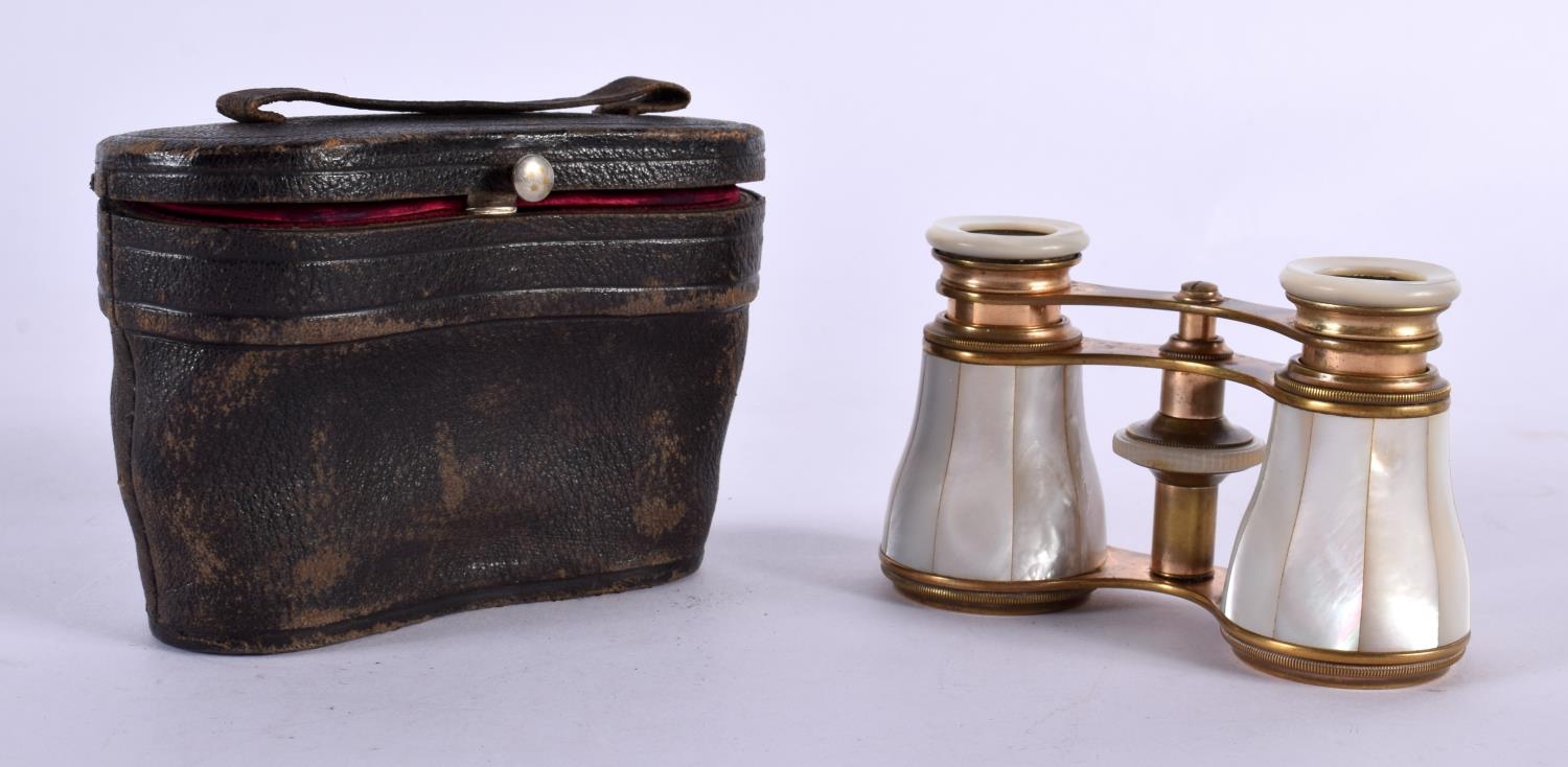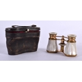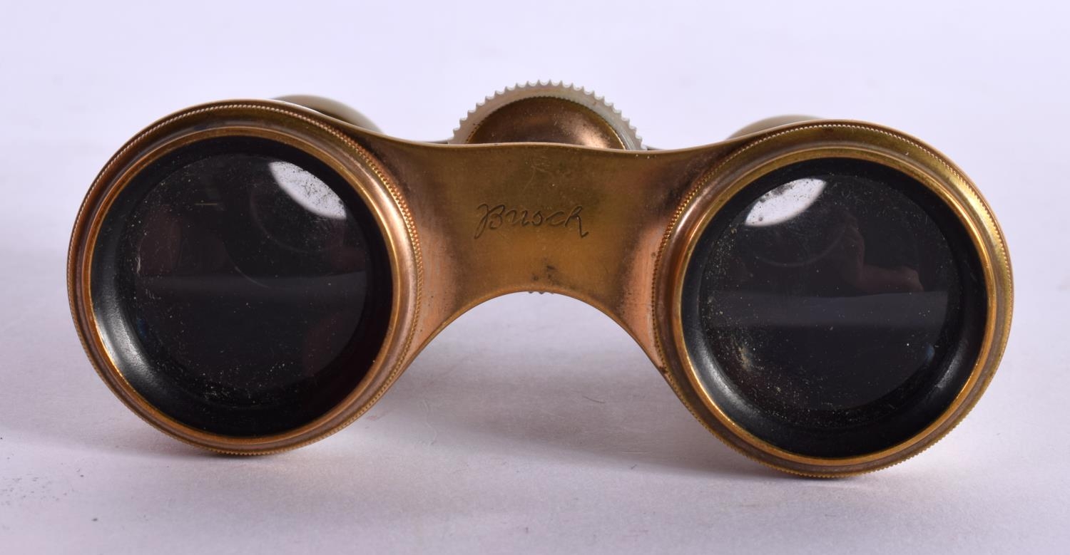 A CASED PAIR OF ANTIQUE BUSCH MOTHER OF PEARL OPERA GLASSES. 5.9cm (closed) 7.2cm (extended) x 9.9cm x 3.7cm