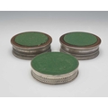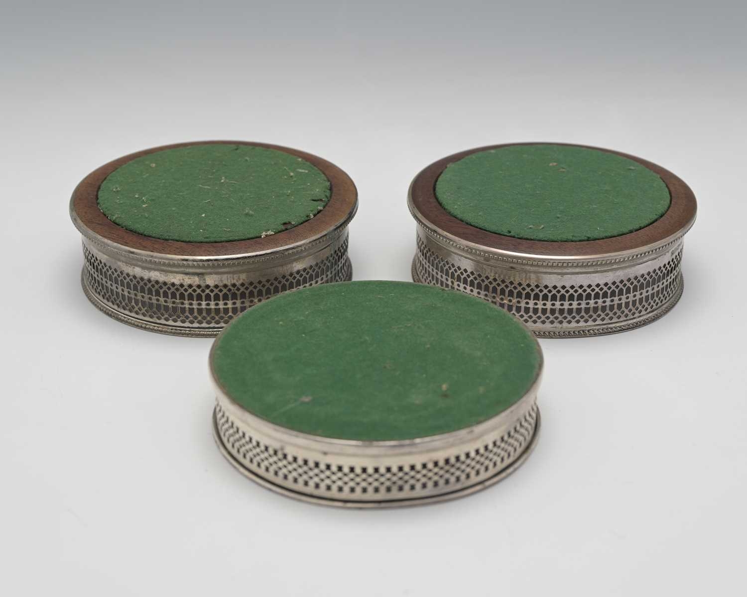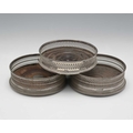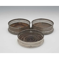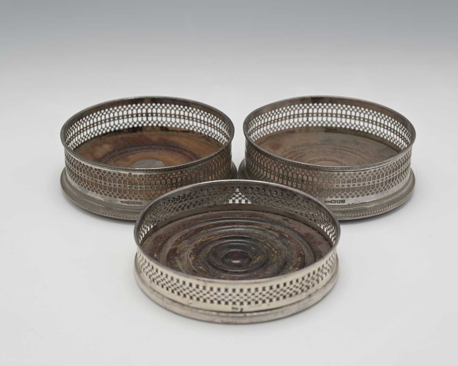 Three twentieth-century silver bottle coasters, to include a pair by John Bull Ltd., London 1990, and one other, each pierced and with a turned wood base, diameter 13cm approx (3)