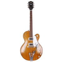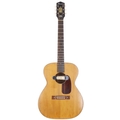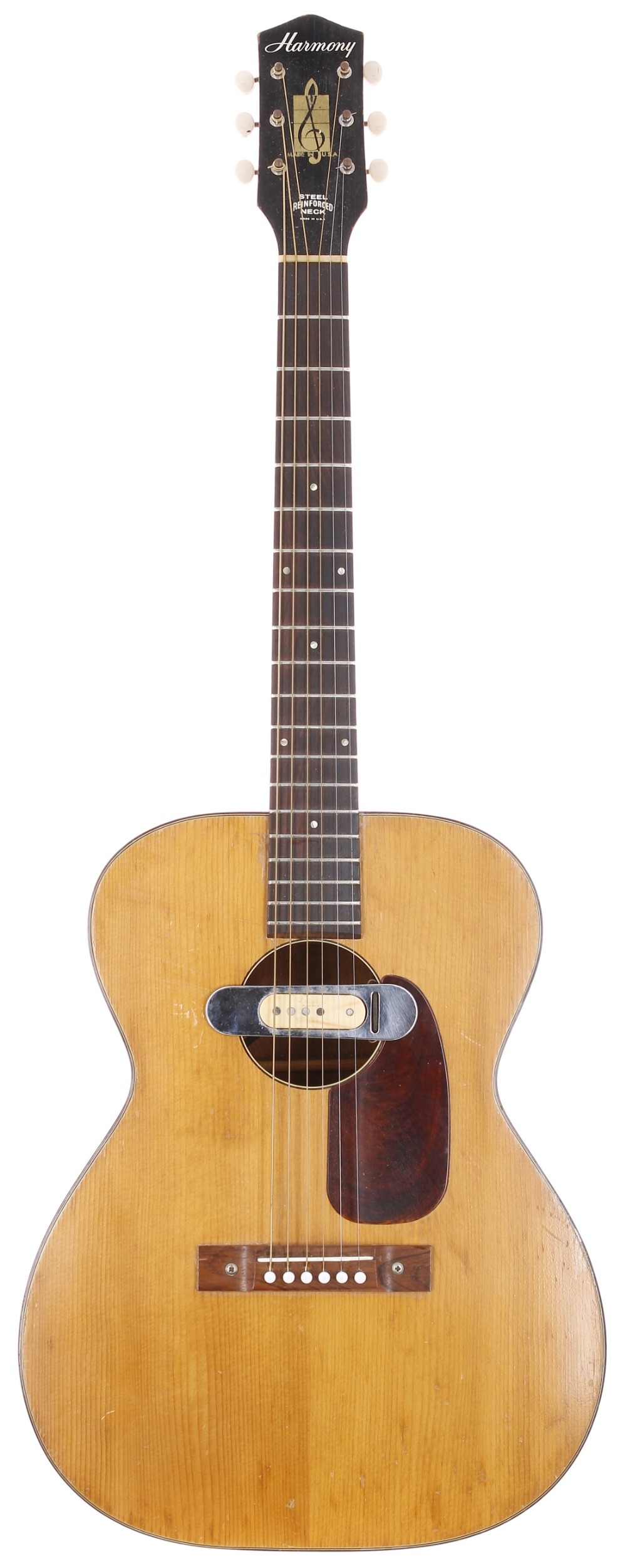 1960s Harmony acoustic guitar, made in USA; Back and sides: mahogany, various scratches and dings throughout; Top: natural spruce, minor dings and marks; Neck: maple, minor dings and wear; Fretboard: rosewood; Frets: good, refret; Electrics: working, DeArmond sound hole pickup fitted and wired through to end pin; Case: semi-rigid fibreboard case; Overall condition: fair