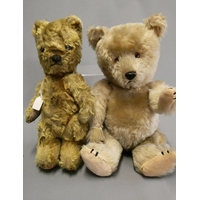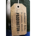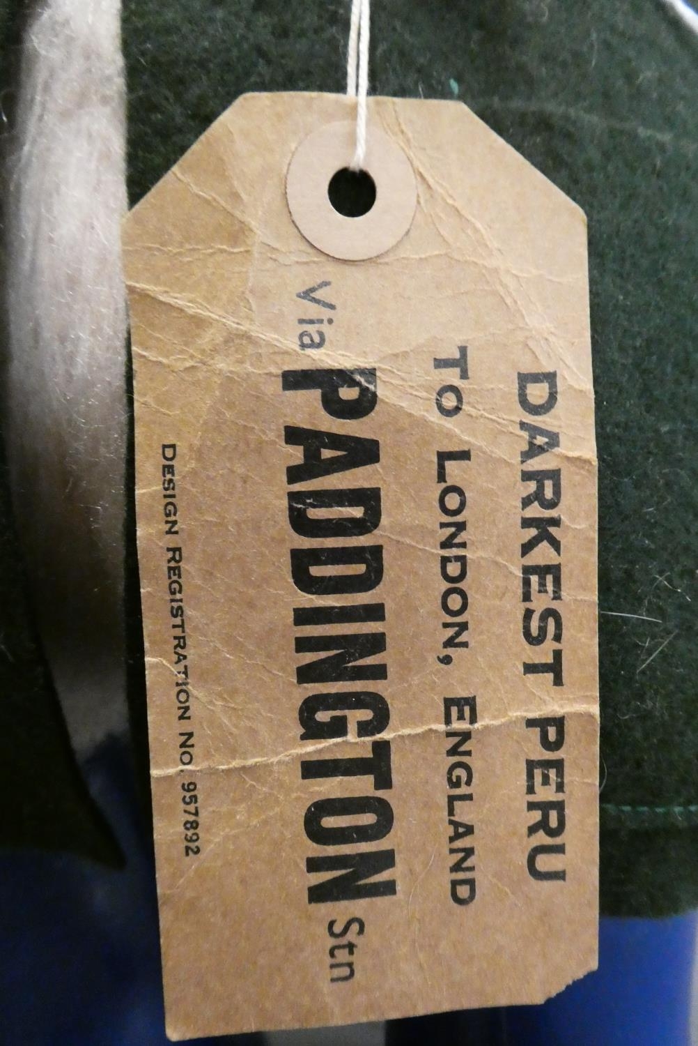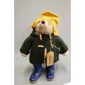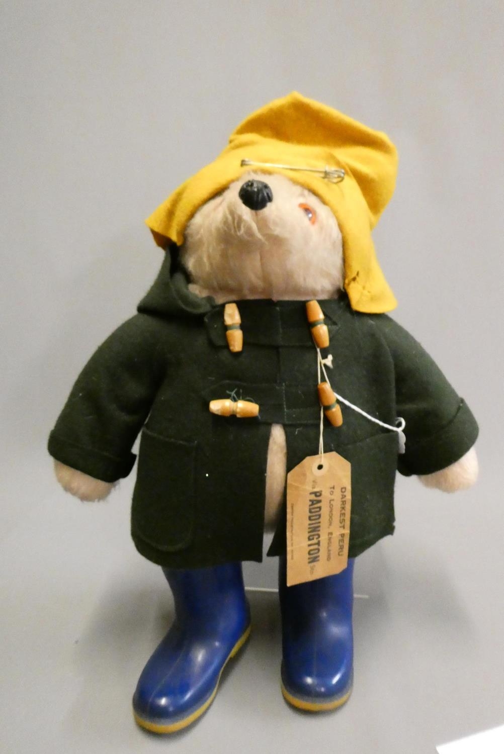 Vintage Paddington bear, with orange felt hat, green felt coat, blue Dunlop boots and cardboard label, approx. 19 1/2" tall