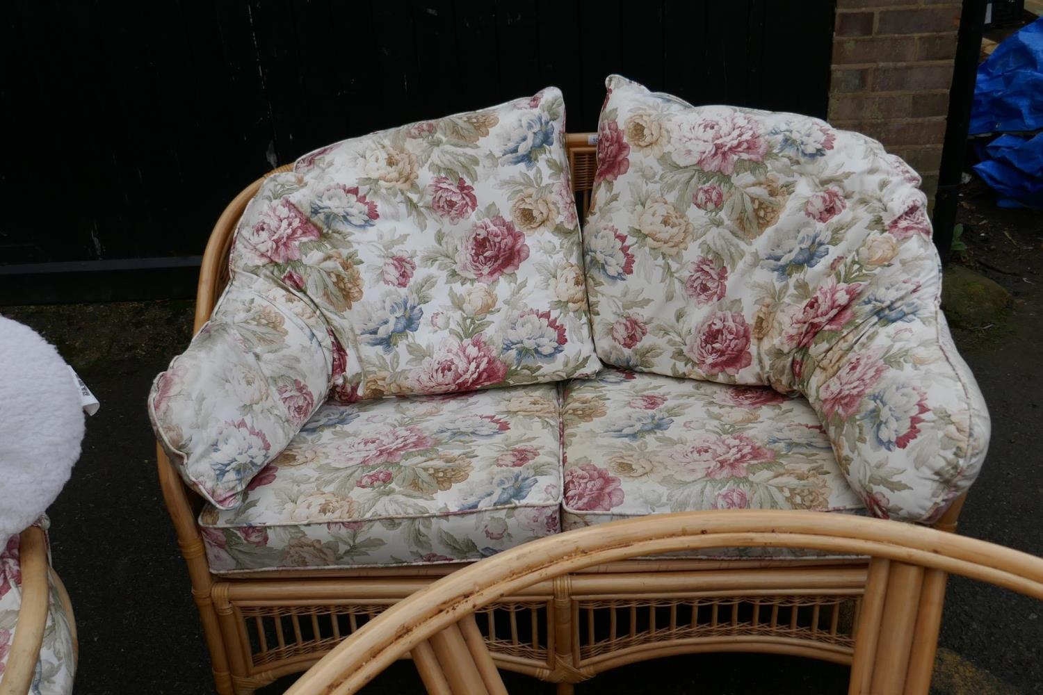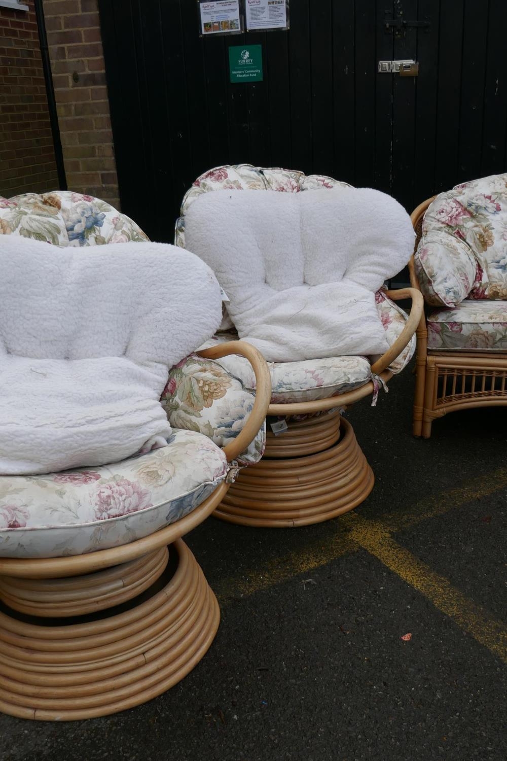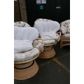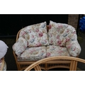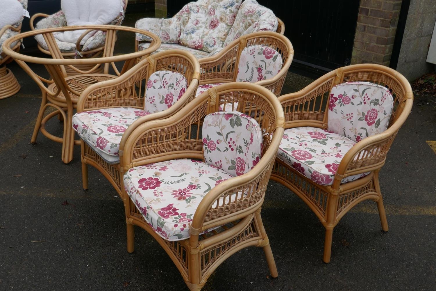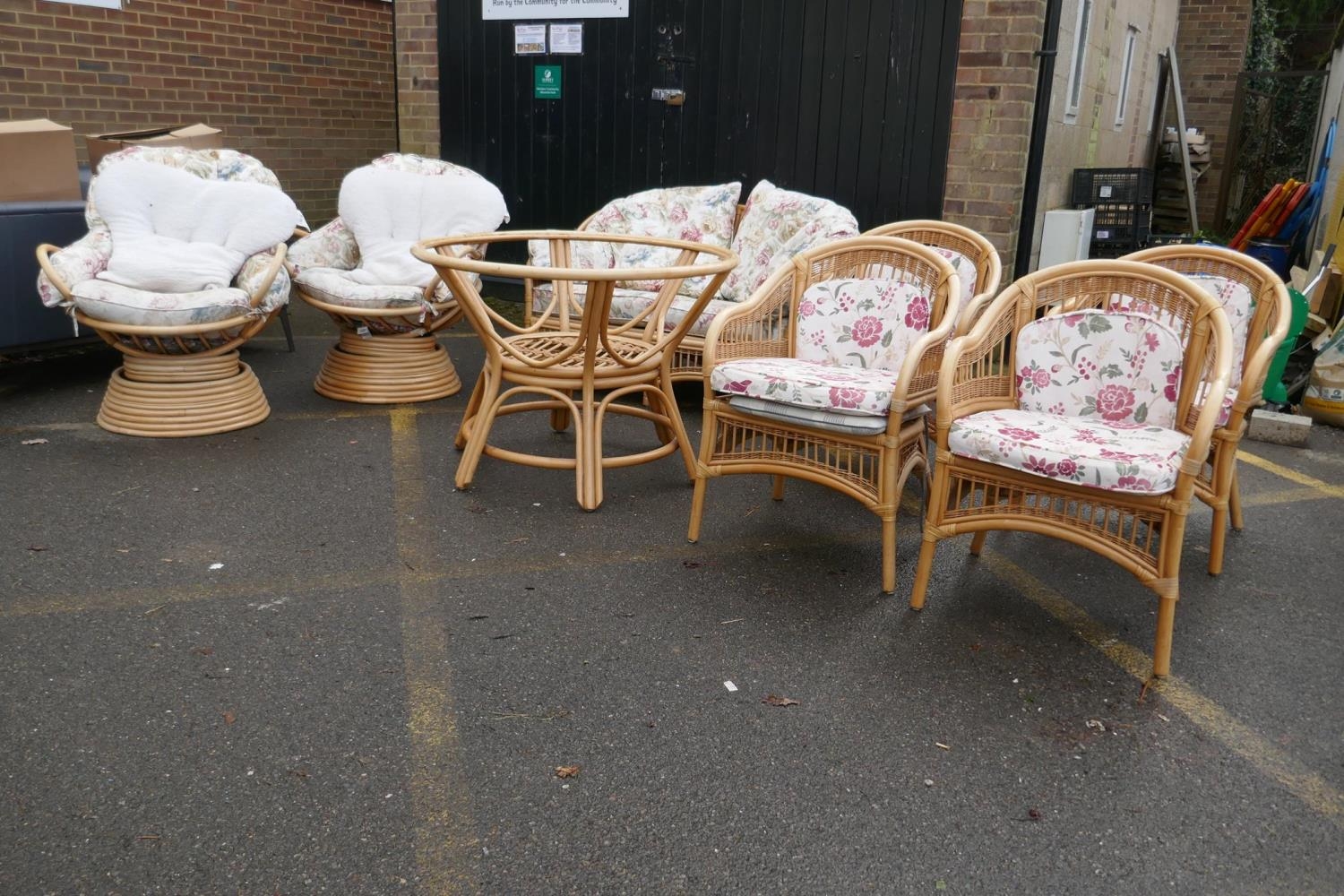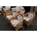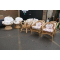 A cane conservatory suite comprising a glass top table, four arm chairs, a two seat sofa and two tub shaped swivel chairs, table 105cm diameter