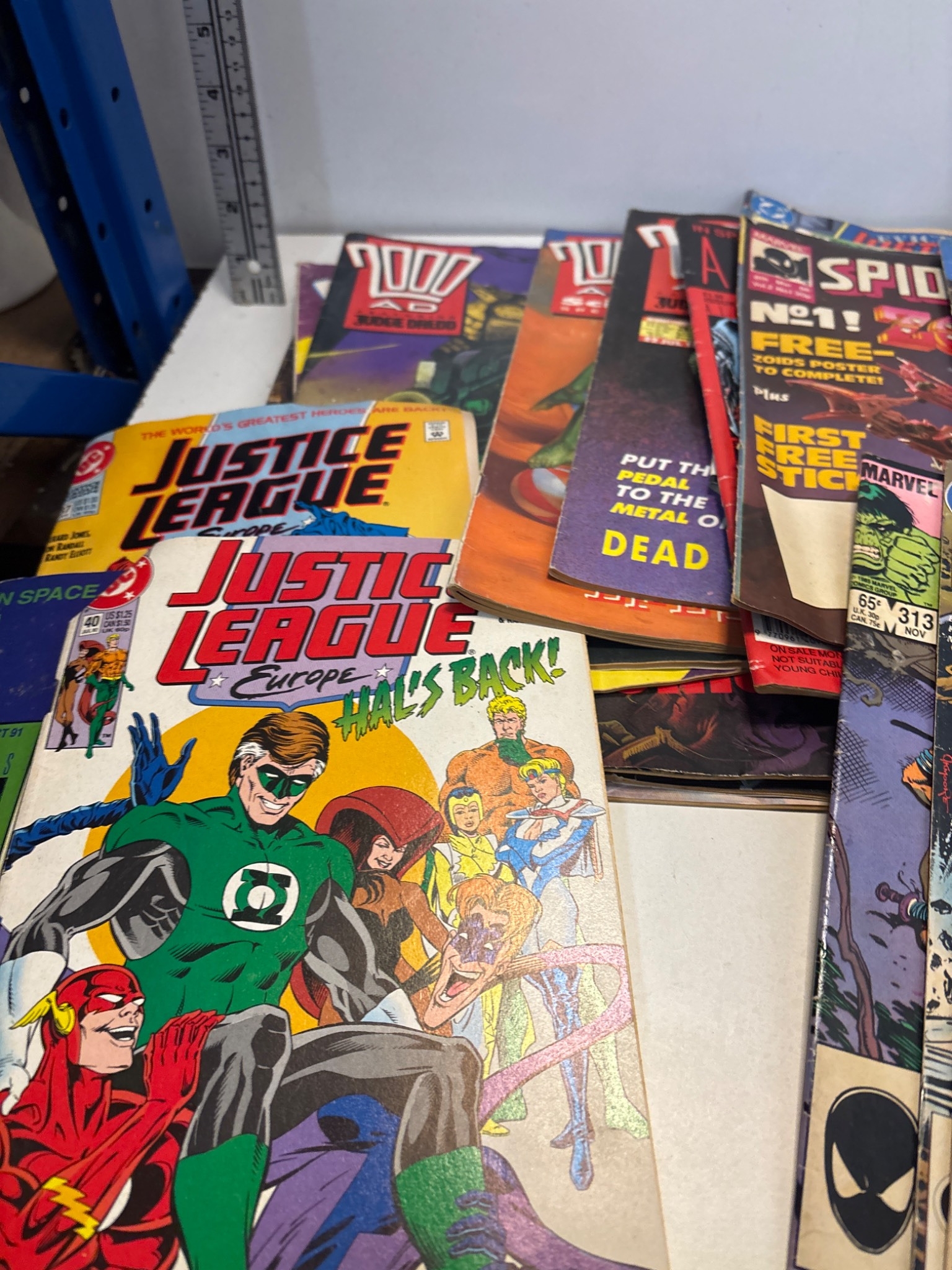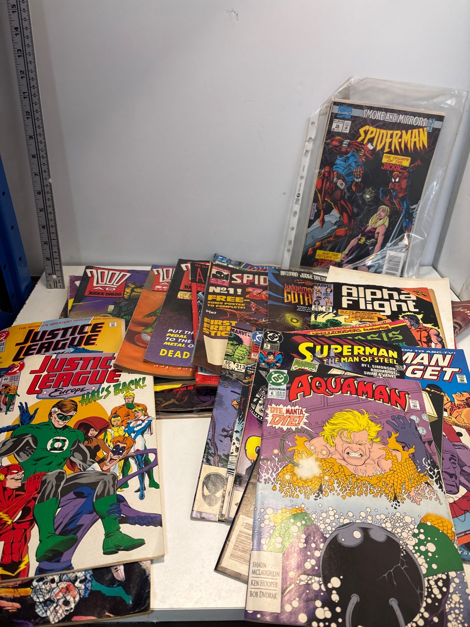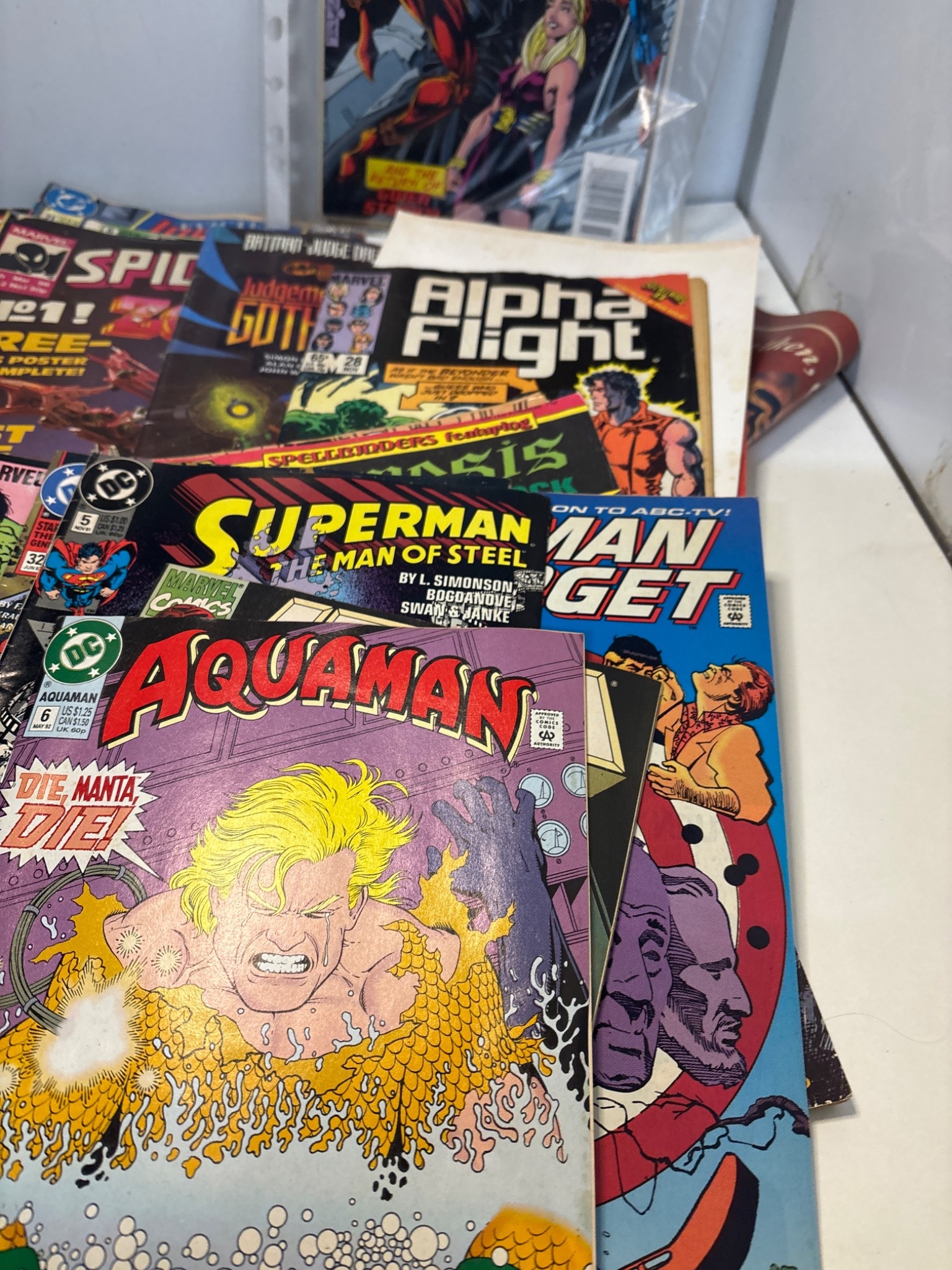 Lot including Justice League, Superman, Spider-Man, Aquaman, and Alpha Flight comic books in mixed conditions. Various issues and publishers.