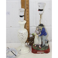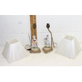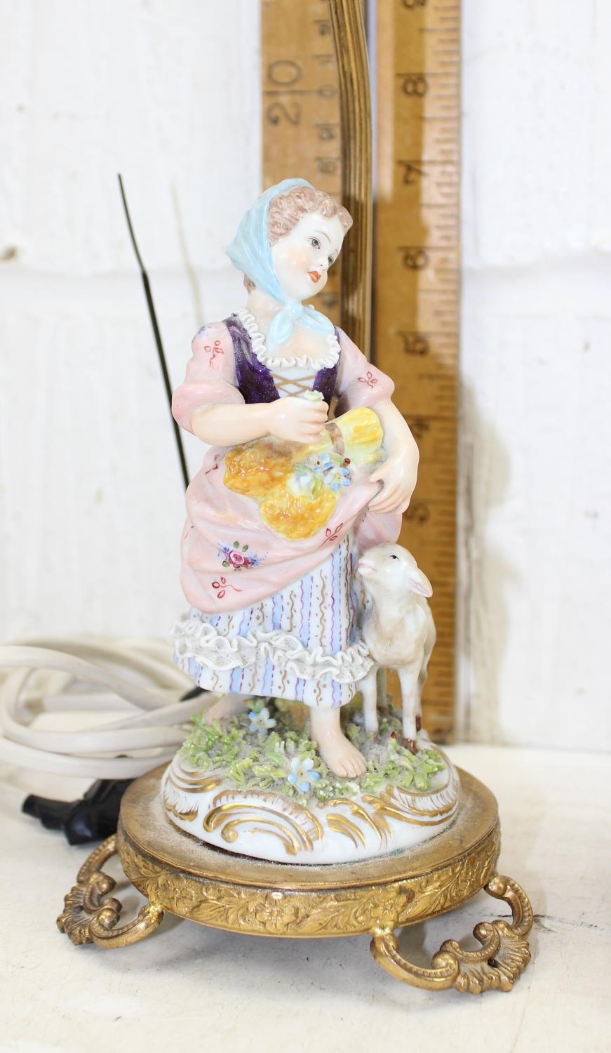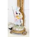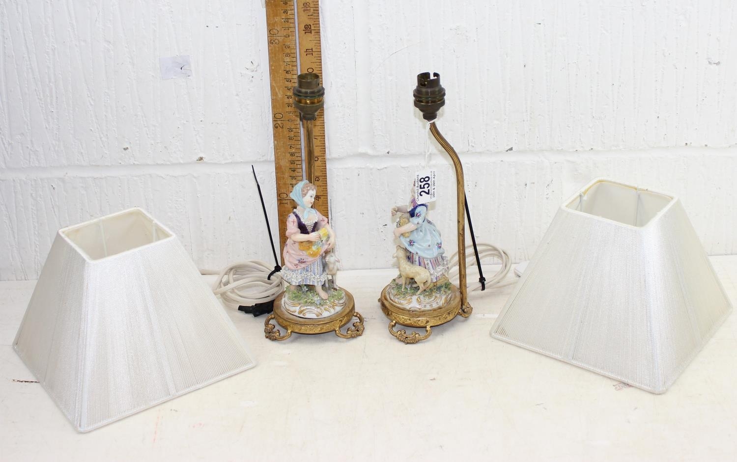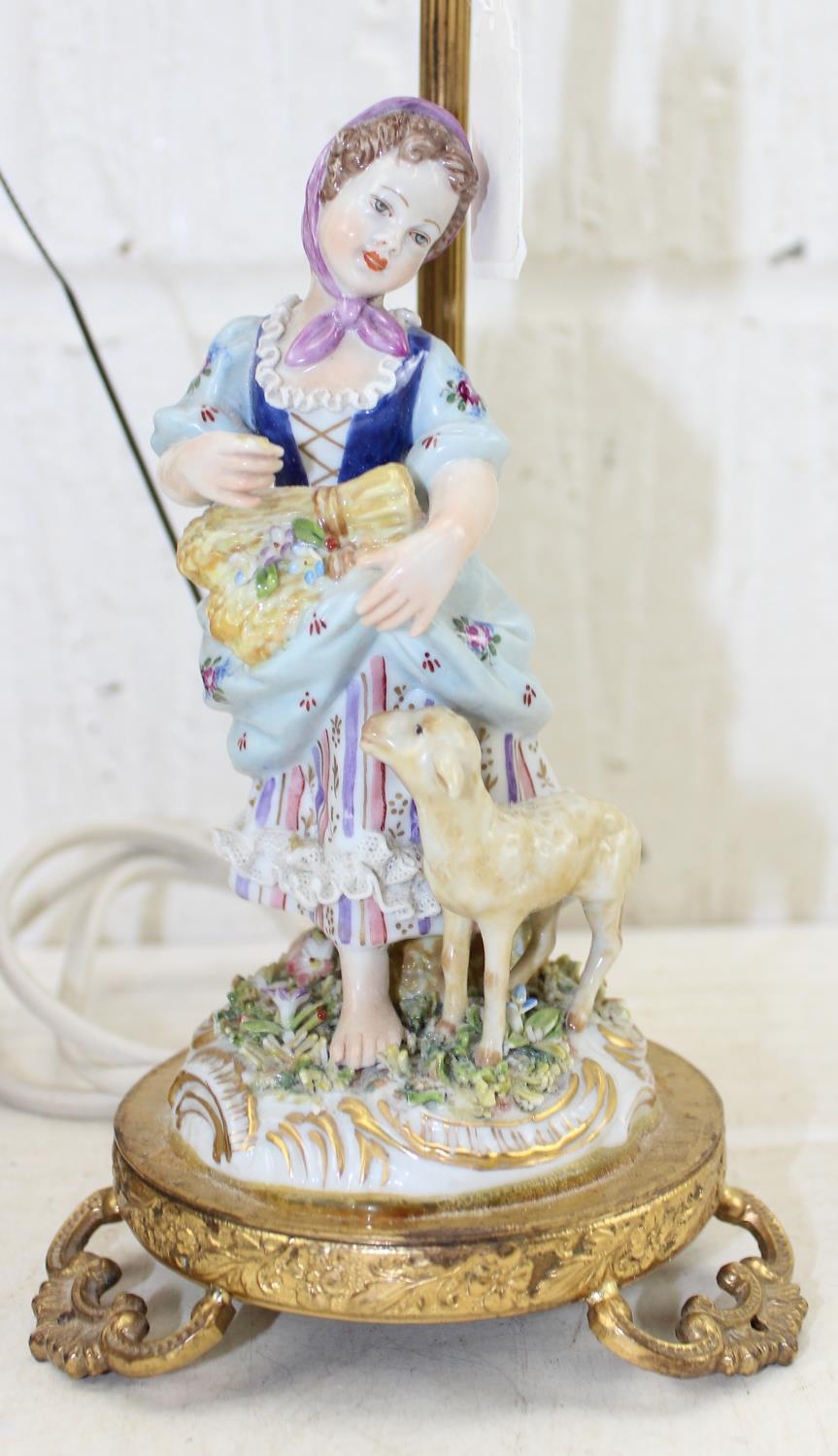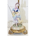 A pair of porcelain figural table lamps formed as girls with sheep, with gilt metal mounts