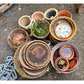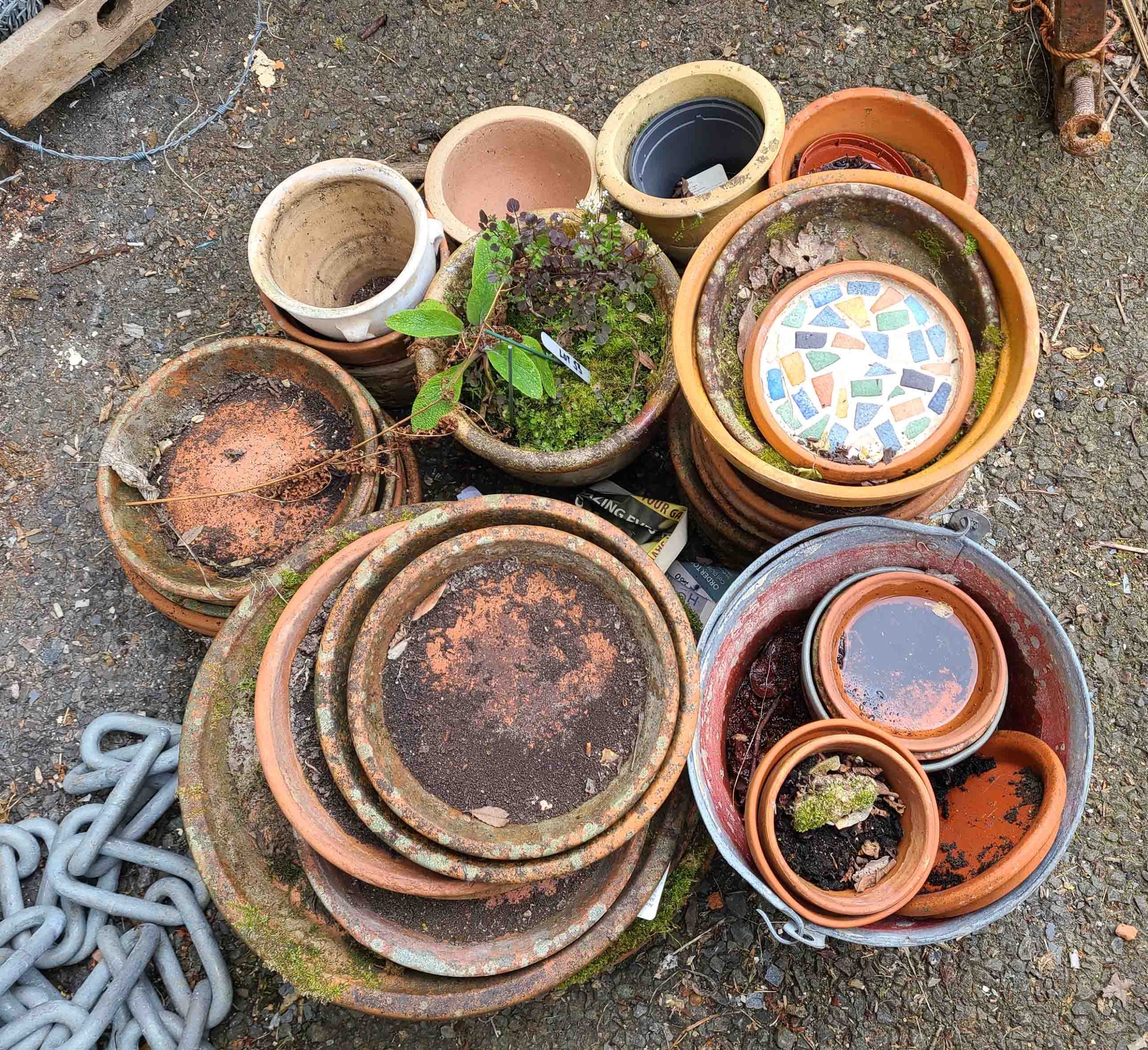 A quantity of assorted terracotta pot saucers, small garden pots and a galvanised metal bucket