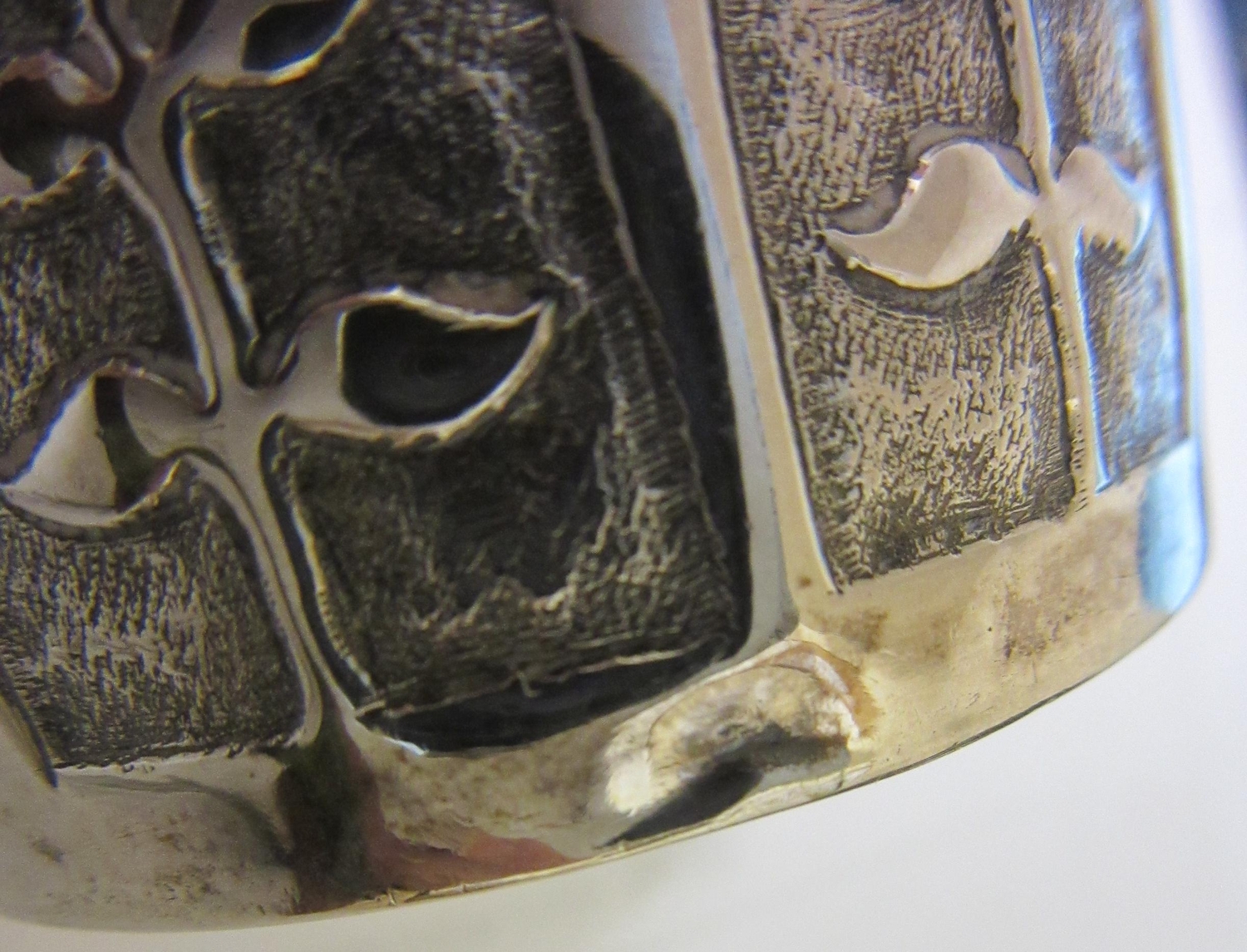 Stamped near rim with orb, A/14/13, generally good, no splitting. A dent near/on footrim (see images)