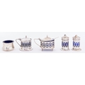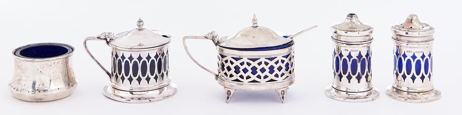 A George V three piece pierced silver condiment set, blue glass liner, pepperette 50mm h, by E Edmonds, Birmingham 1930, a similar silver mustard pot and a salt cellar, 2ozs 15dwts (5)