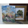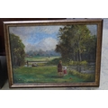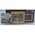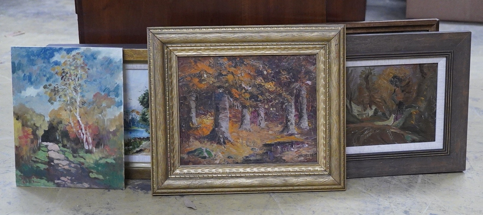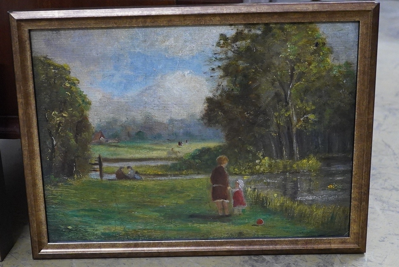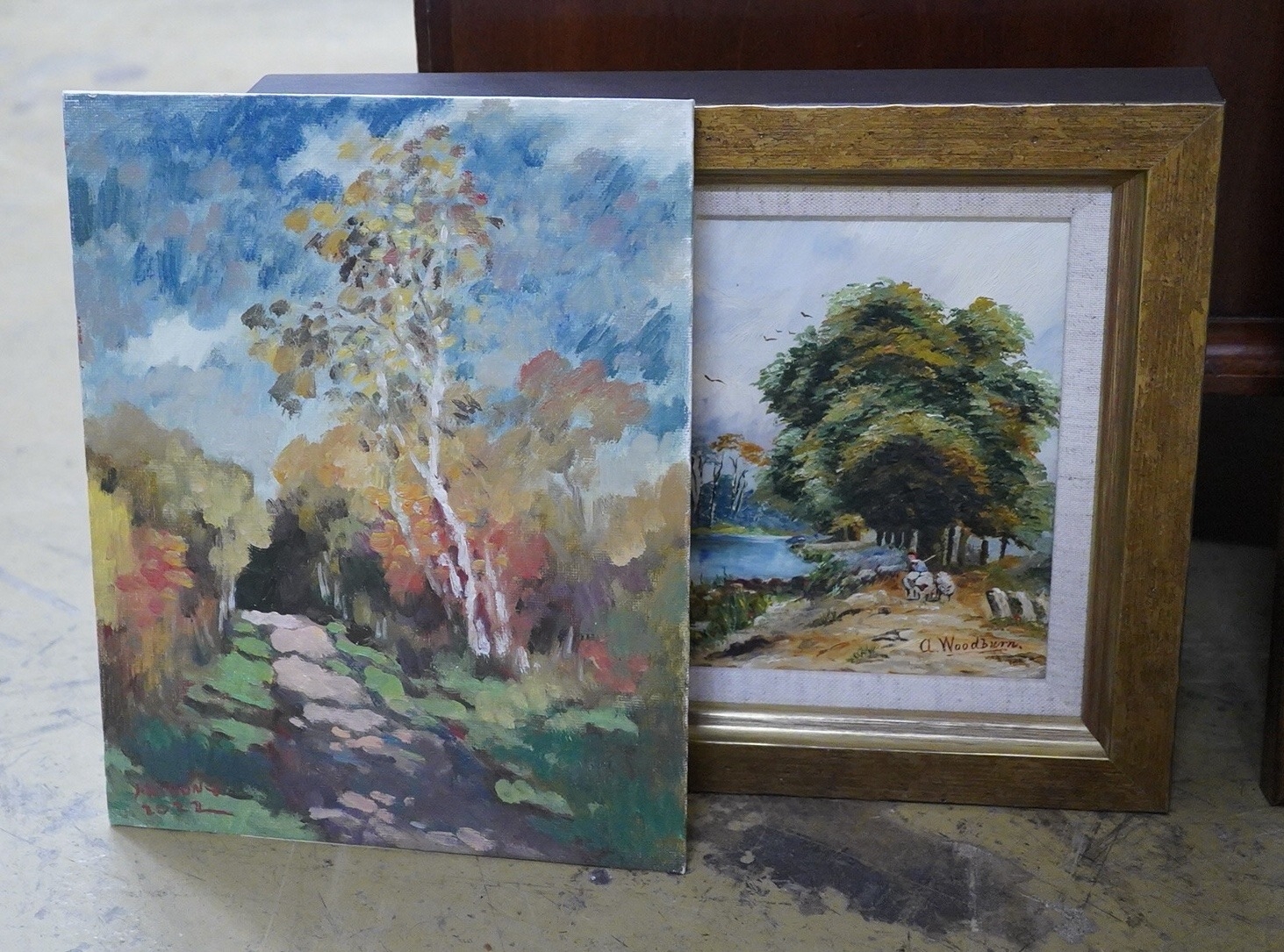A collection of vintage and contemporary oil landscapes to include a 20th century study of two figures beside a lake and a riverscape by A. Woodburn, (5)