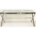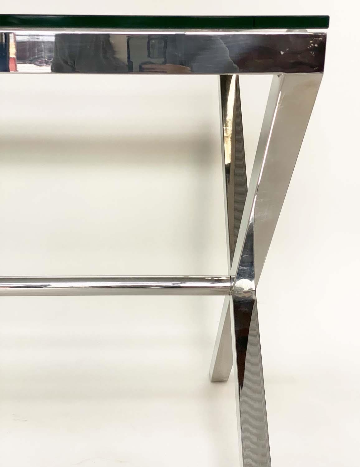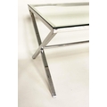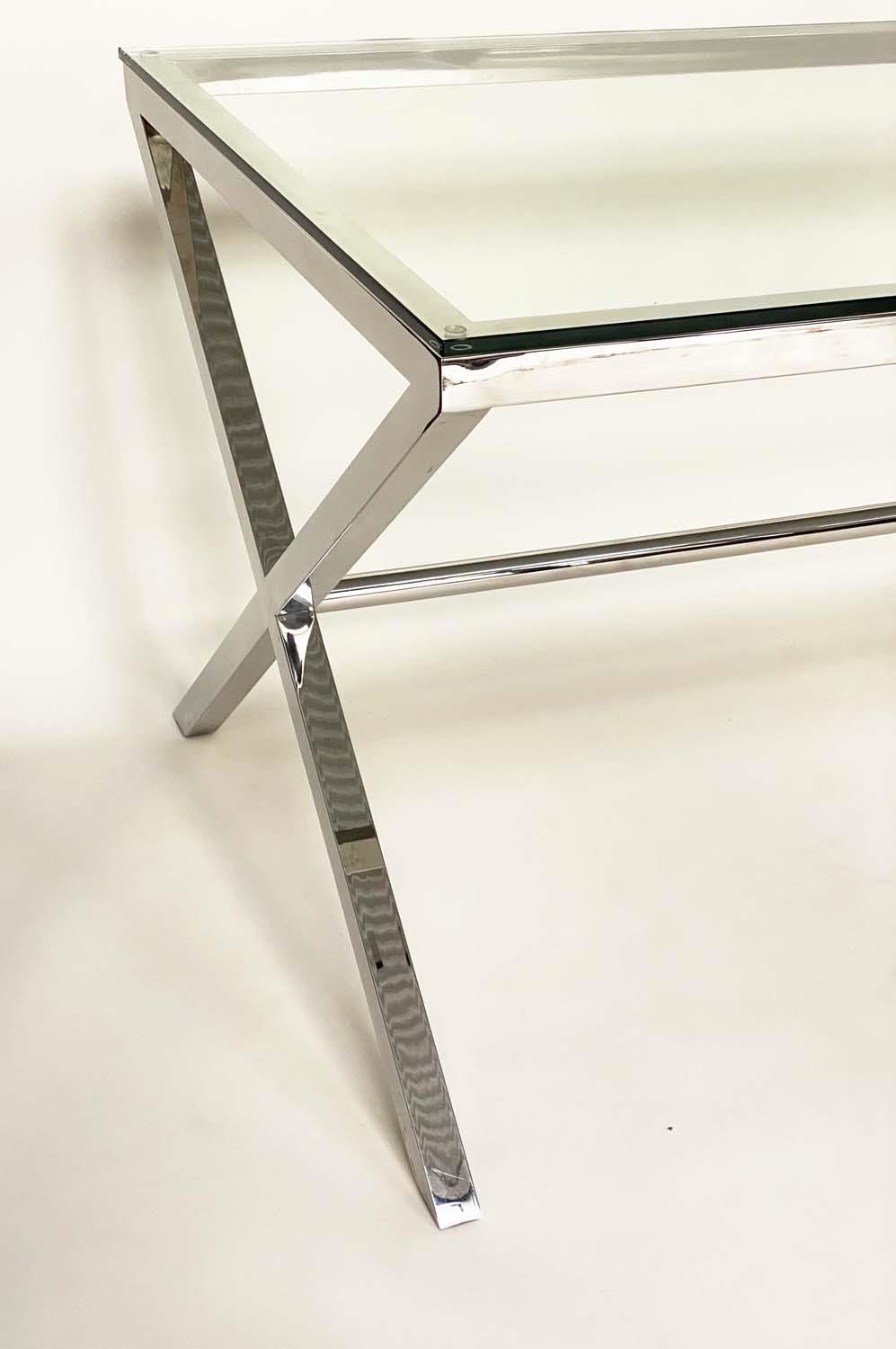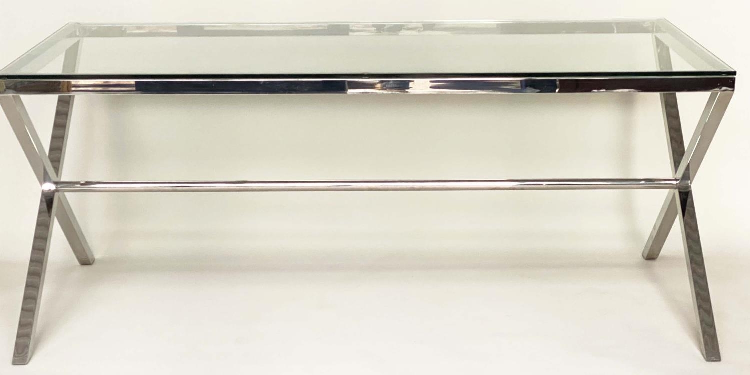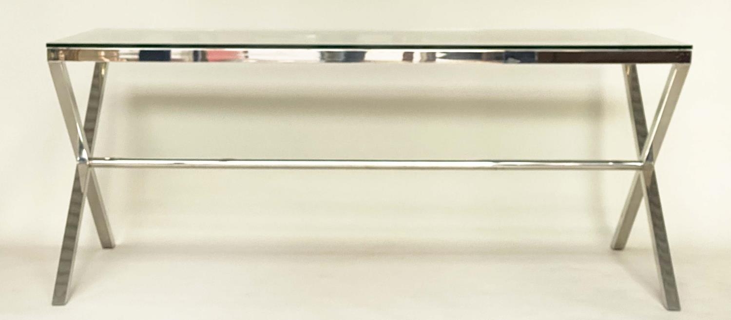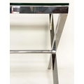DESK/WRITING TABLE BY OKA, rectangular plate glass raised upon chromium plated x frame support, with stretcher, 180cm W x 90cm D x 75cm H.