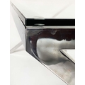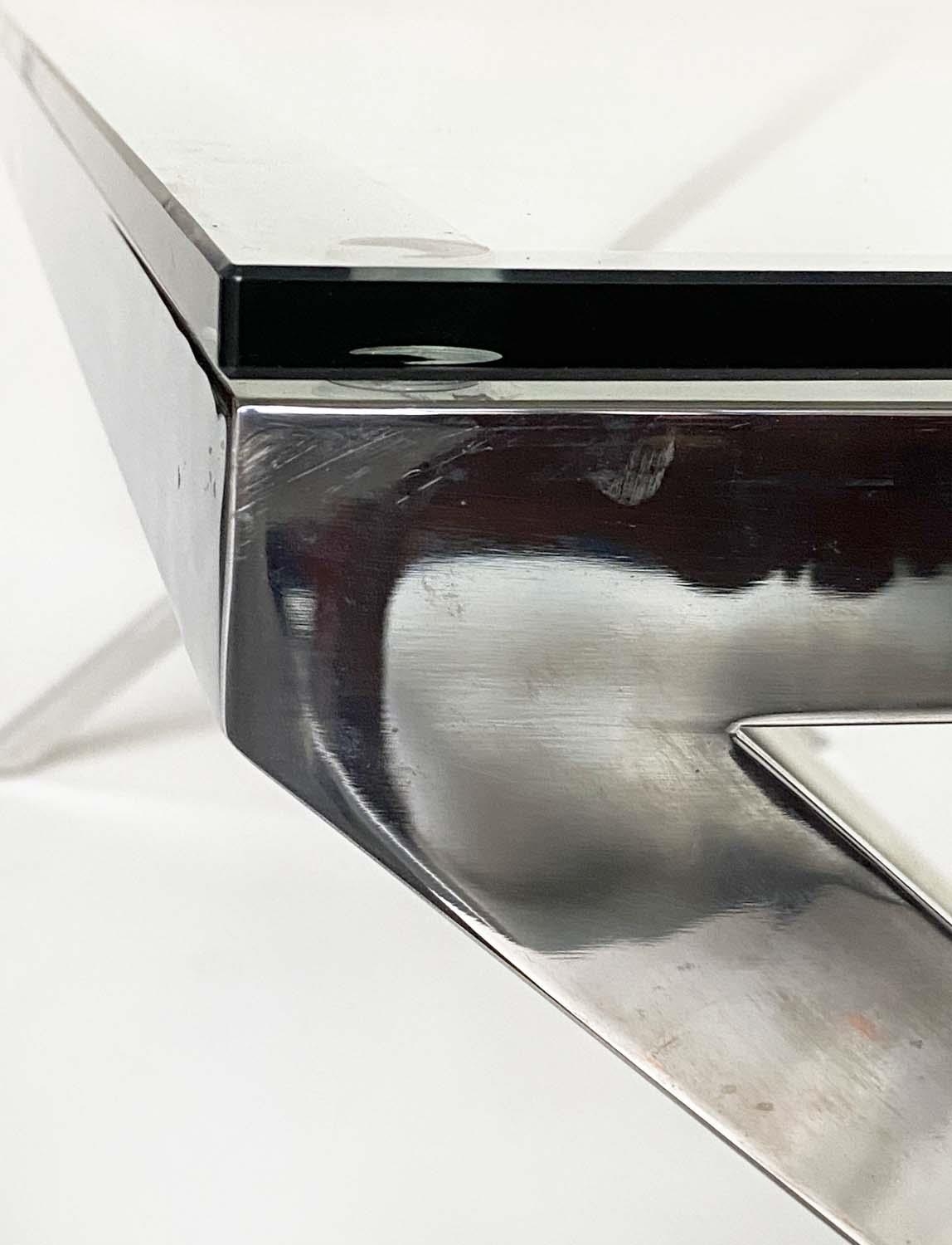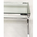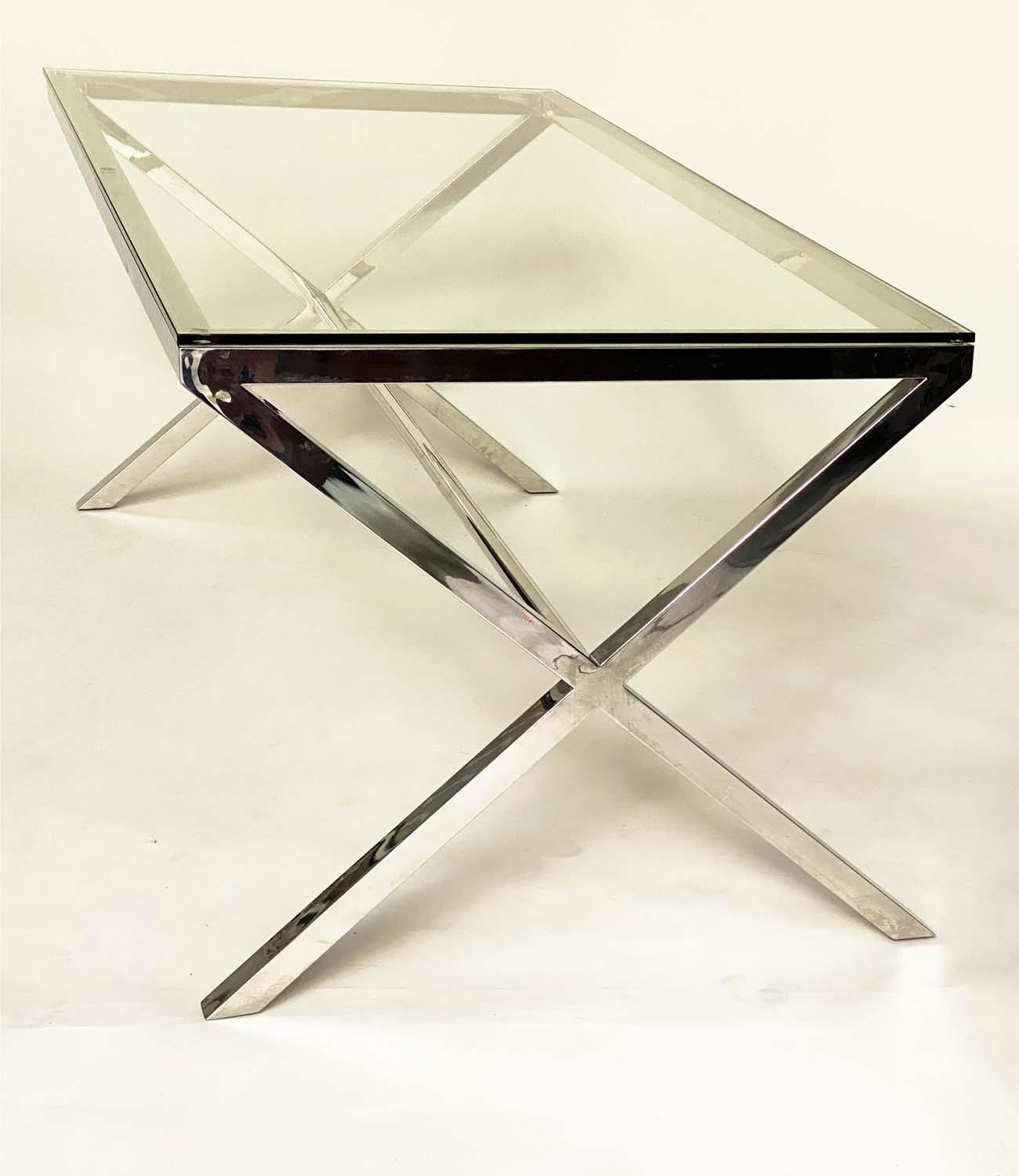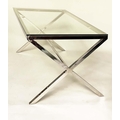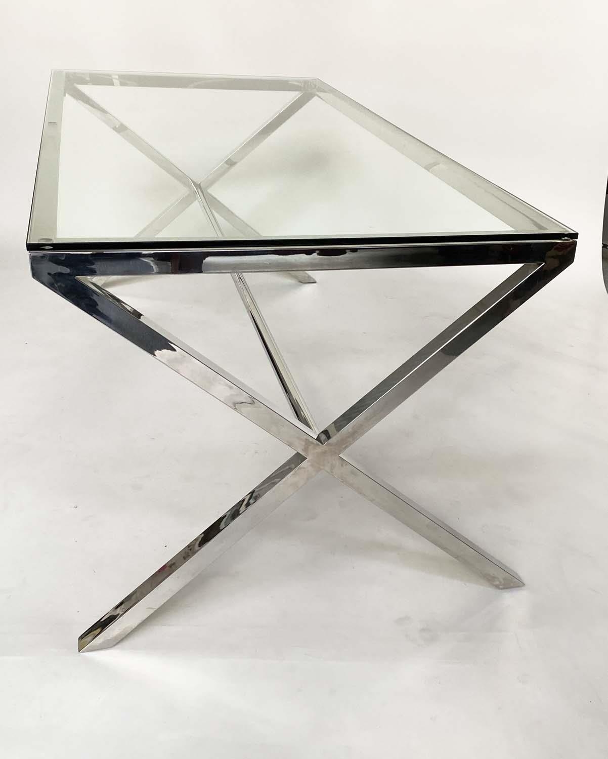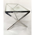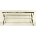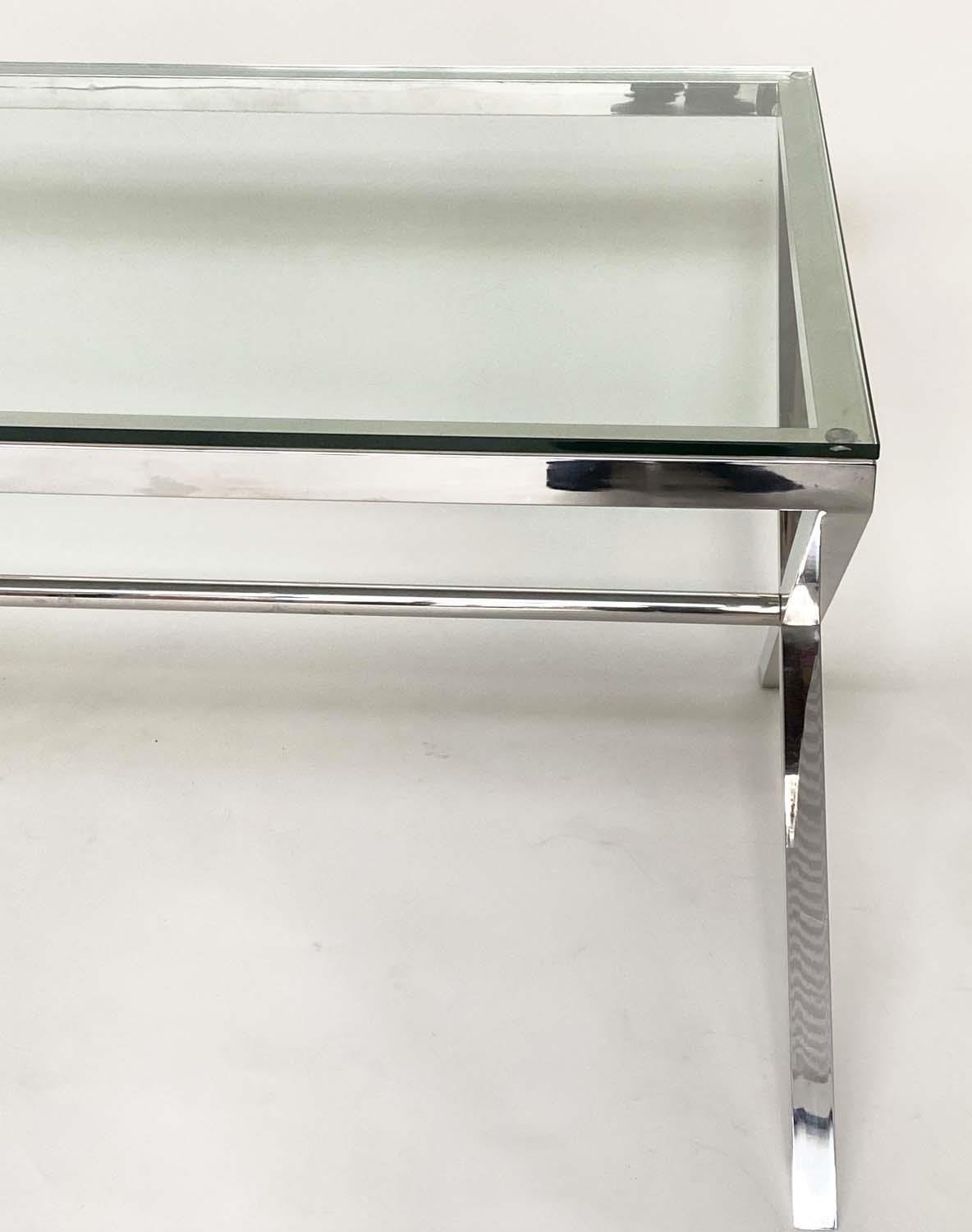 DESK/WRITING TABLE BY OKA, rectangular plate glass raised upon chromium plated x frame support, with stretcher, 180cm W x 90cm D x 75cm H.