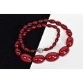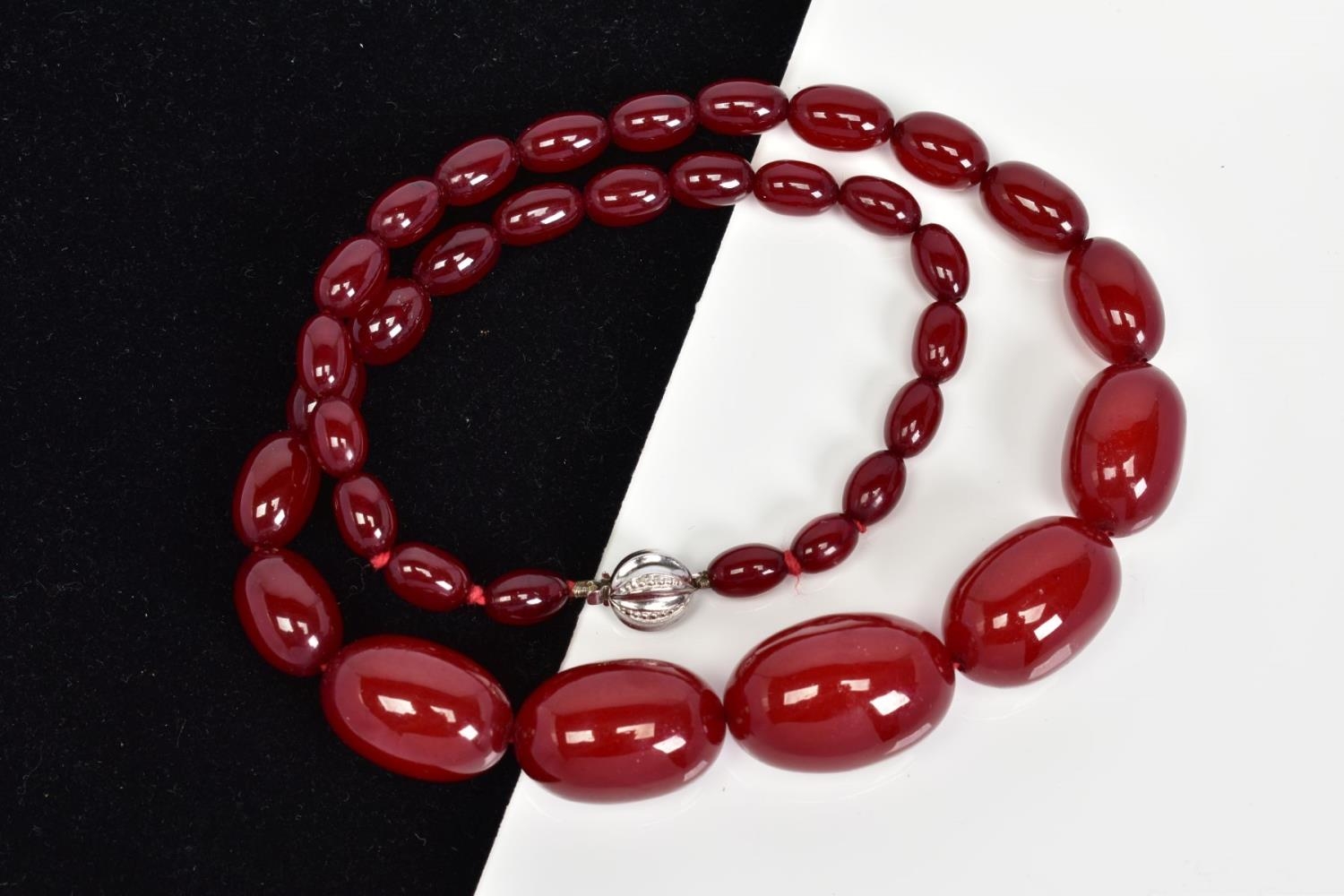 A RED PLASTIC BEAD NECKLACE, designed as thirty six graduated barrel shape beads measuring approximately 10mm to 29mm, tot the circular push piece clasp, clasp stamped 925, length 520mm, approximate weight 45.7 grams