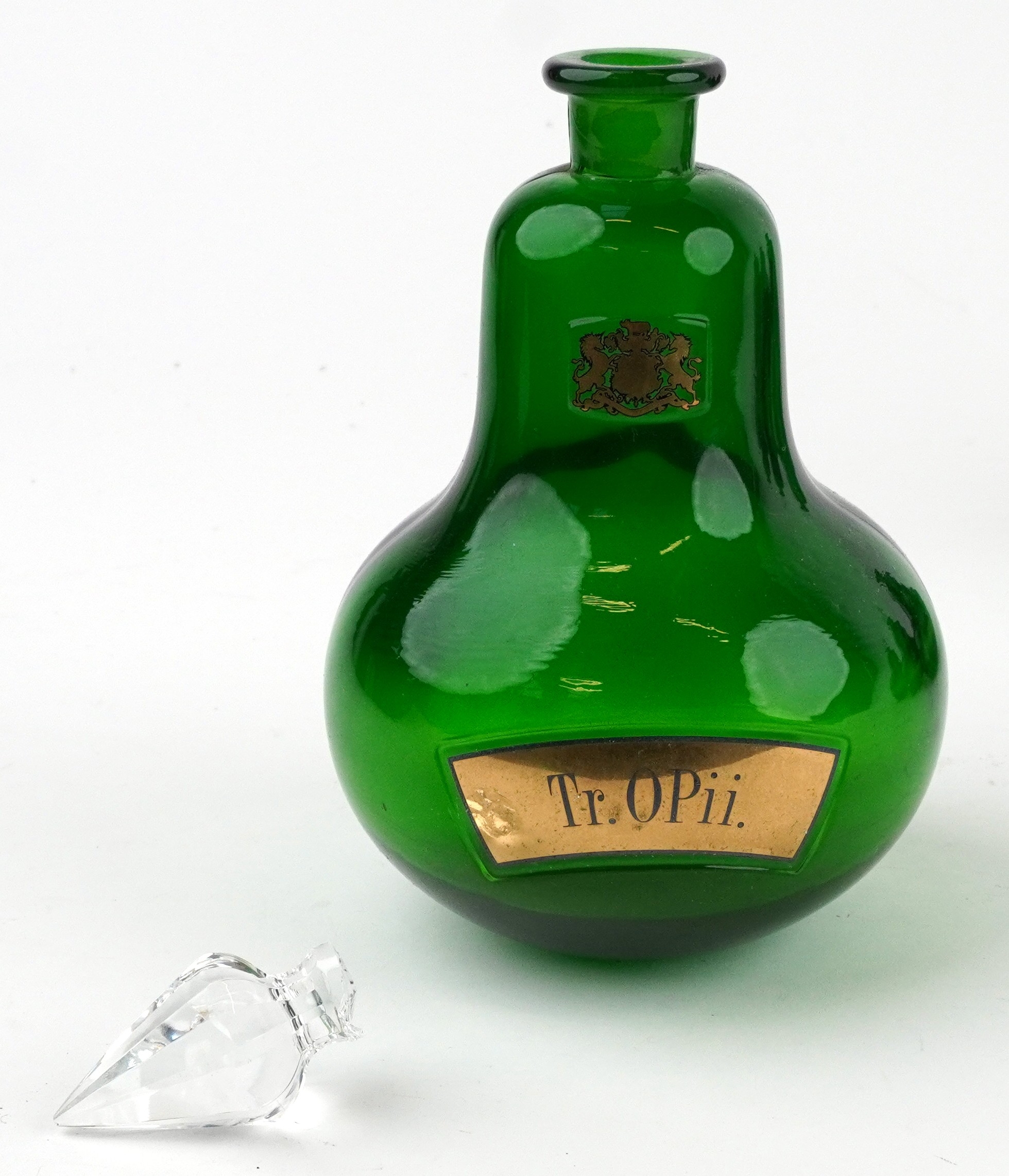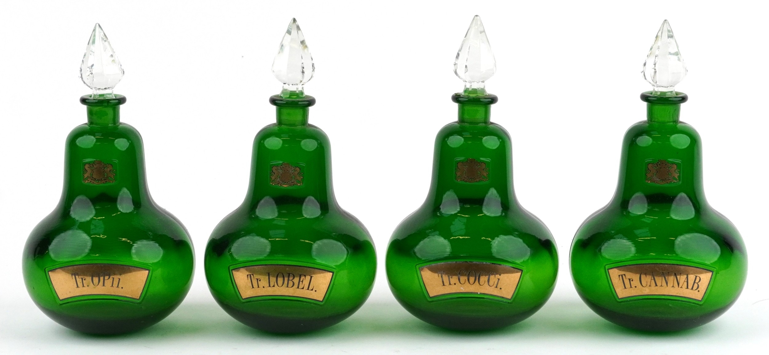 A set of four Royal Pharmaceutical Society emerald glass apothecary bottles with cut glass stoppers, each bearing gilded crest, 24cm high.