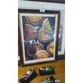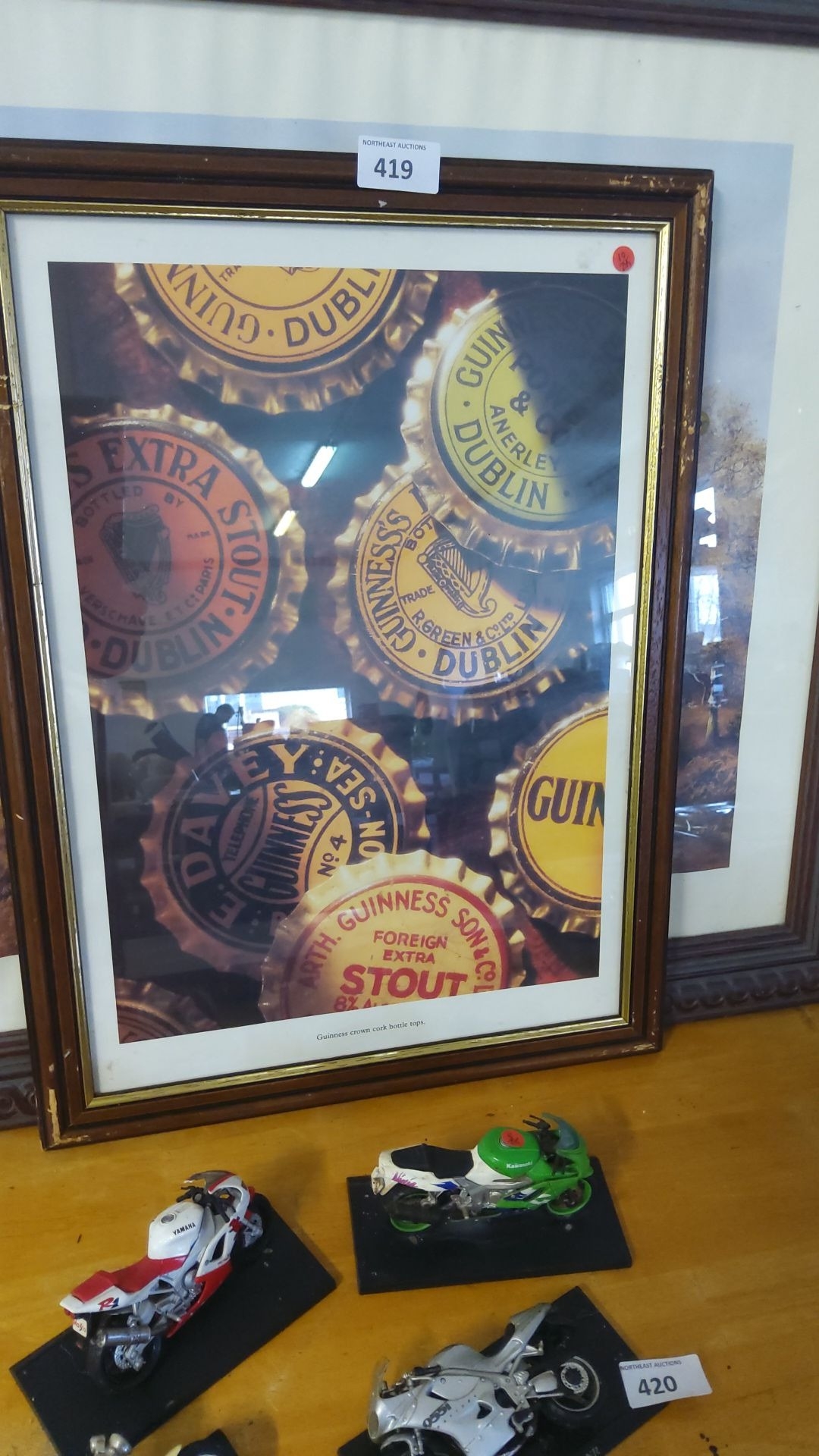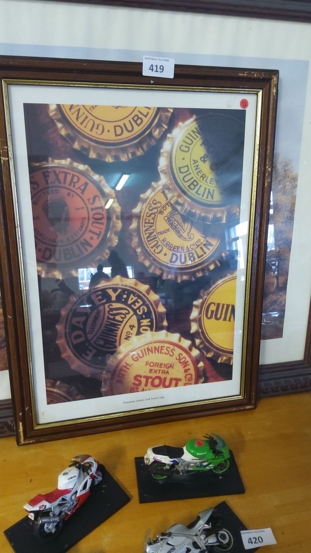 Framed original print of Guinness bottle caps showcases vintage Dublin stout branding.