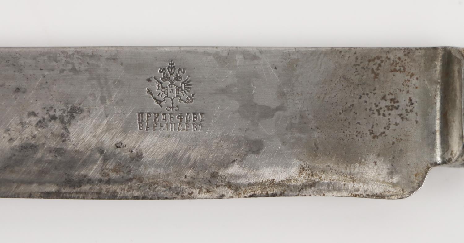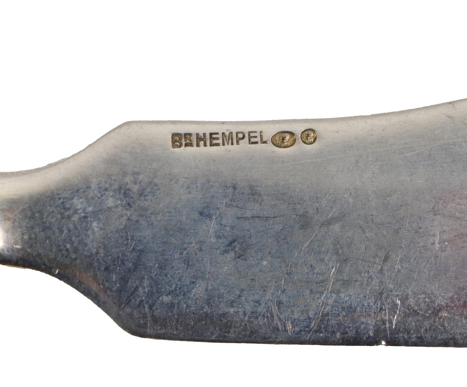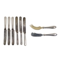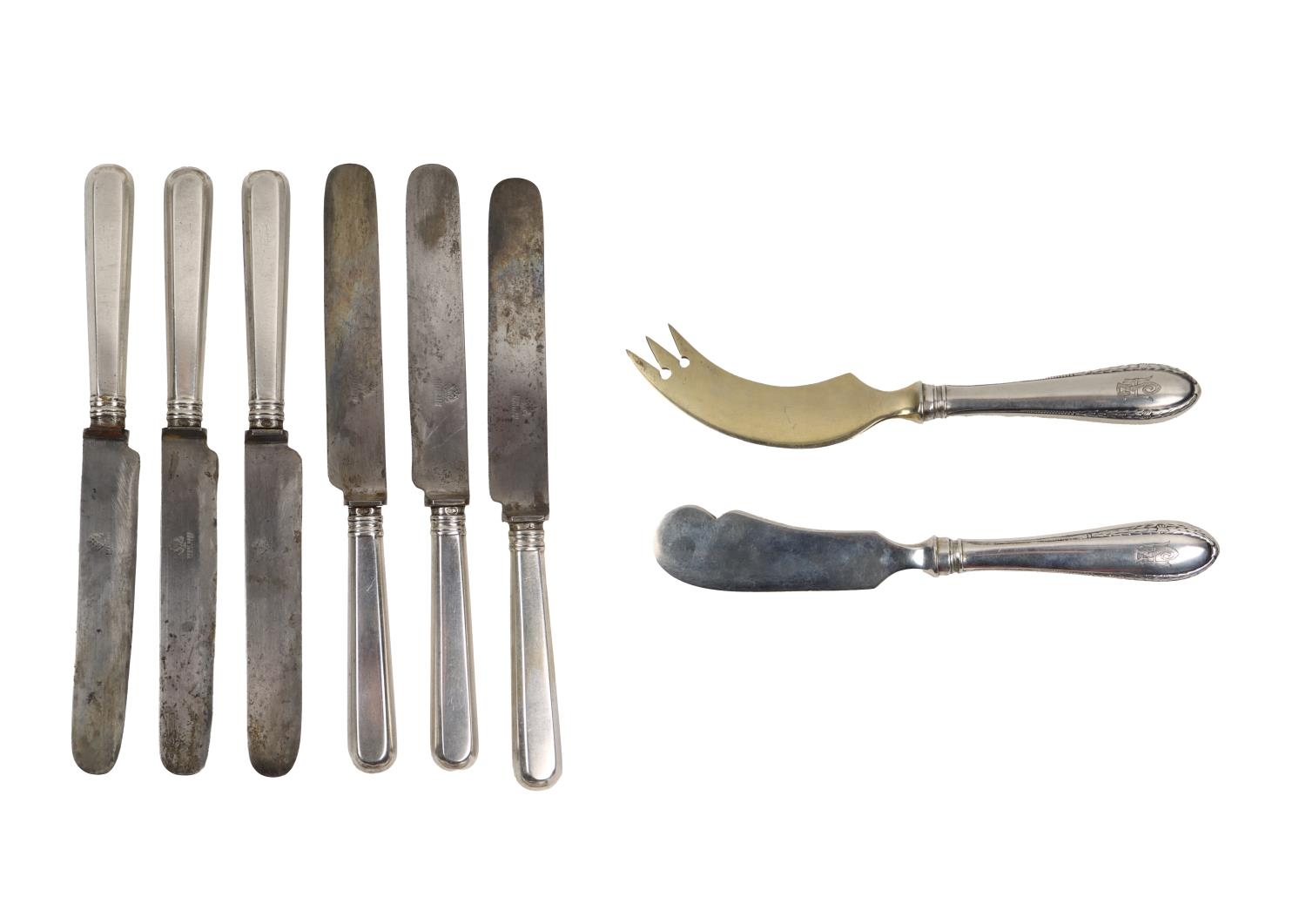 Silverware: A set of 6 Russian silver handled steel blade Table Knives, hallmarked, with stamped blades, c. 1908-1907; also Polish Butter and Cheese Servers, hallmarked Warsaw, Br. Hempel, c. 1931. (8)