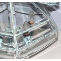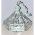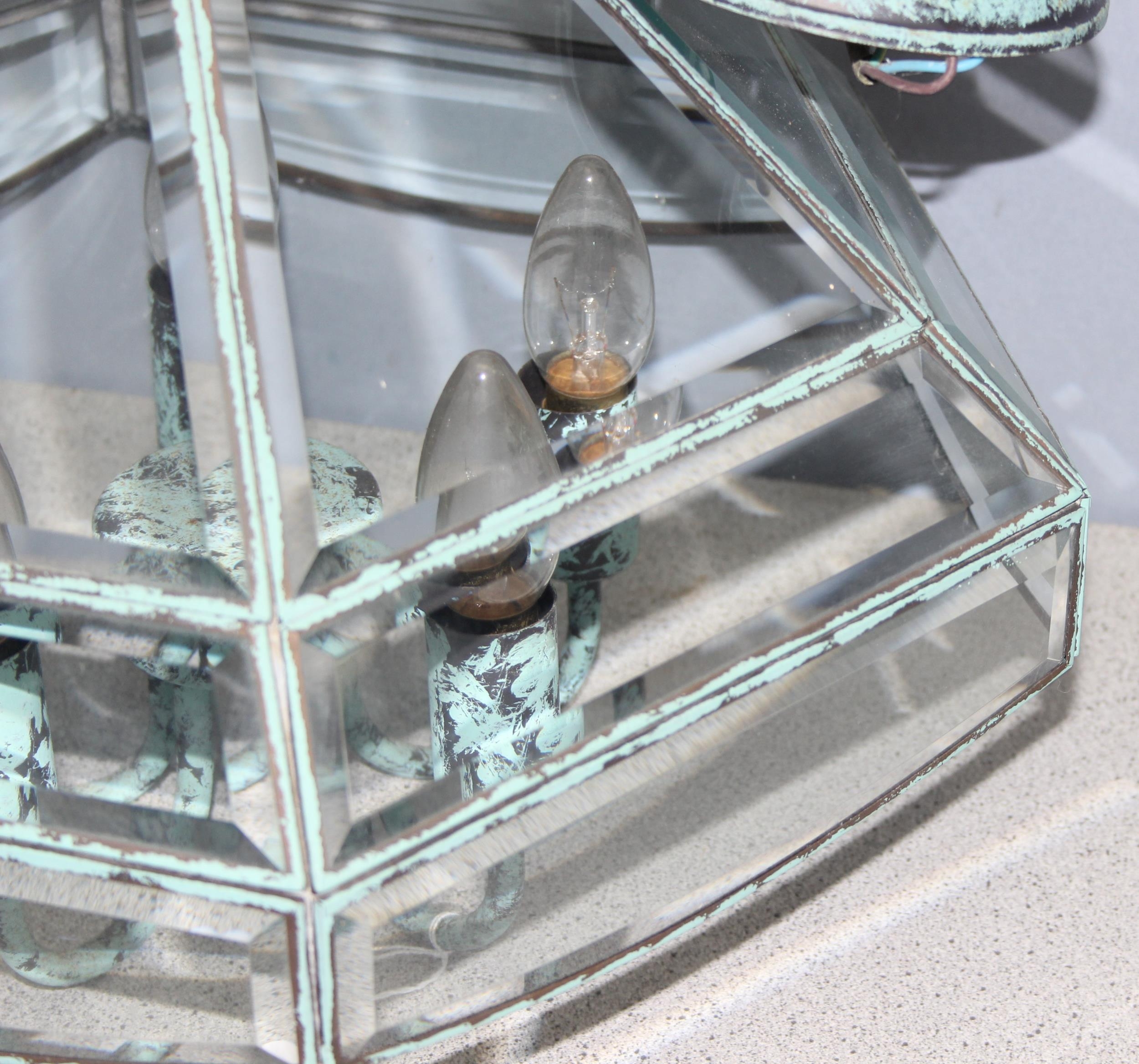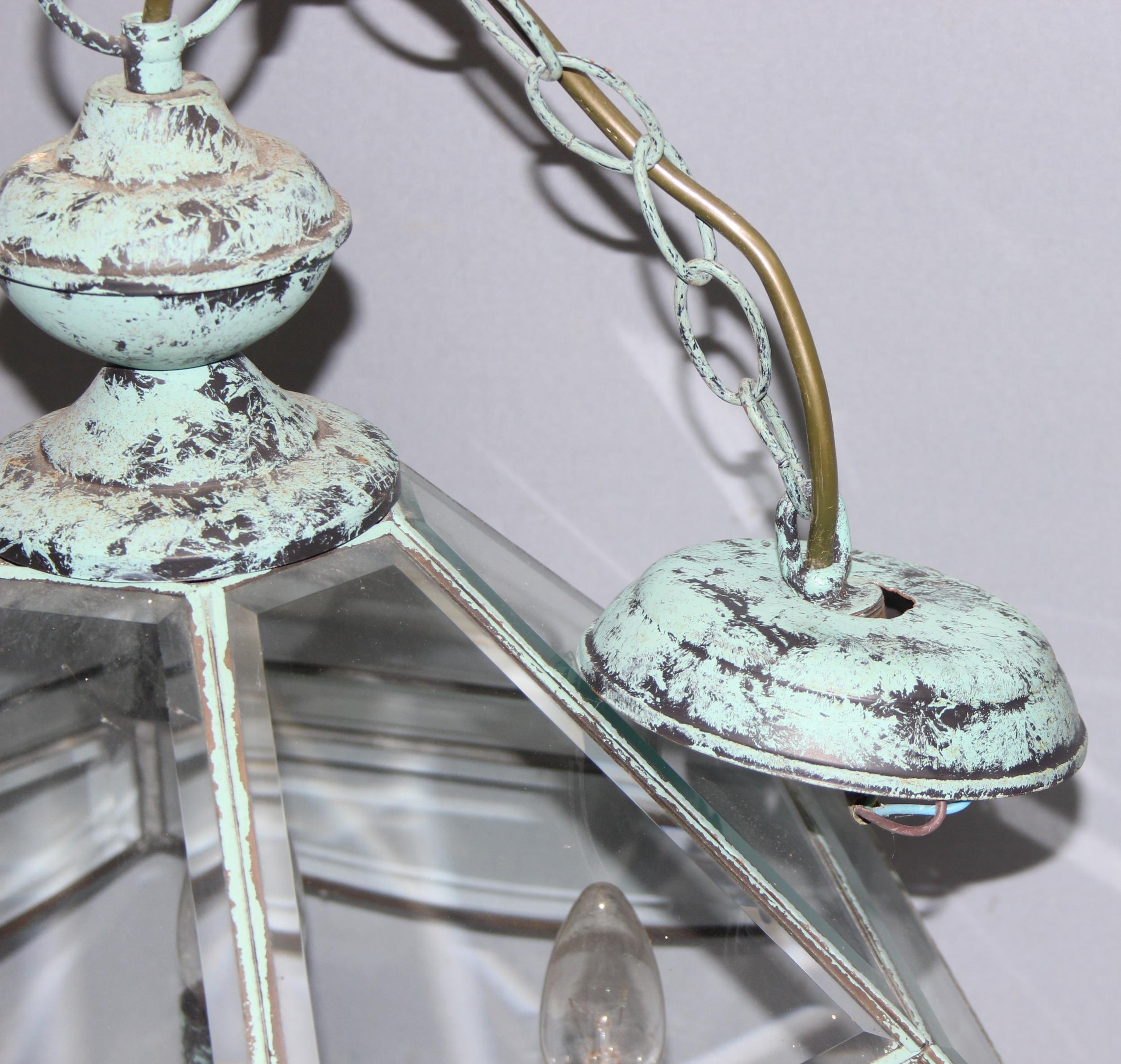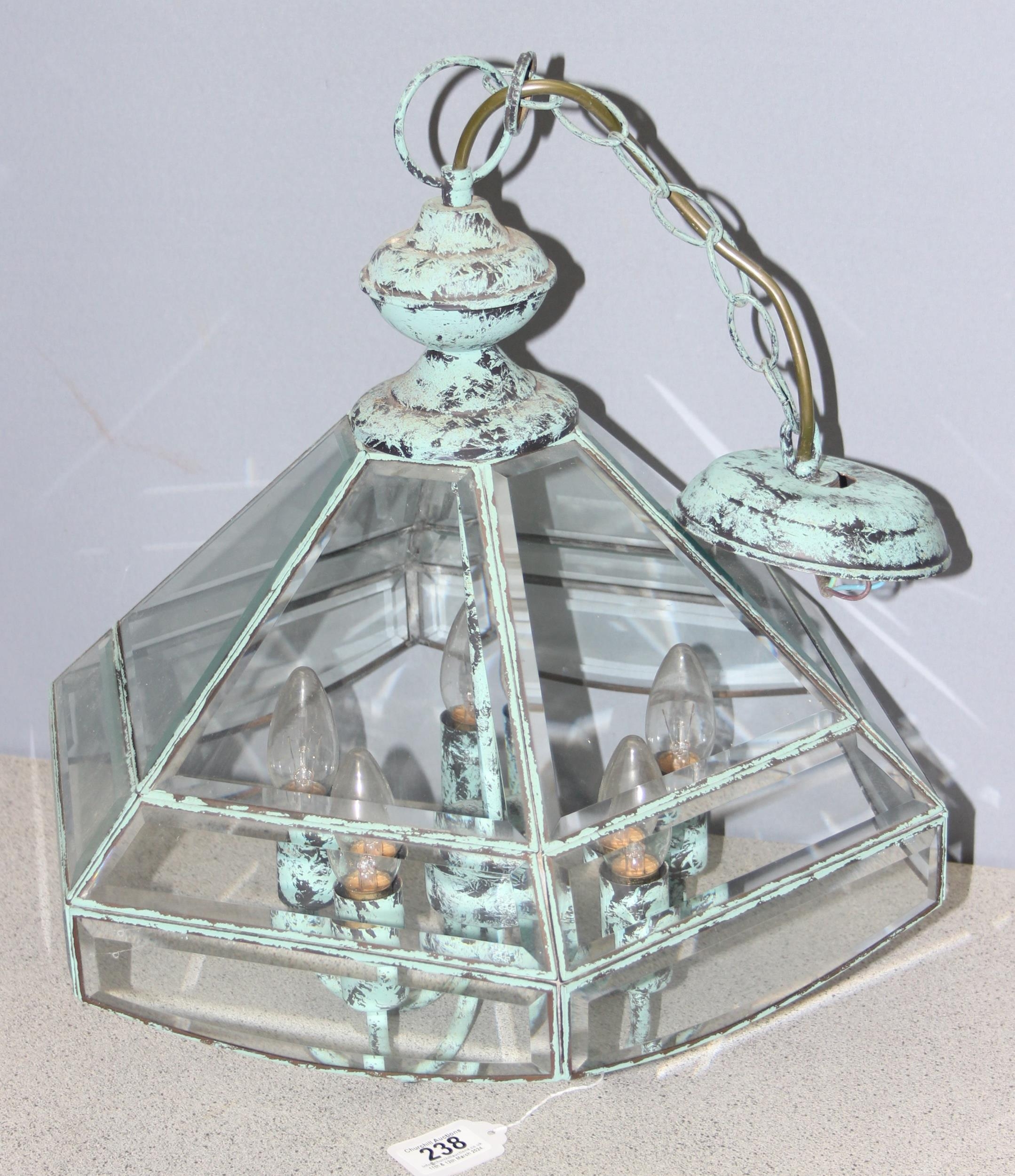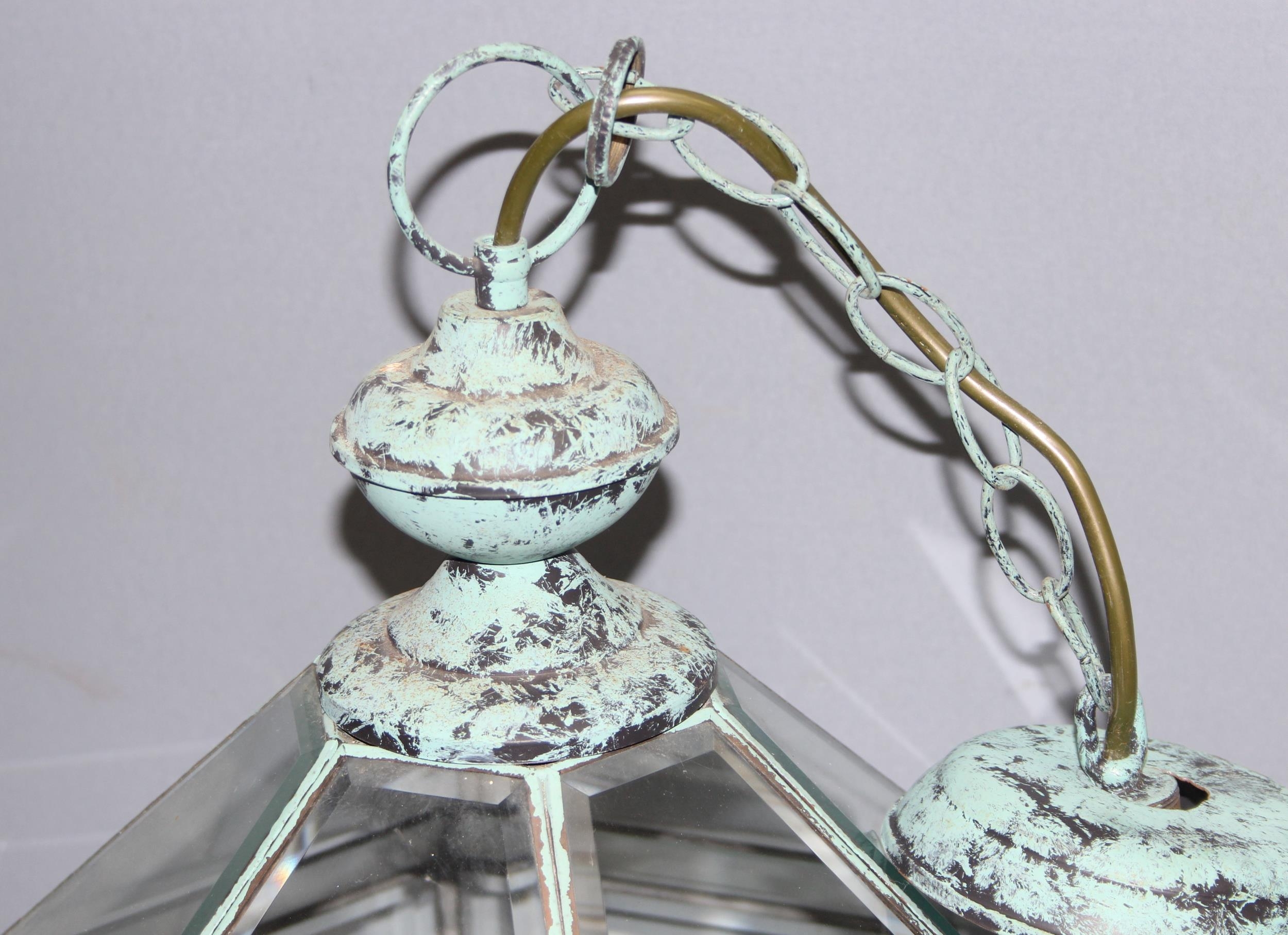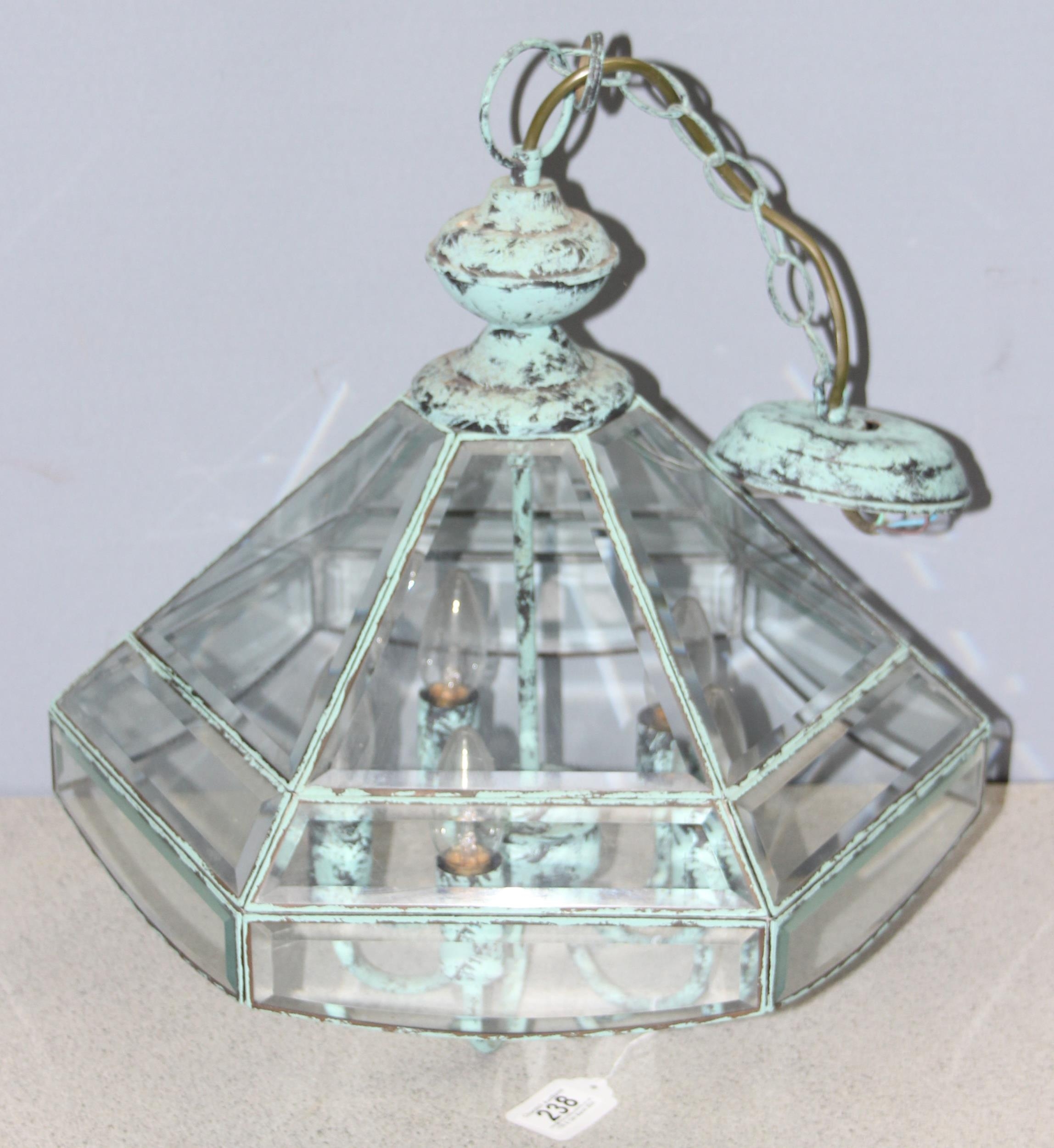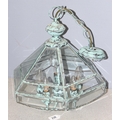Distressed Verdigris copper and glass pendant light fitting, approx 43cm tall, 46cm with the fitting