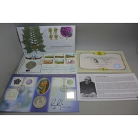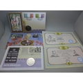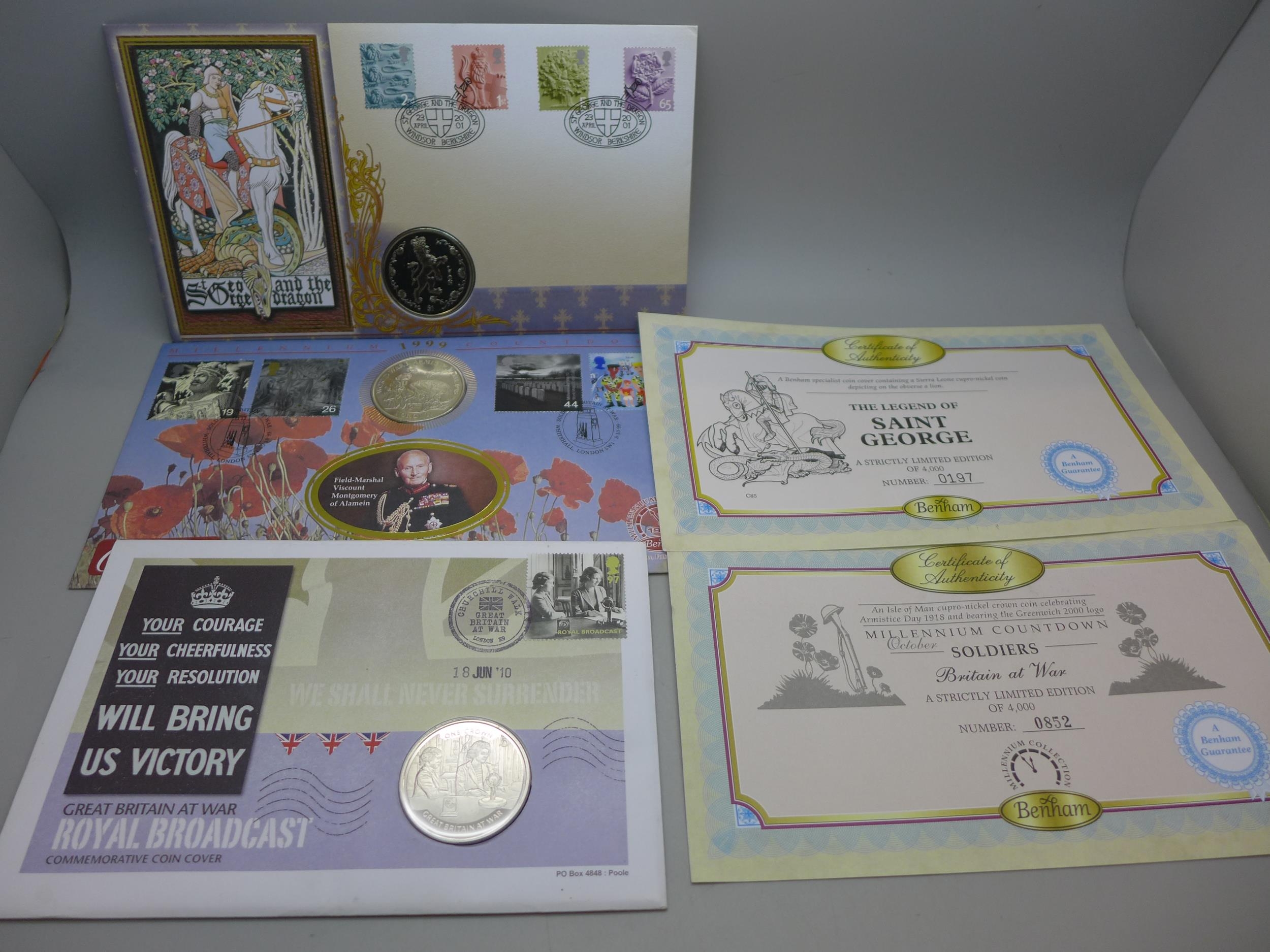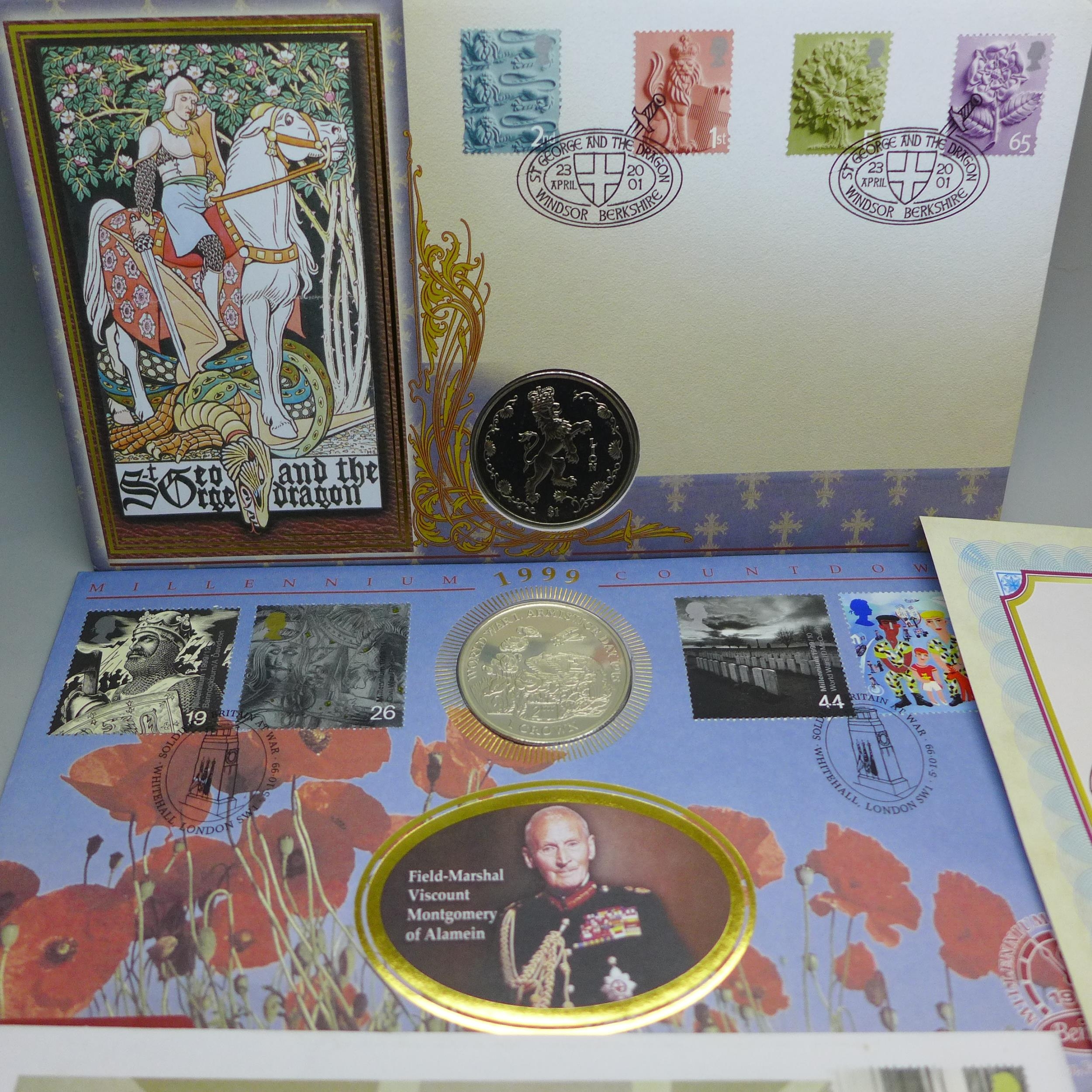 Three coin covers - Royal Broadcast We Shall Never Surrender with 1 crown coin, 1999 Millennium Countdown Benham cover with Crown, and a 2001 St George and The Dragon Benham cover with Sierra Leone $1 coin