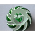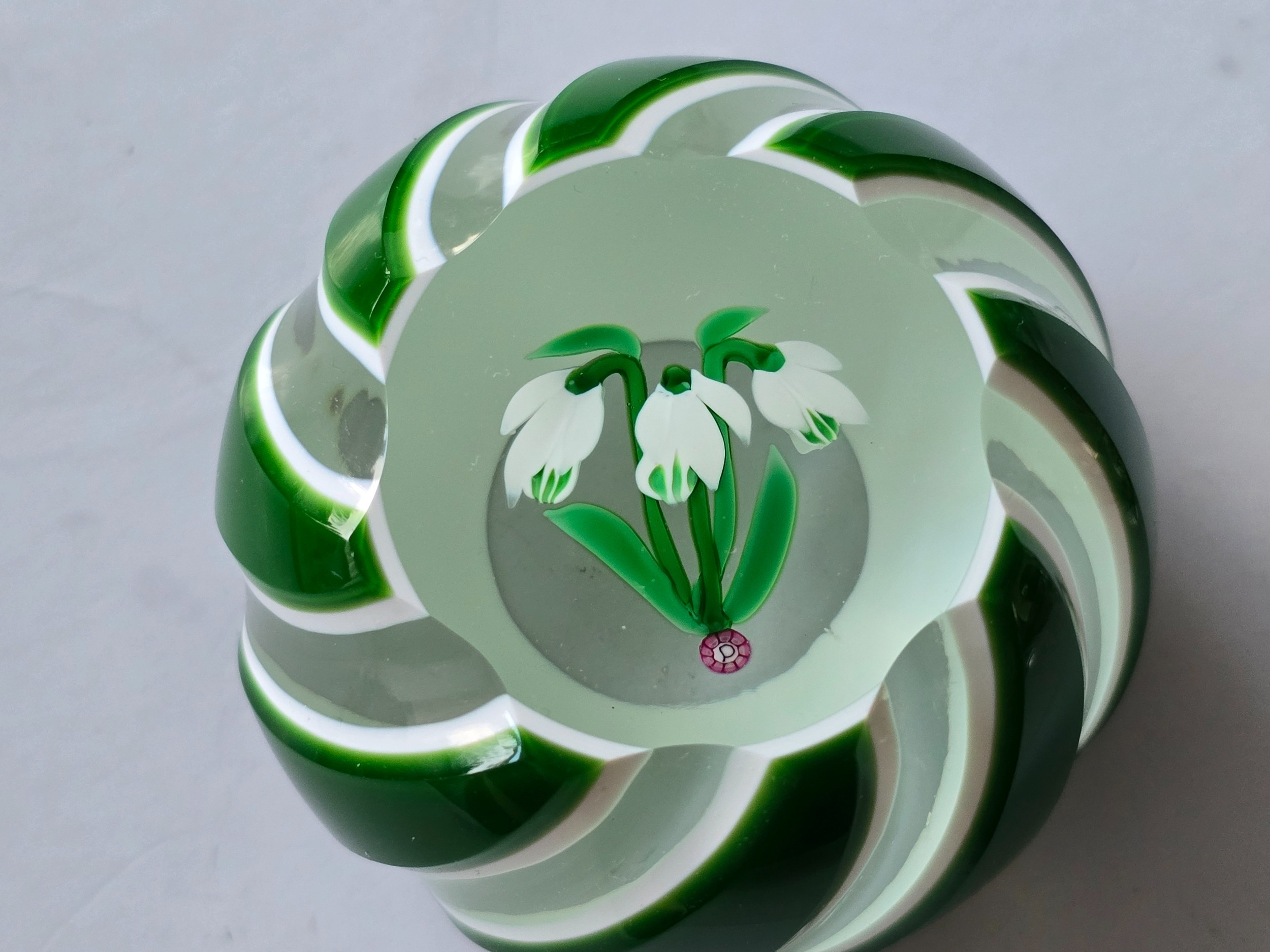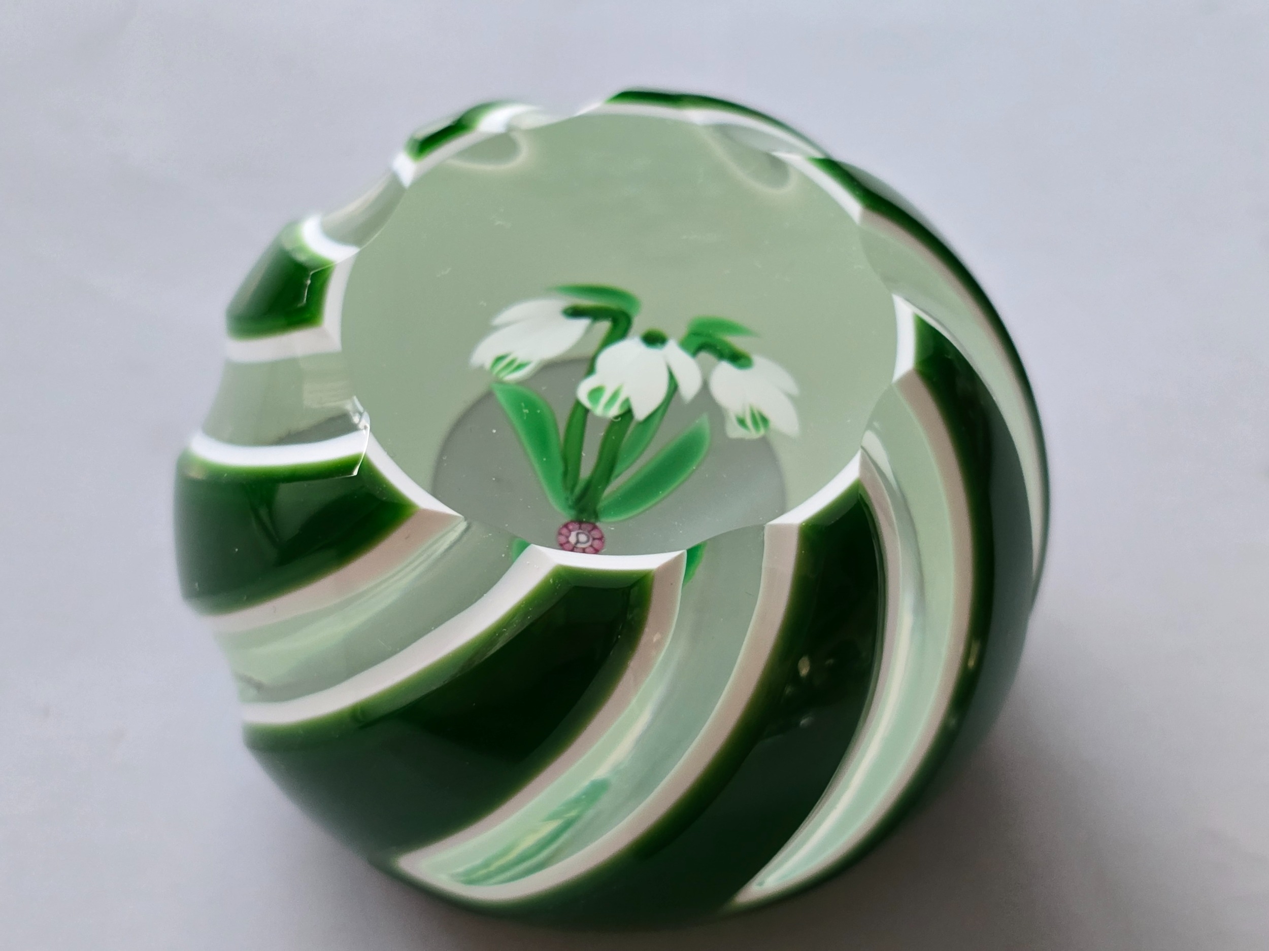 Valentines Gift: Perthshire paperweight - This is the 1987B paperweight from Perthshire limited annual range. A lovely winter/spring celebration, It features a snowdrop of 3 flowers, and an innovative green and white double overlay with spiral cutting. Small. Diam: 60mm or 2 3/8th ins. Excellent condition. Boxed