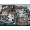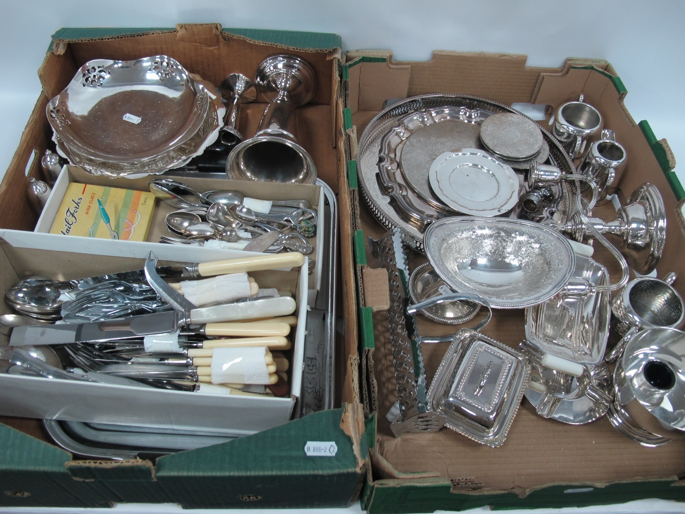 Silver-plated ware, in large quantity including flatware, flower vases, candelabra, serving plates & trays, various dishes etc. Two boxes.