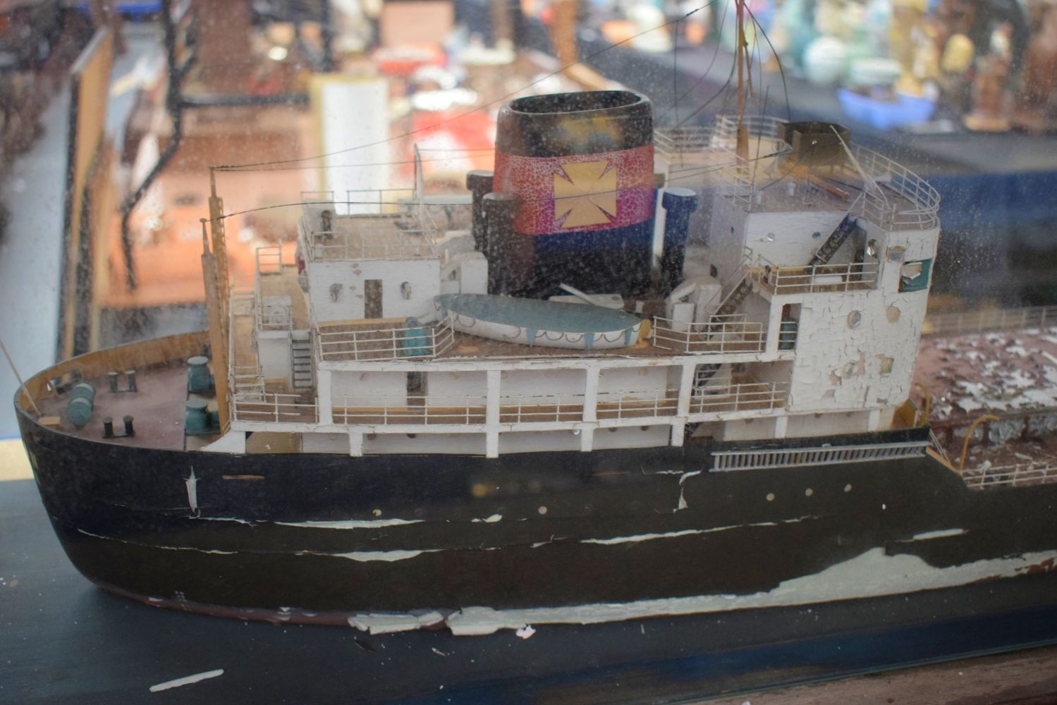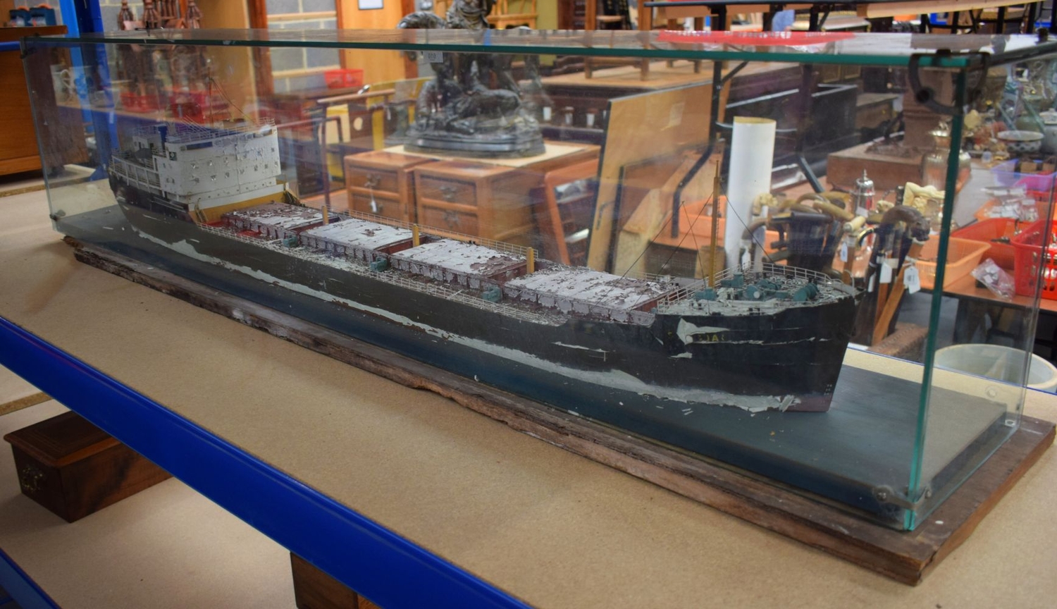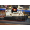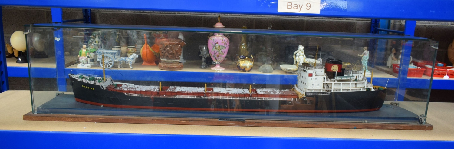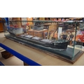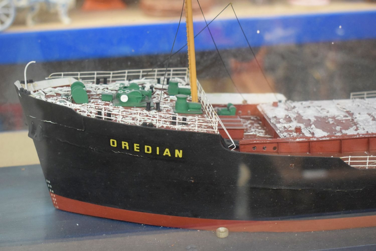 A VERY LARGE MID 20TH CENTURY PAINTED SCRATCH BUILT MODEL BOAT OF OREDIAN modelled upon a painted wooden plinth, within a glass dome. 150 cm x 35 cm.