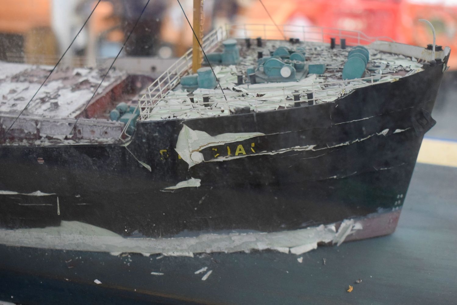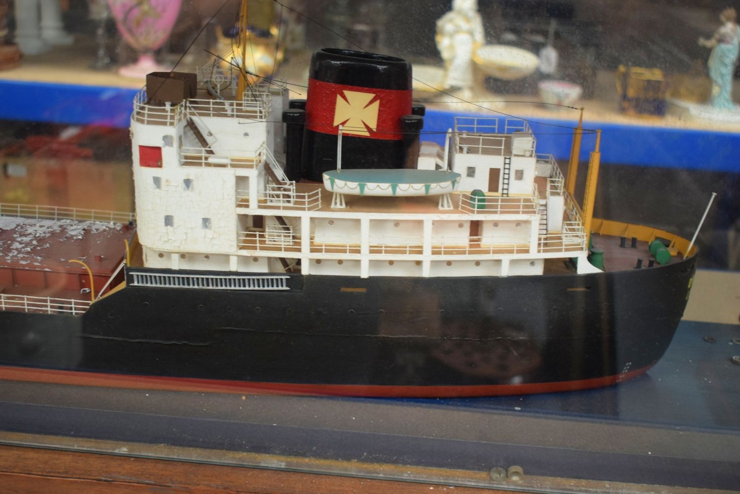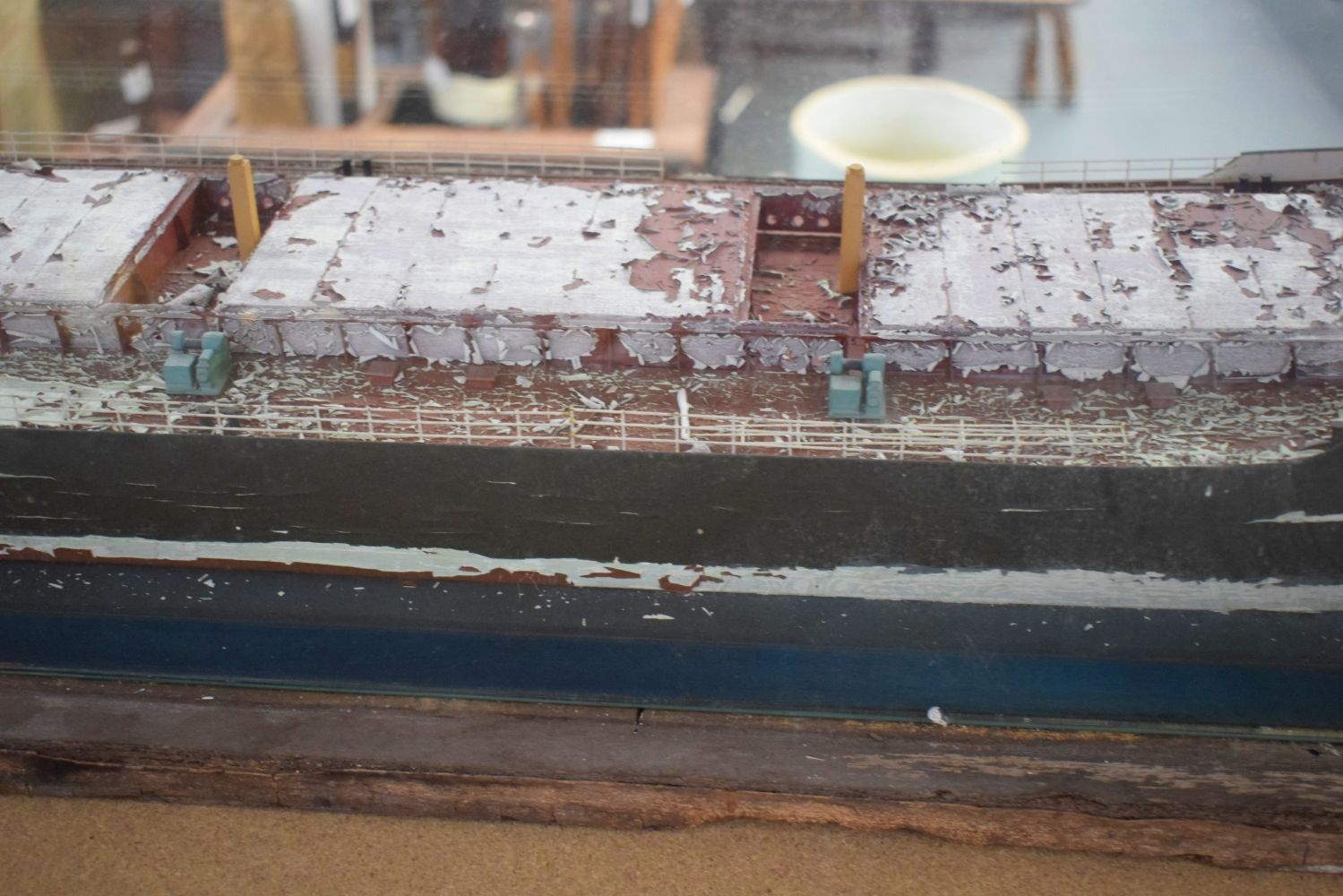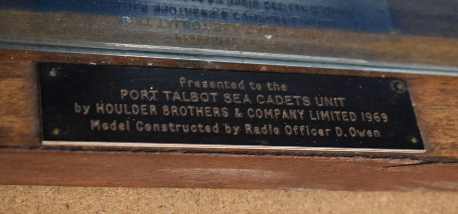 A VERY LARGE MID 20TH CENTURY PAINTED SCRATCH BUILT MODEL BOAT OF OREDIAN modelled upon a painted wooden plinth, within a glass dome. 150 cm x 35 cm.
