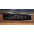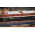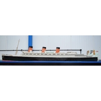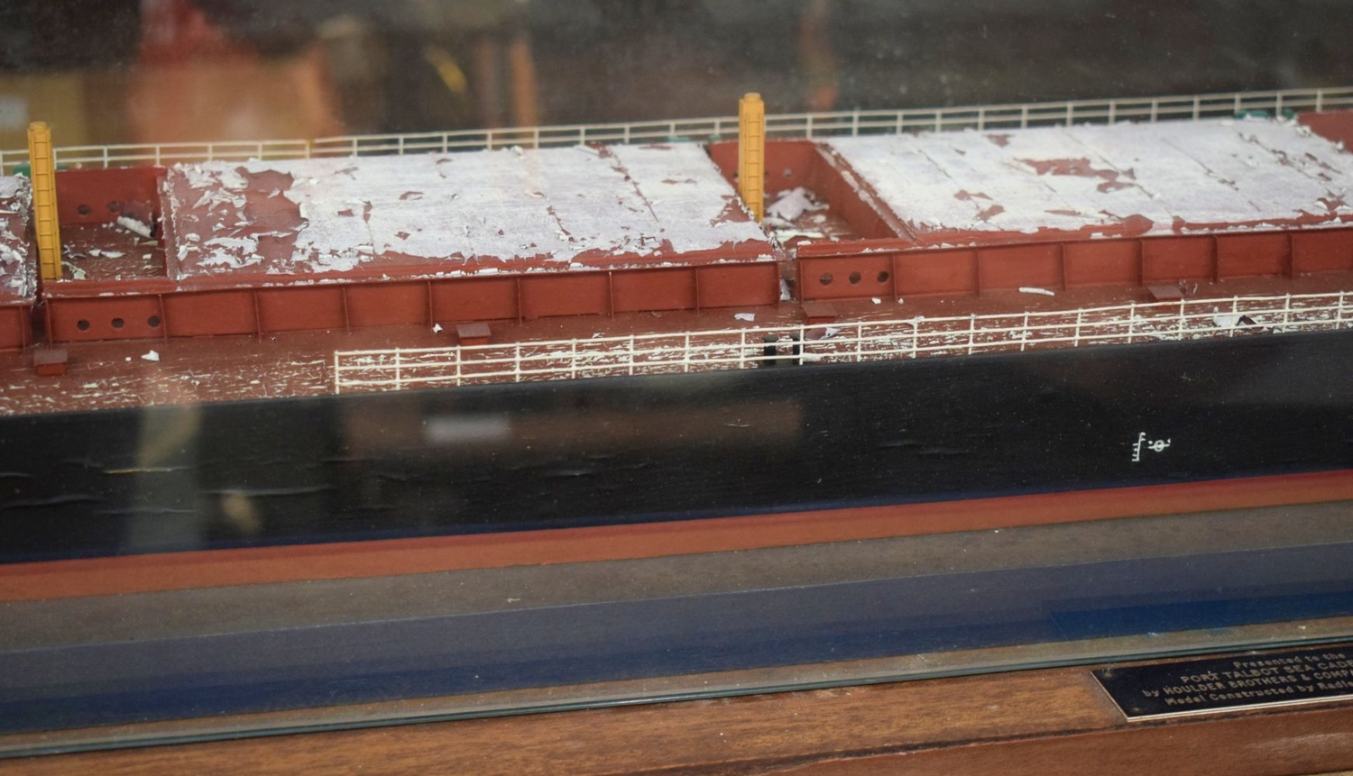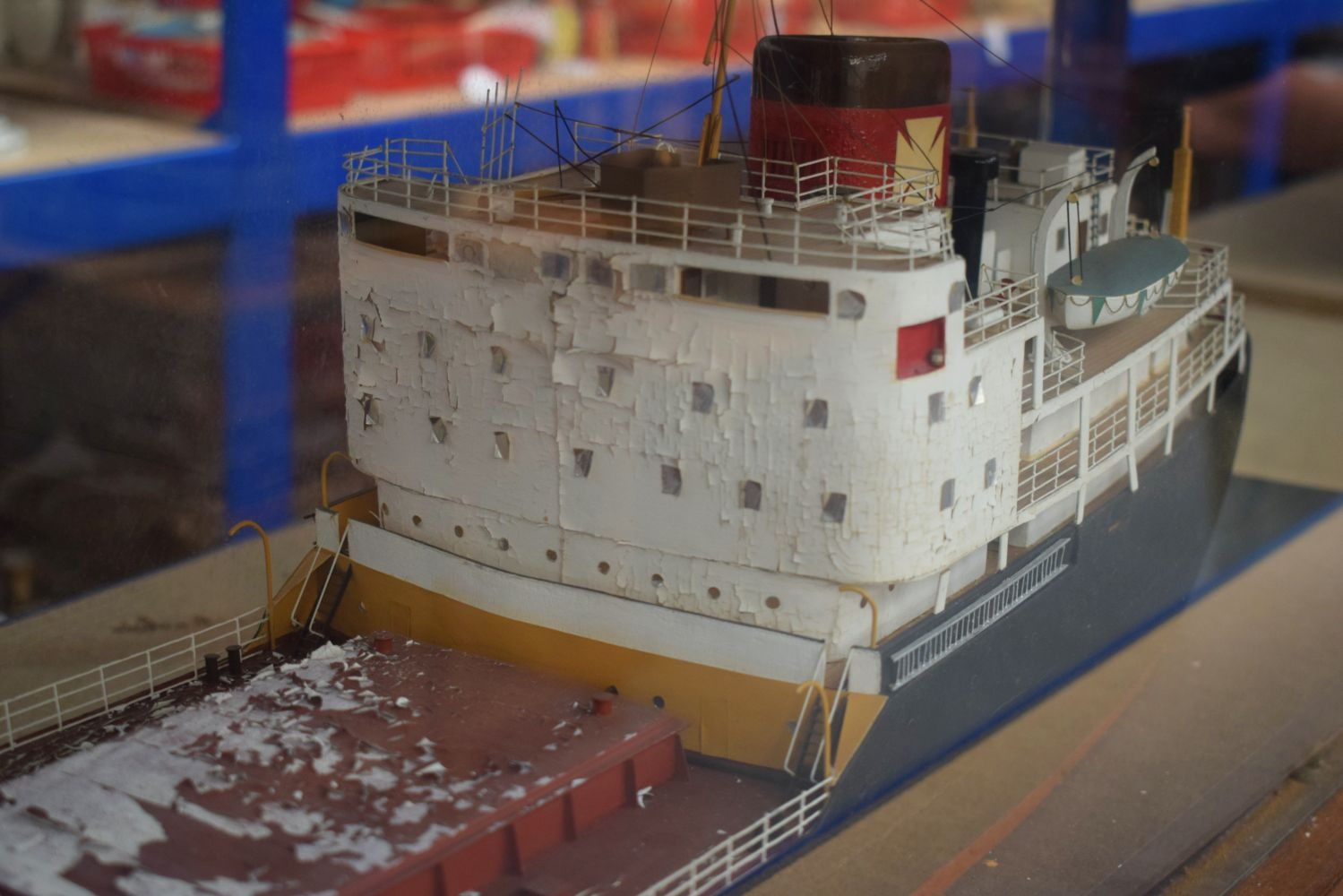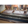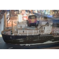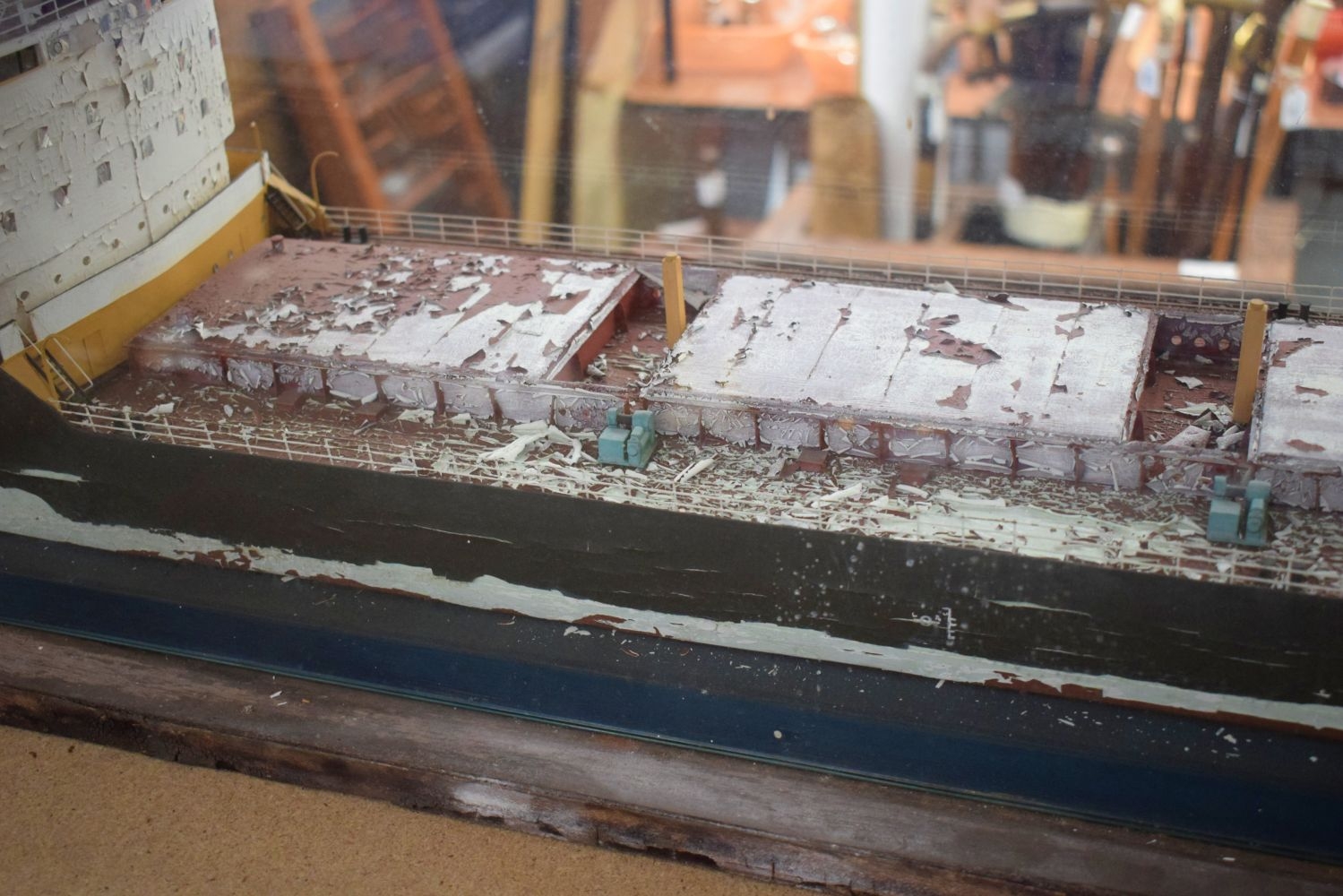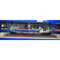 A VERY LARGE MID 20TH CENTURY PAINTED SCRATCH BUILT MODEL BOAT OF OREDIAN modelled upon a painted wooden plinth, within a glass dome. 150 cm x 35 cm.