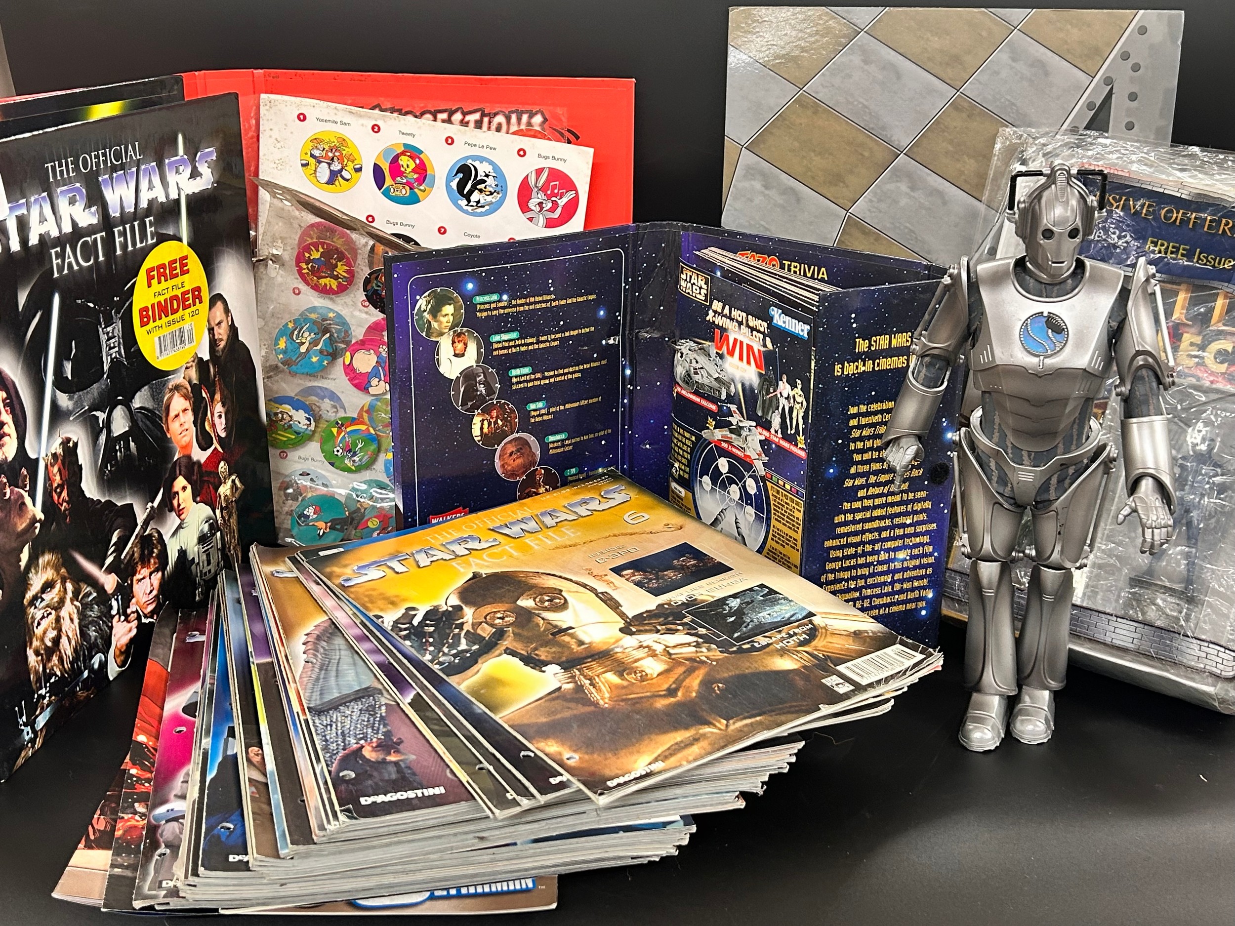 A collection of Star Wars Fact-File magazines and a Cyberman figure