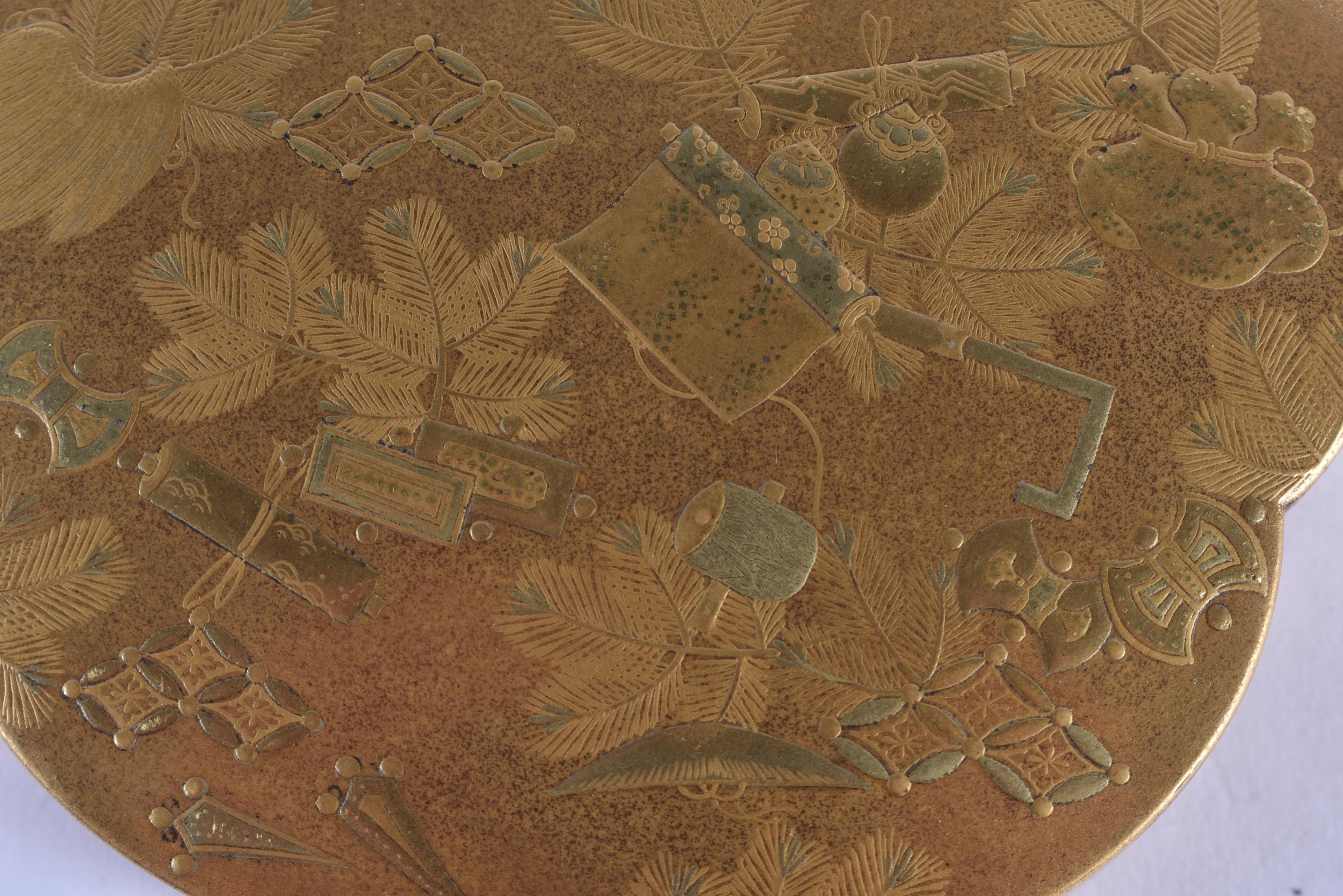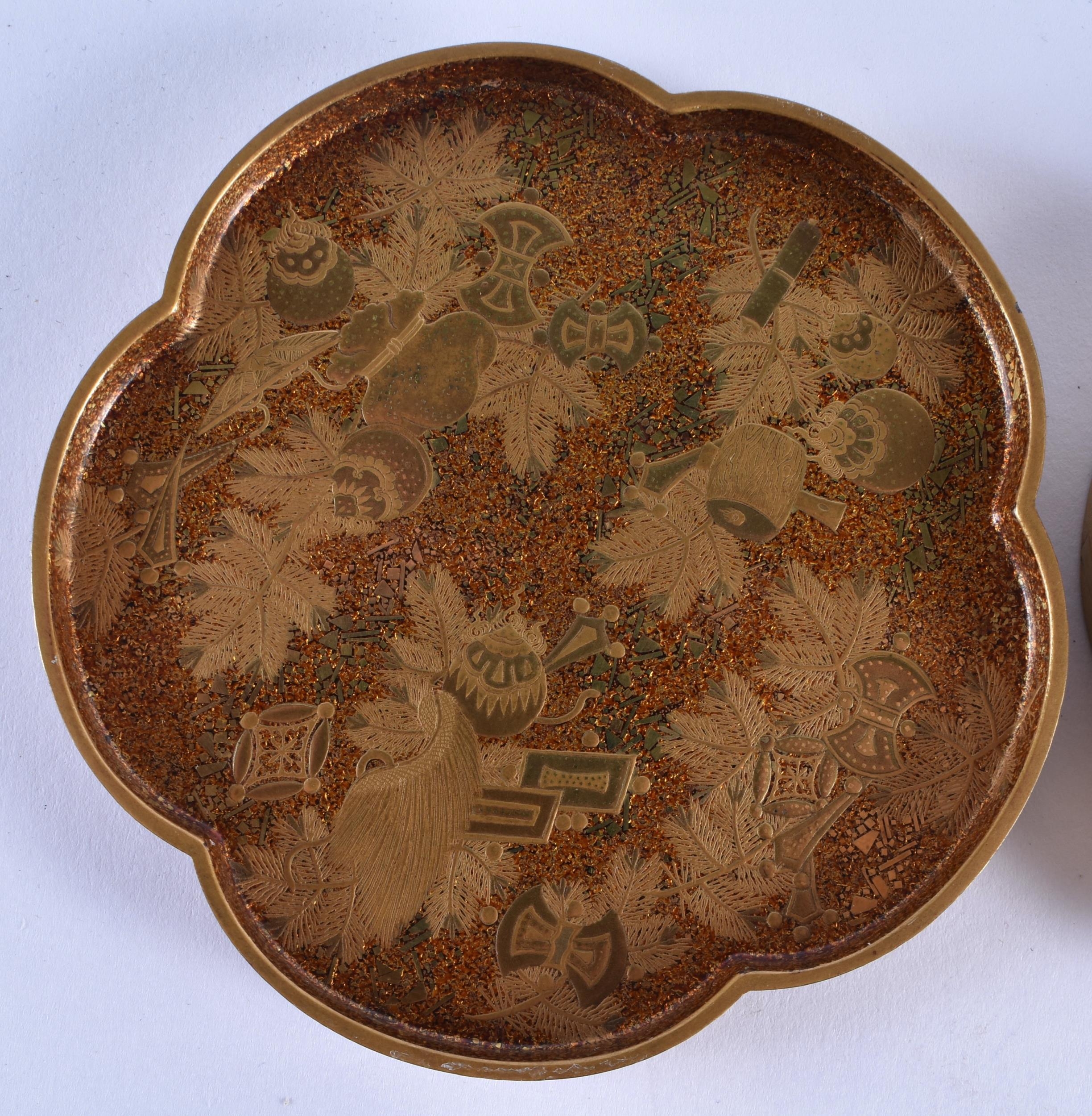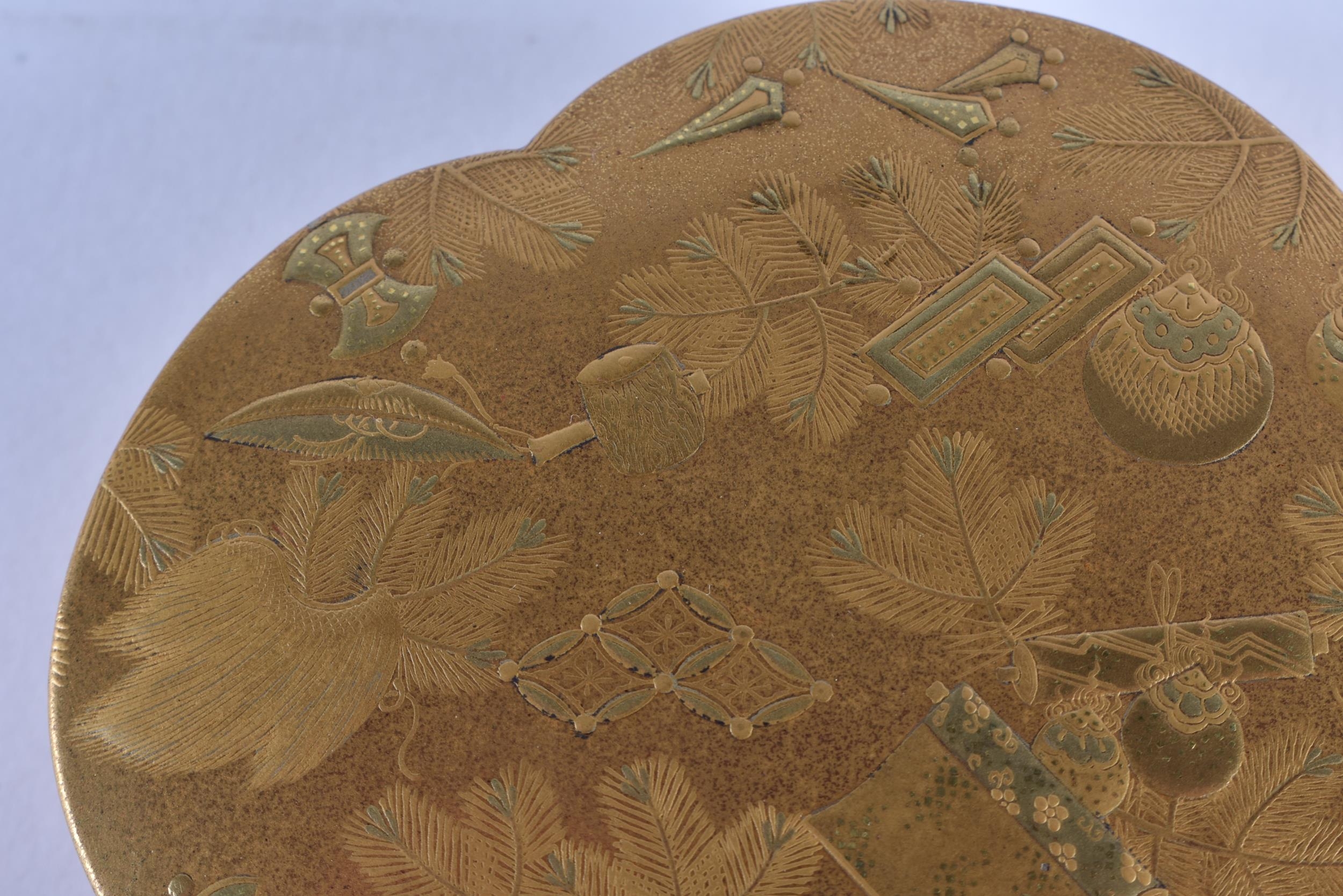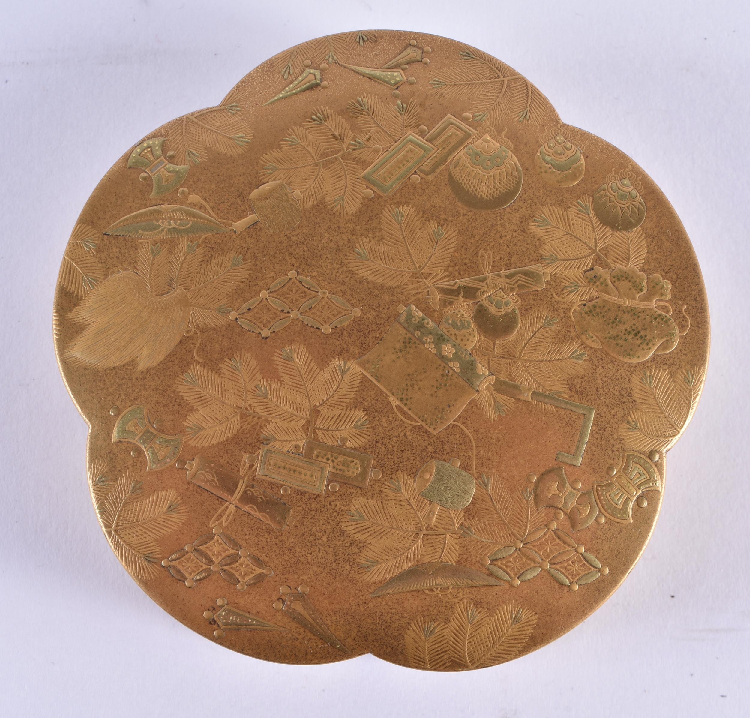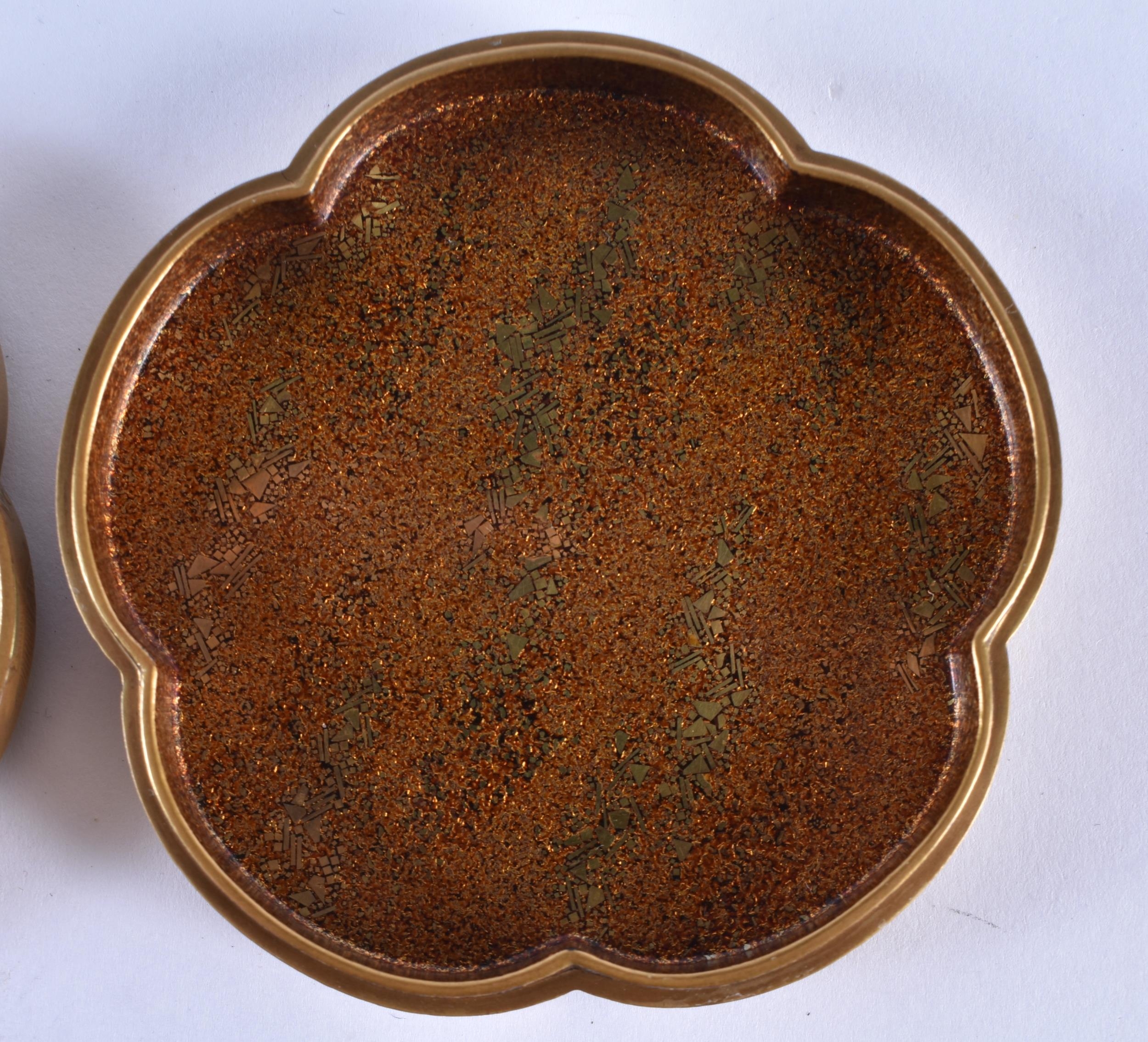 A LOVELY 19TH CENTURY JAPANESE MEIJI PERIOD GOLD LACQUER KOGO AND COVER of lobed shape, beautifully decorated inside and out with precious objects. 8 cm wide.