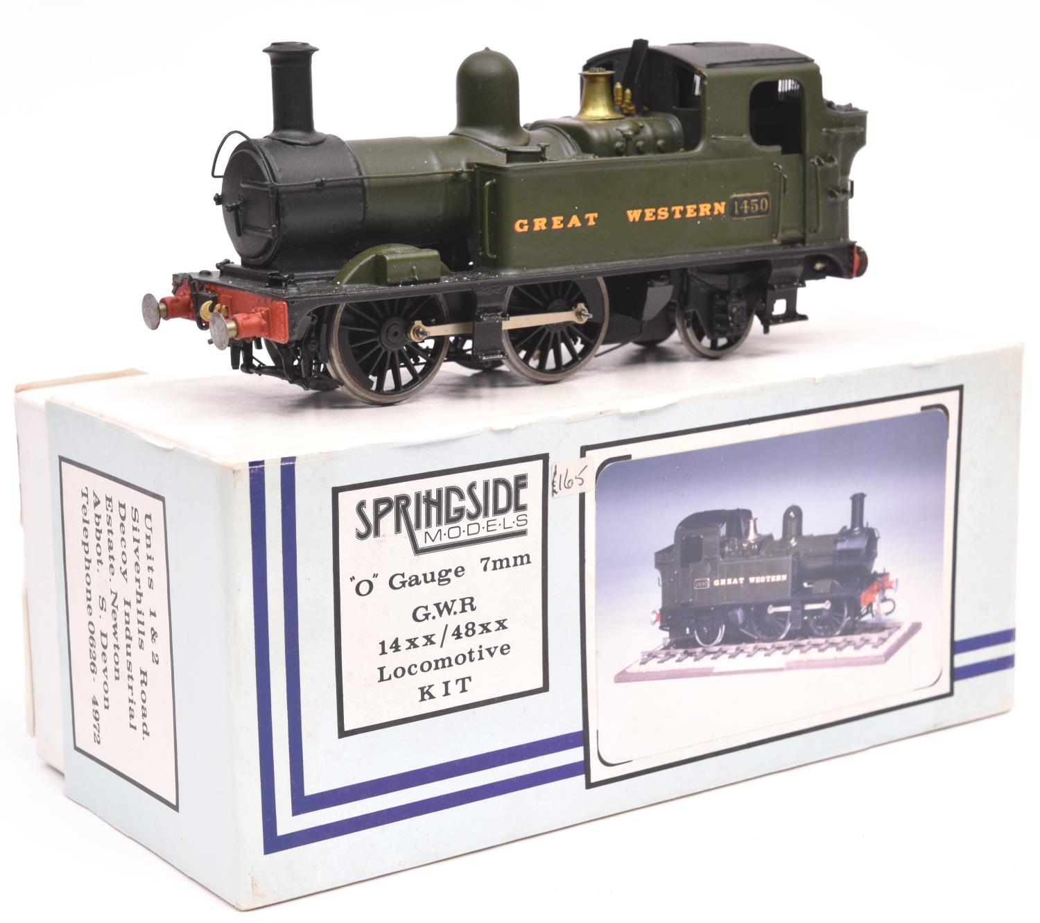 An O gauge Springside Models brass/white metal kitbuilt GWR Class 14xx 0-4-2T locomotive. 1450, in Brunswick Green livery. For 2 rail running. GC-VGC. £80-120