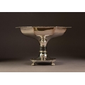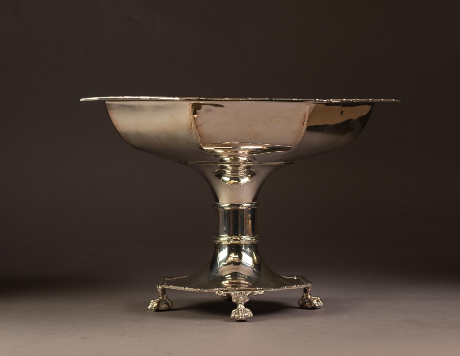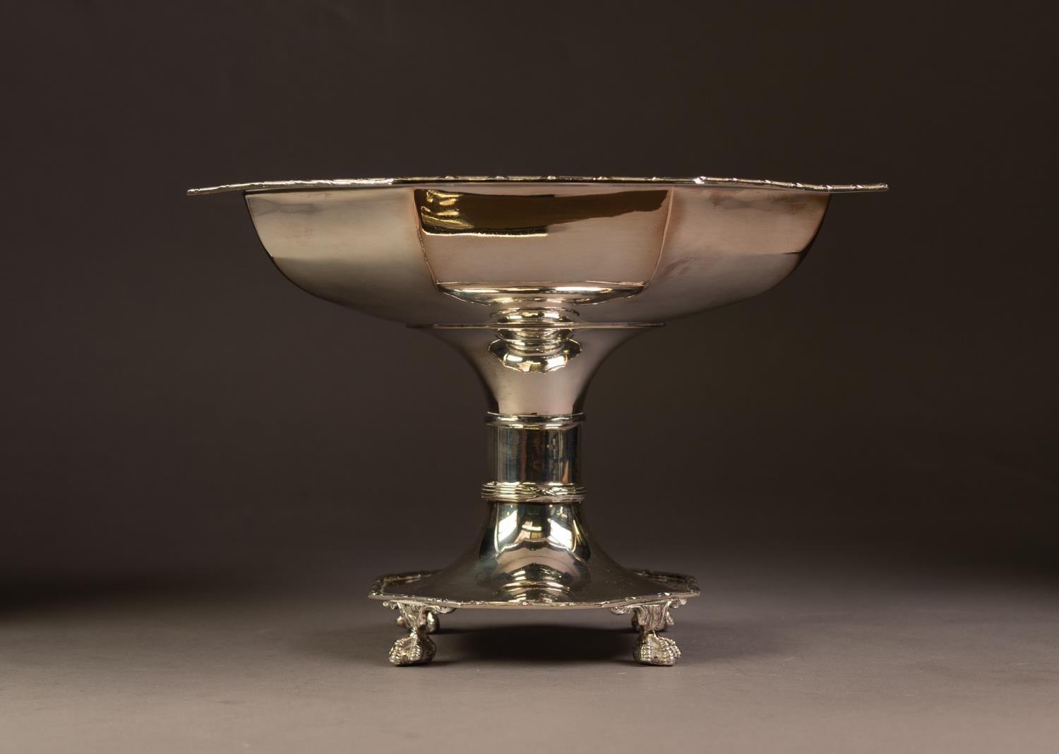 ELECTROPLATED PEDESTAL TABLE CENTRE FRUIT BOWL, of octagonal form with slender borders, short, cylindrical column and claw and ball feet, 7” (17.8cm) high, 10” (25.4cm) wide