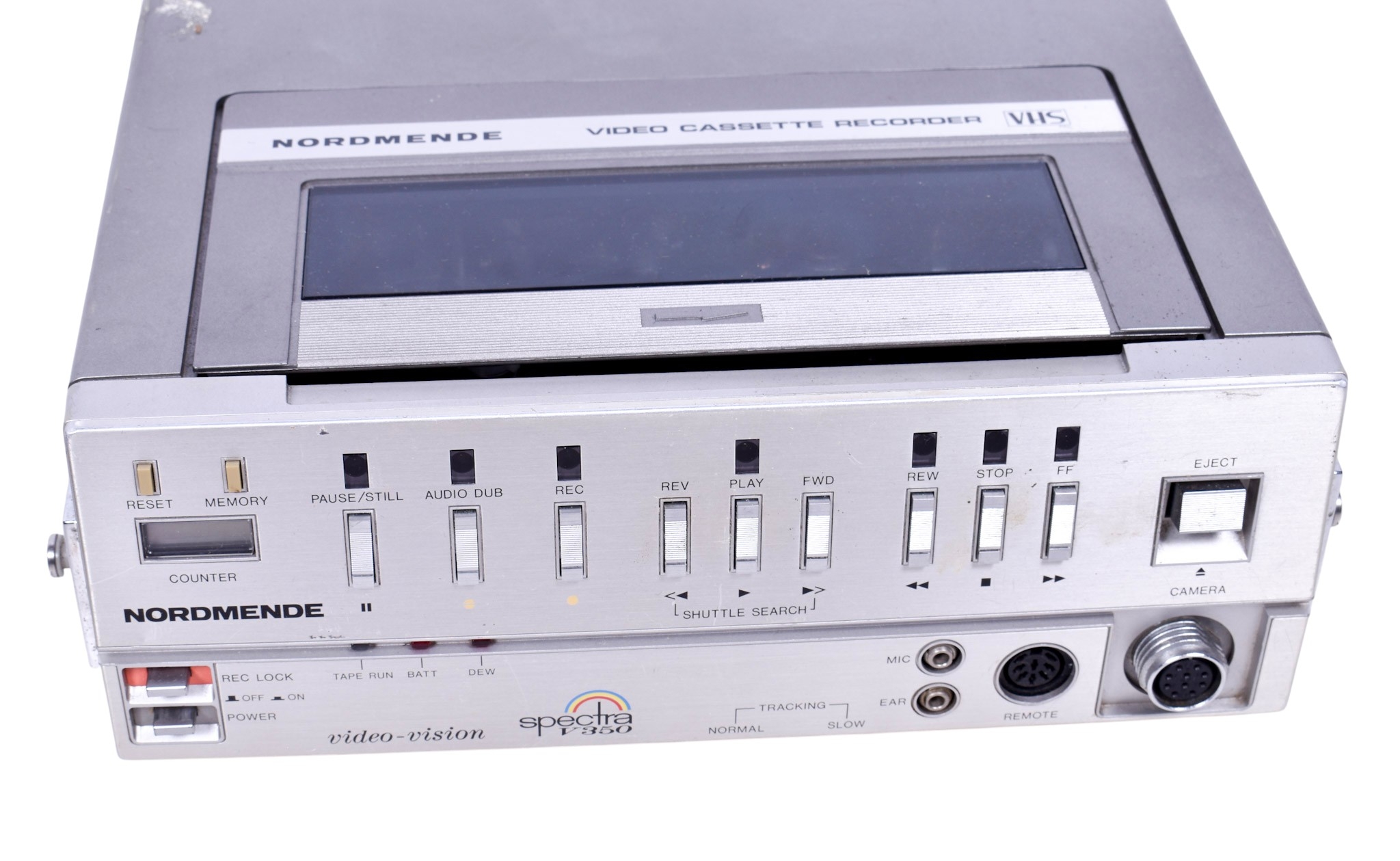 A vintage JVC video camera outfit. Including a GX-88E, s/n. 15650876 and two Nordmende VHS recorders, etc.