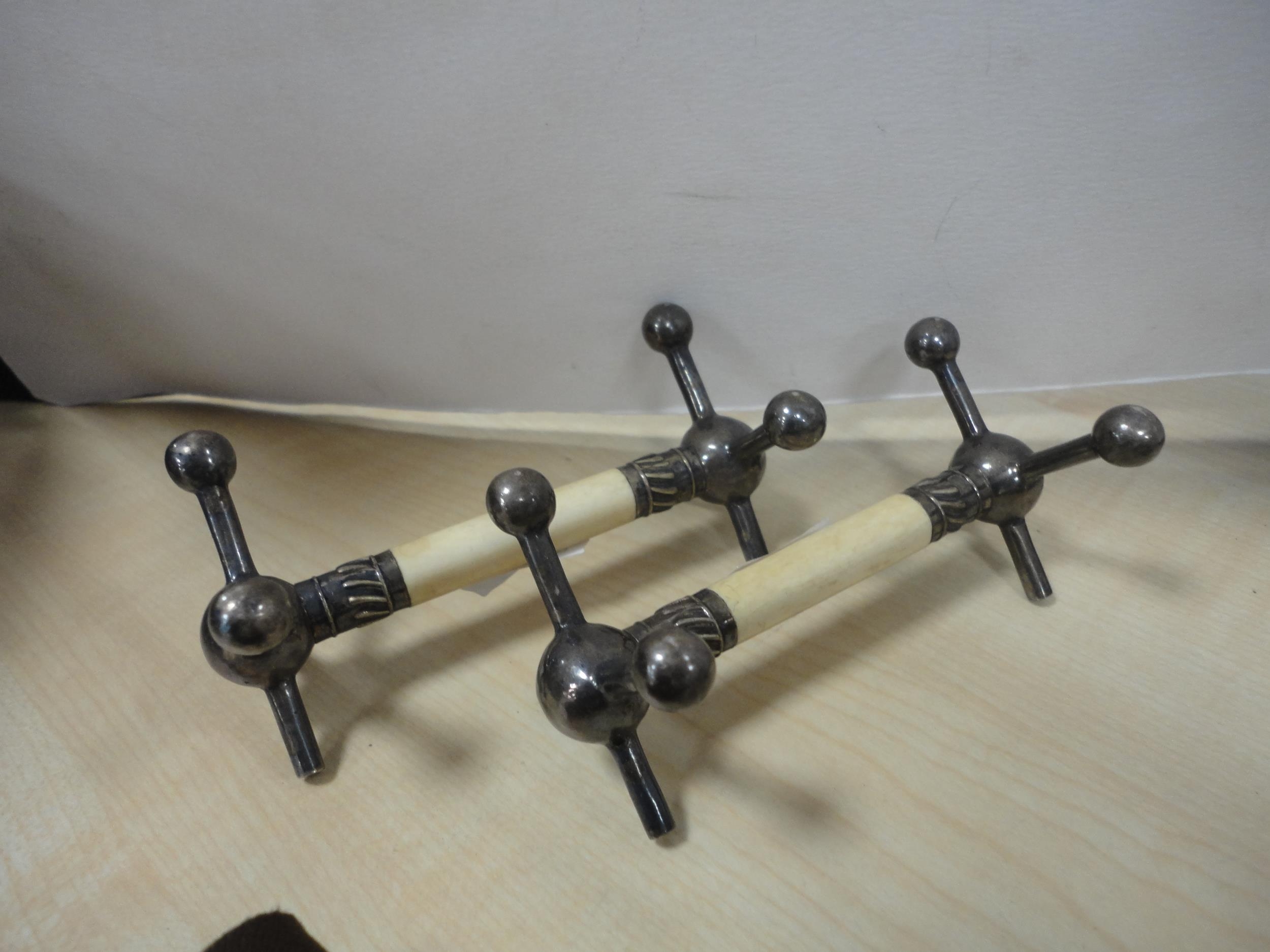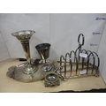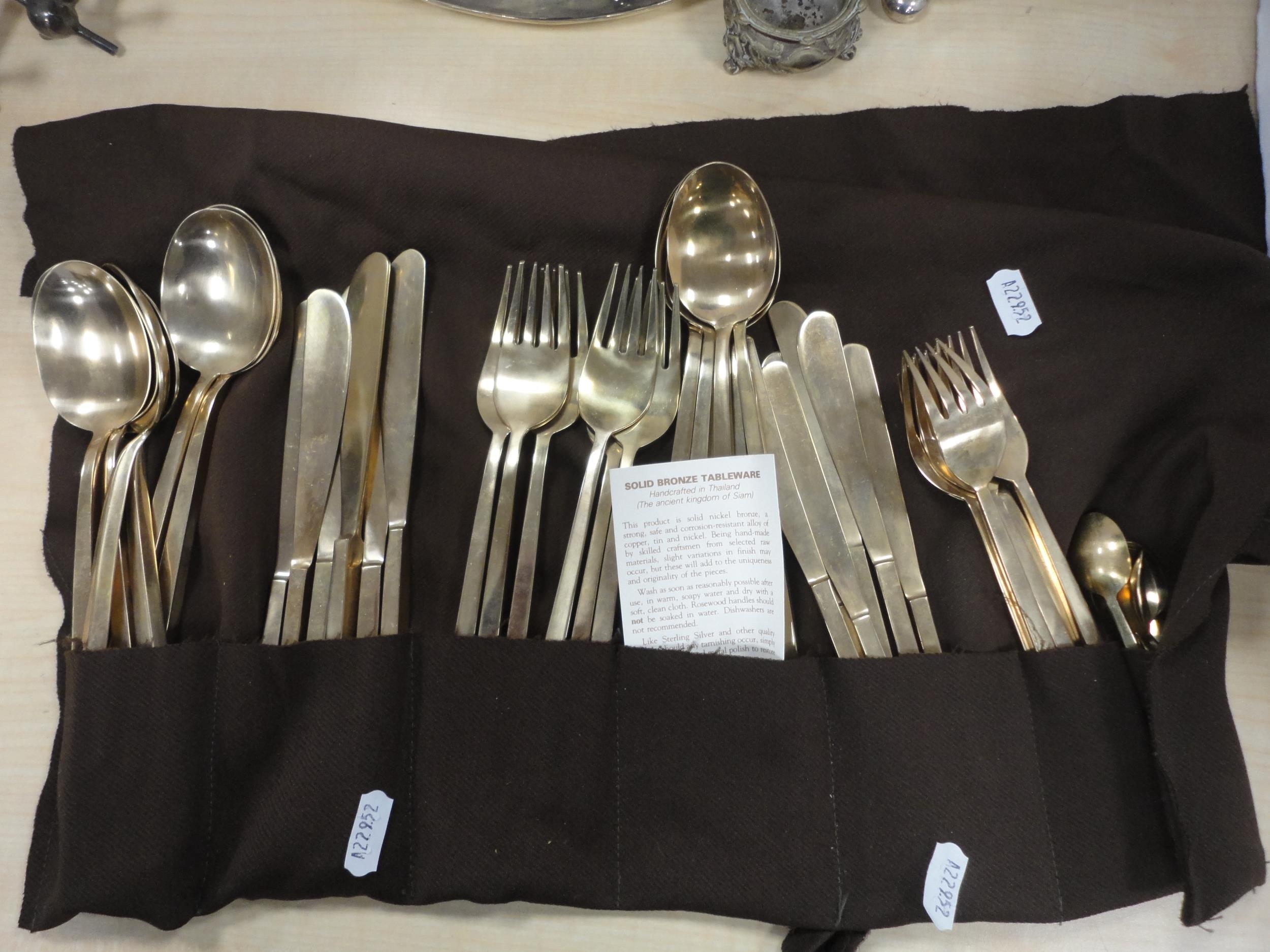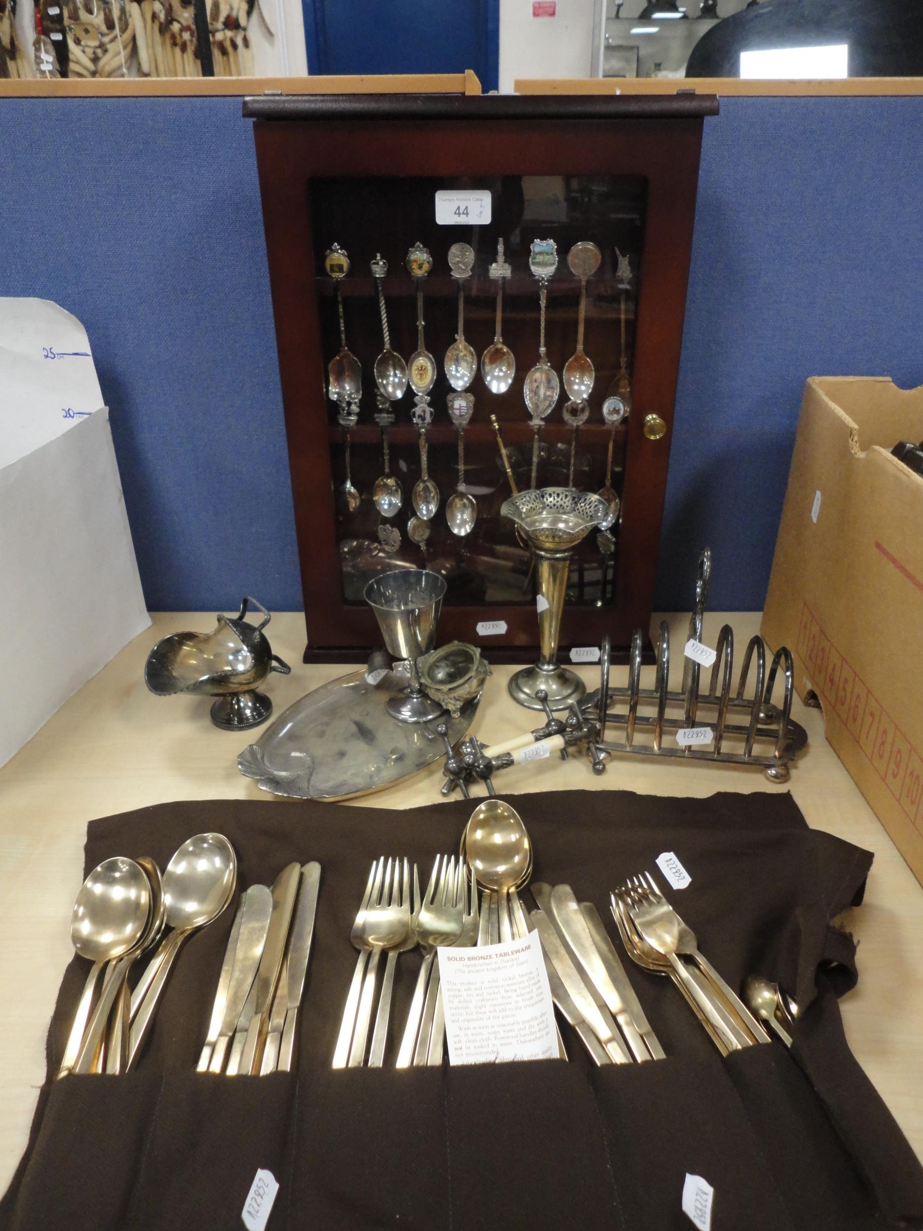 Collection of EP souvenir spoons in glazed wall display case, miscellaneous EP and plate to include Thai bronze-style cutlery, toast rack, sugar helmet, salt, goblet, tray, knife rests etc.