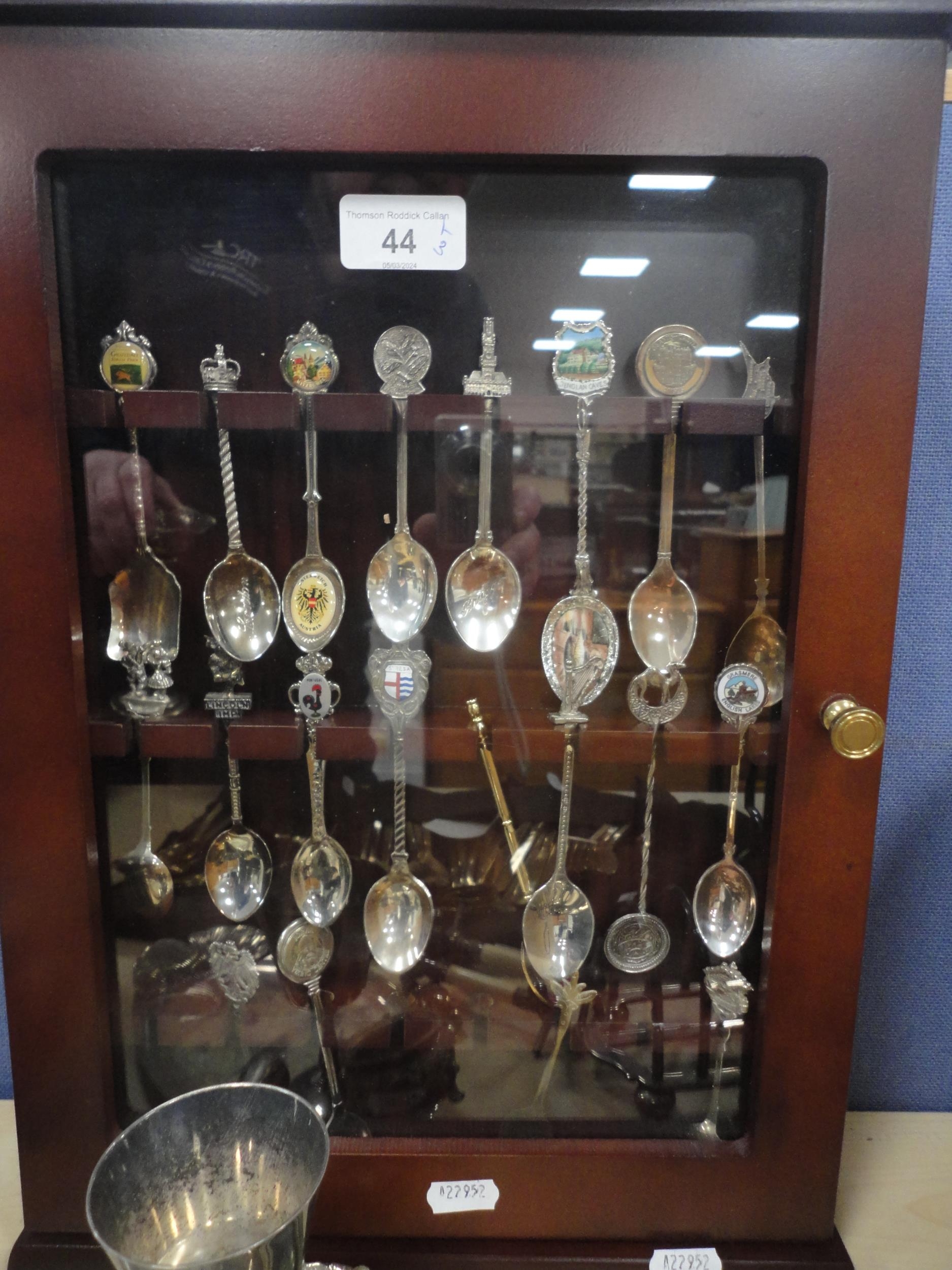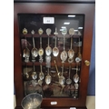 Collection of EP souvenir spoons in glazed wall display case...