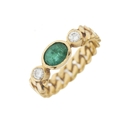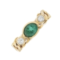An 18ct gold emerald and brilliant-cut diamond three-stone ring, with flat curb-link band, estimated total diamond weight 0.20ct, I-J colour, VS2-SI1 clarity, band stamped 750, ring size L, 3.9g