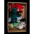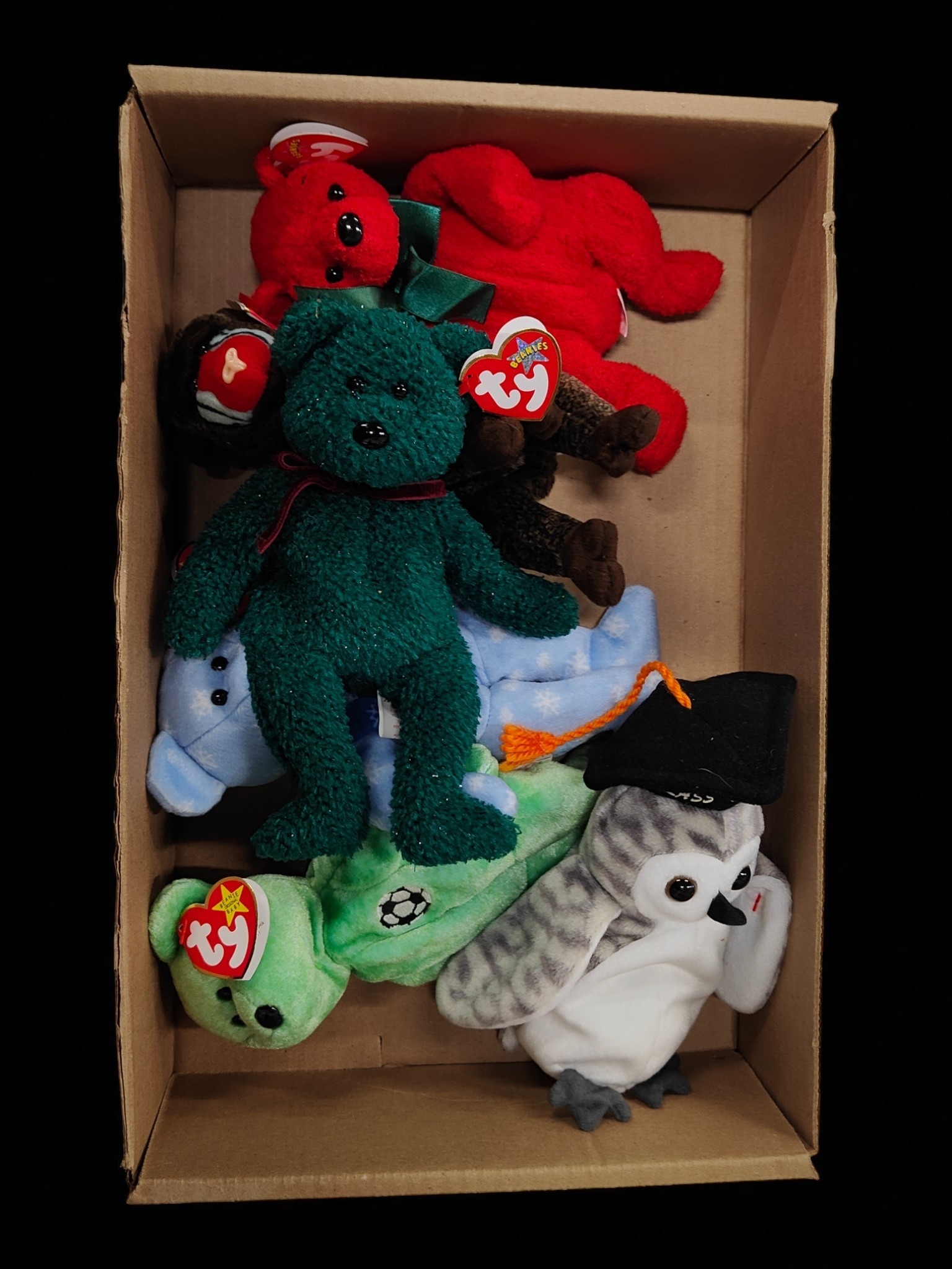LOT OF ORIGNAL BEANIE BABYS TO INCLUDE ISSY FOUR SEASONS 2001 , HOLIDAY TEDDY. 1999 HOLIDAY TEDDY, WISER OWL 1999, CHEEKS 1999 ALL MINT WITH TAGS