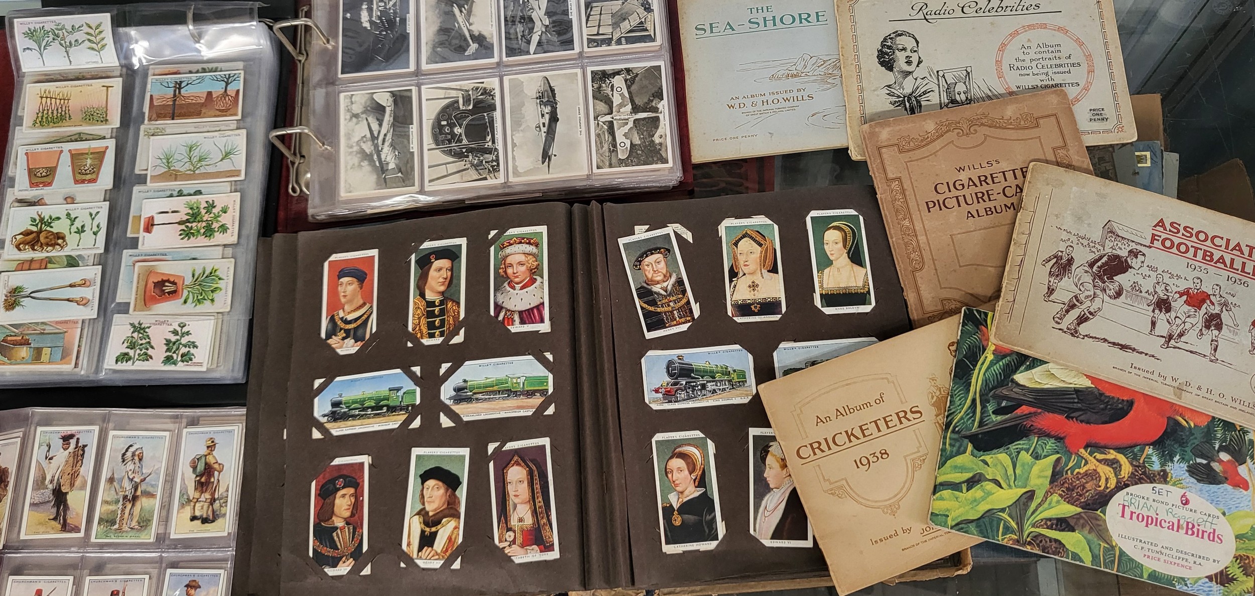 An extensive collection of cigarette cards including Associate Footballers 1935-1936, Tropical Birds, Cricketers 1928, Radio Celebrities, The Sea-Shore all in pamphlet folders, and four folders with topics including military, trains, King and Queens of Europe, flowers, counties, sport, etc.