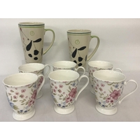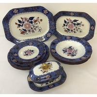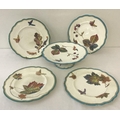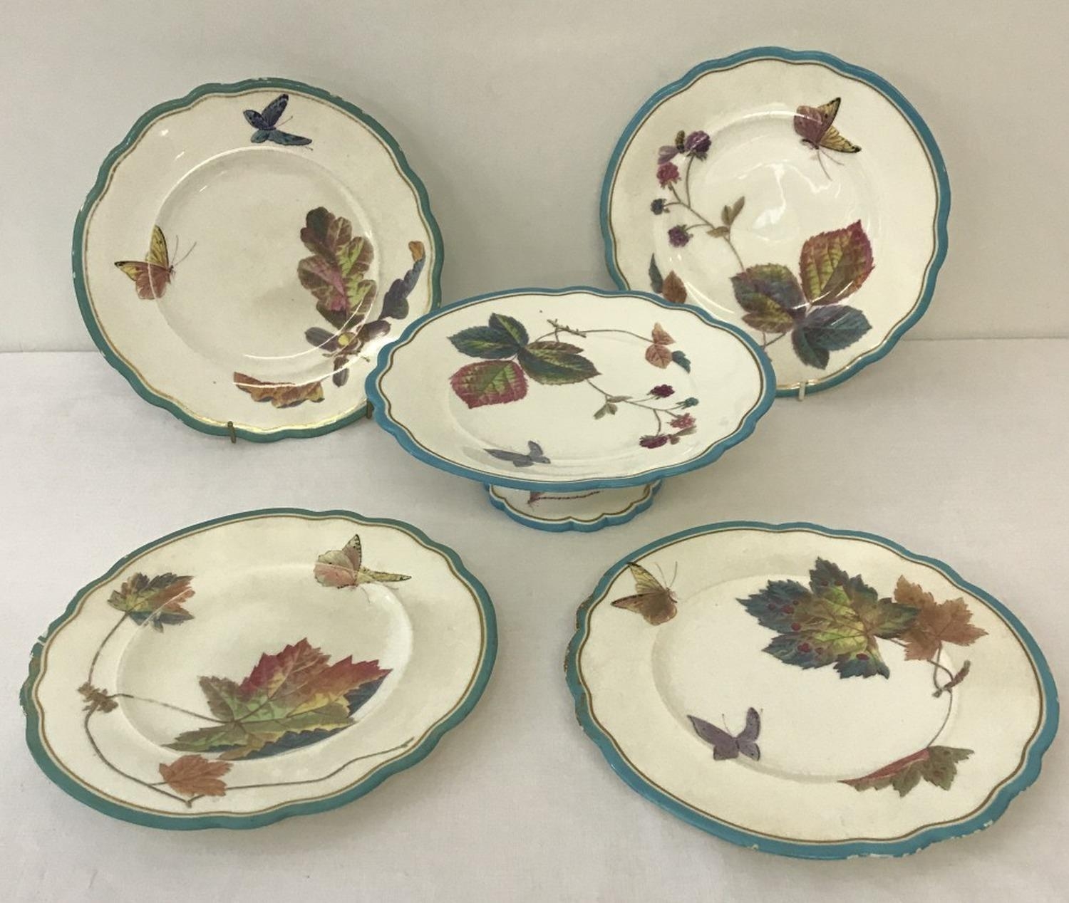 A Victorian Powell & Bishop "Trentham" pattern footed cake stand together with 4 matching plates. Circa 1876, curved shaped edges with blue and gilt rim. Each piece decorated with a different autumnal leaf and butterfly design.