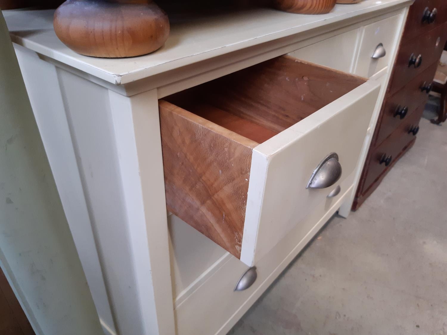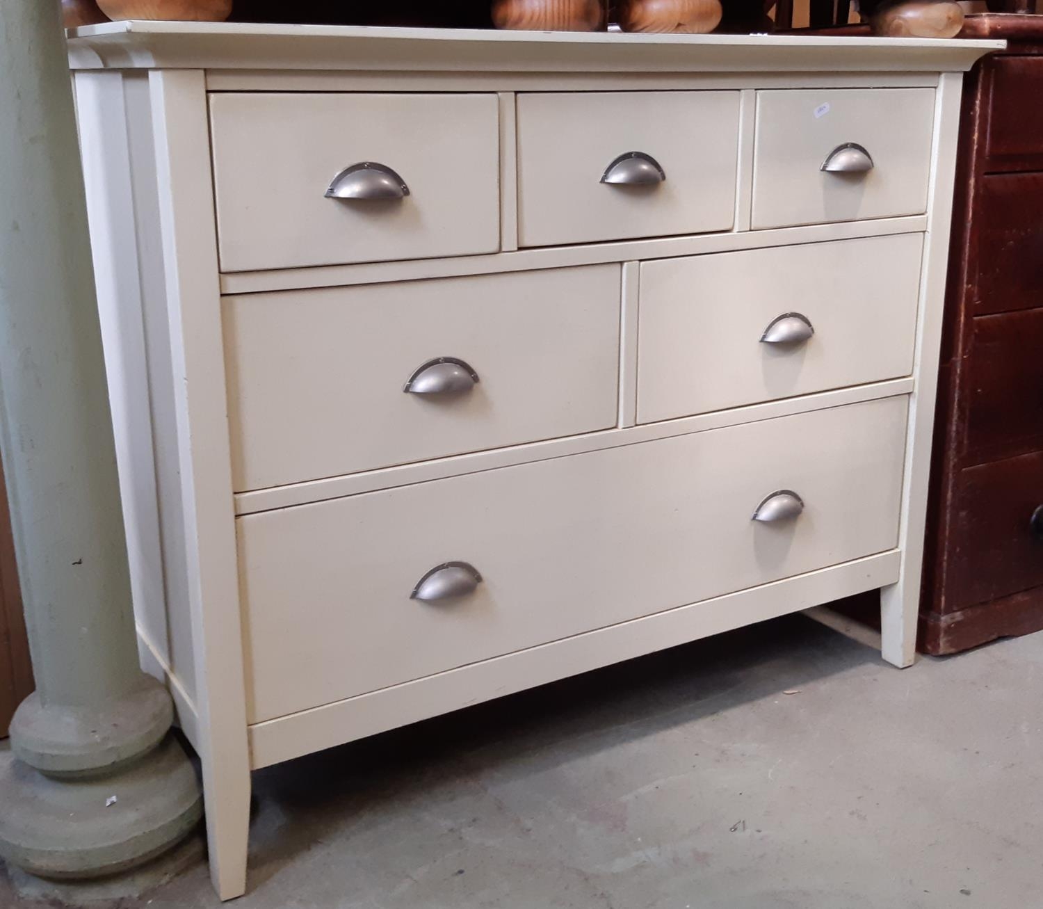 A contemporary painted chest by John Lewis fitted with an arrangement of one long and two medium and three short drawers, within a painted frame, 111cm long