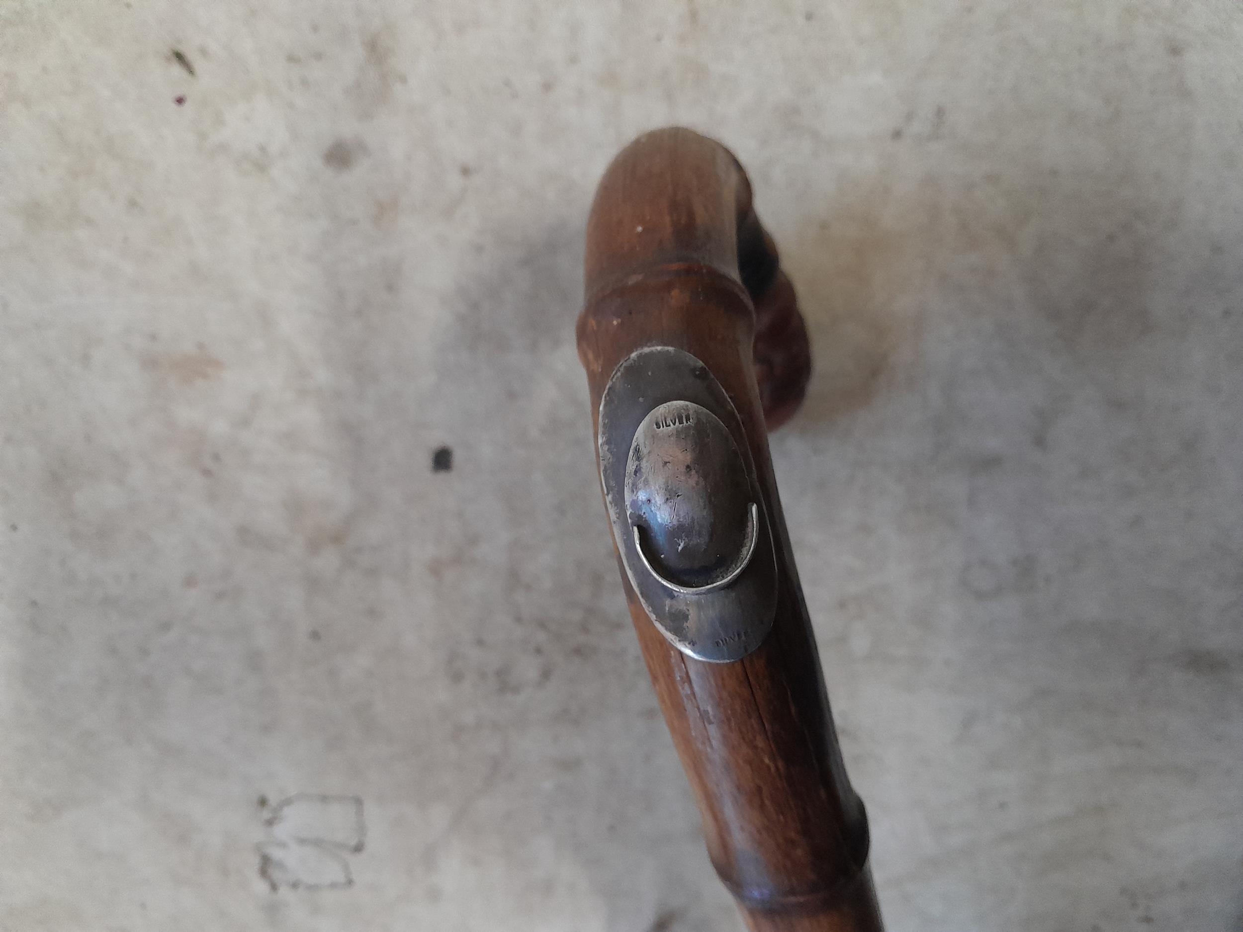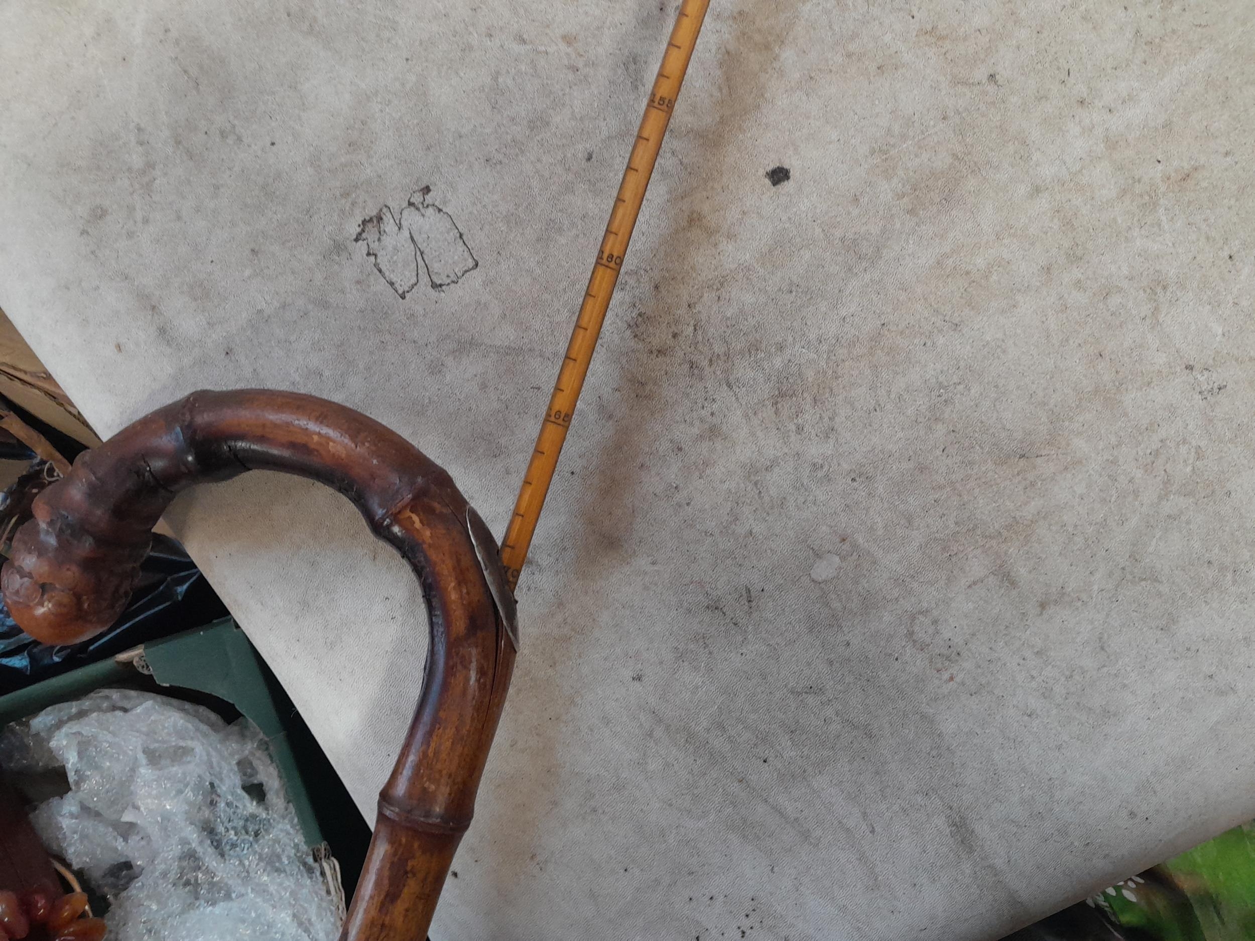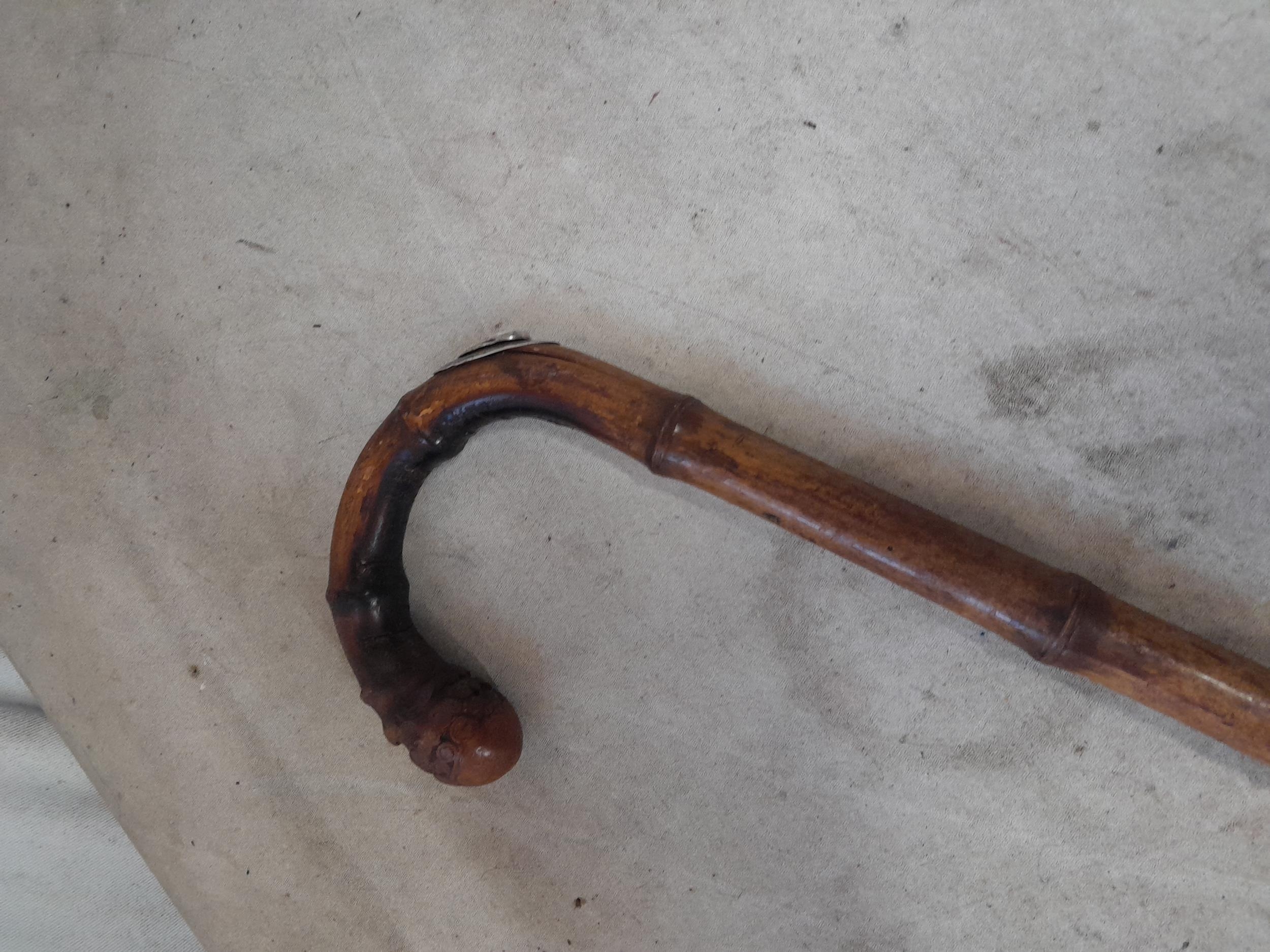 Early 20th century bamboo walking stick with silver button with press down release to reveal boxwood horse measuring cane