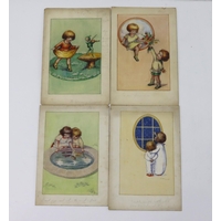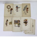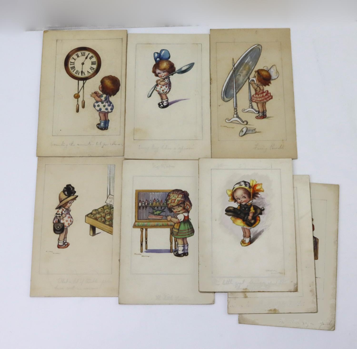 Flora White (20th century) original artwork for postcards, on board, Little organ grinder, Here's a bunch, This little girl, Little fortune teller, What a lot of trouble, Facing powder, Every boy & Counting the minutes, approx. 11cm x 18cm. (8)