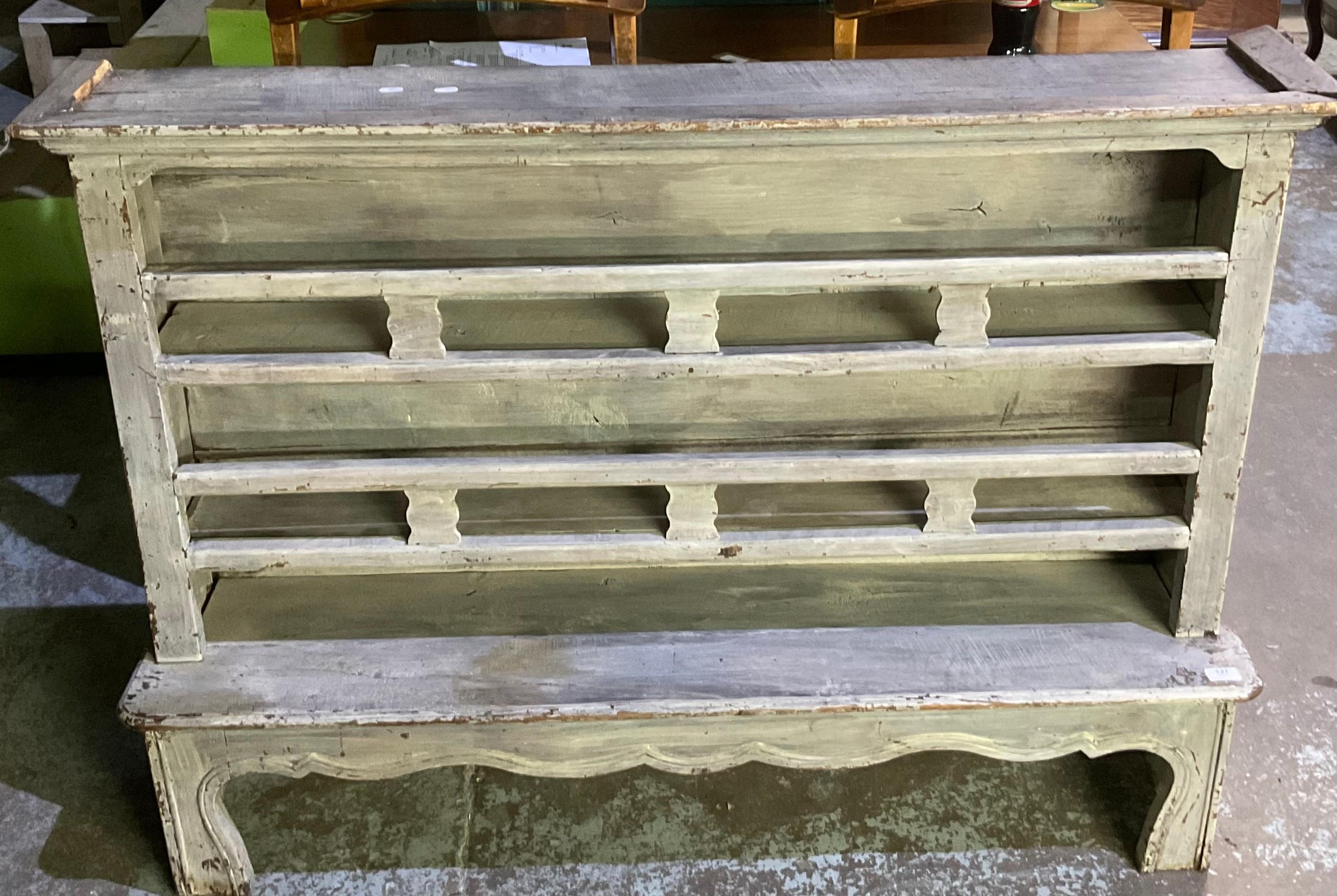 19th century continental painted pine dresser top with two open shelves over open wider open shelf and shaped apron. W132cm x H99cm