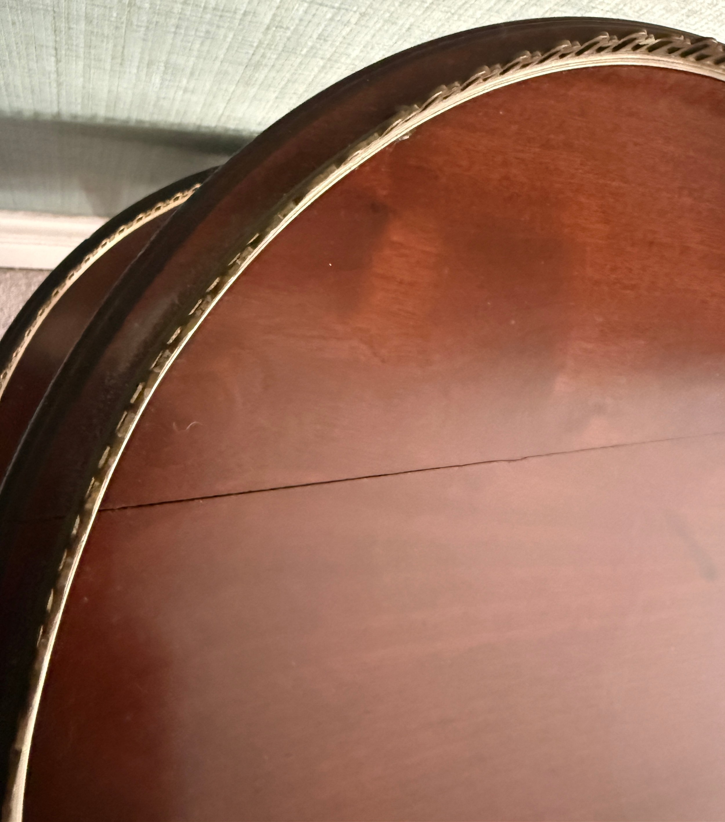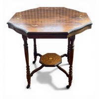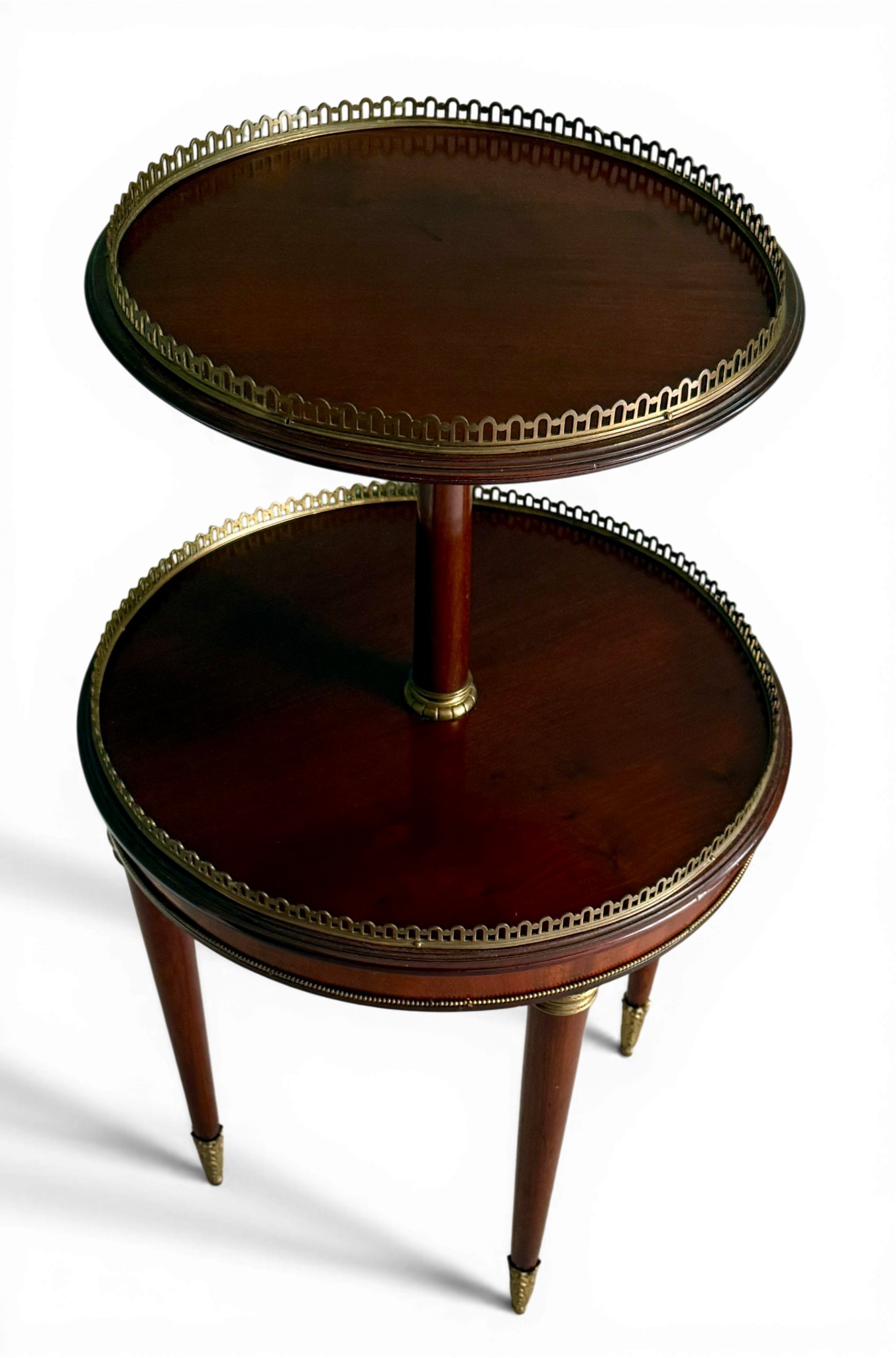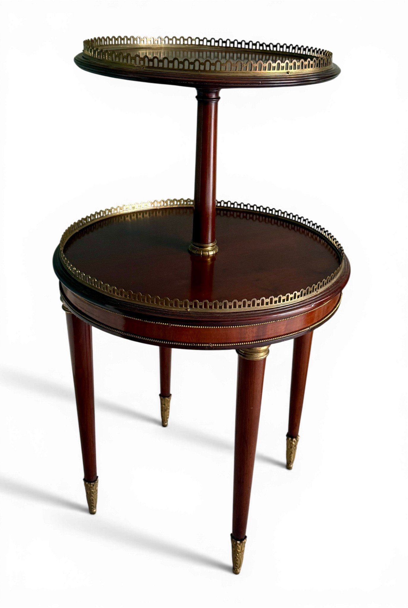A 20thC mahogany two tier table with gilt metal mounts. 50 d x 85cm h.